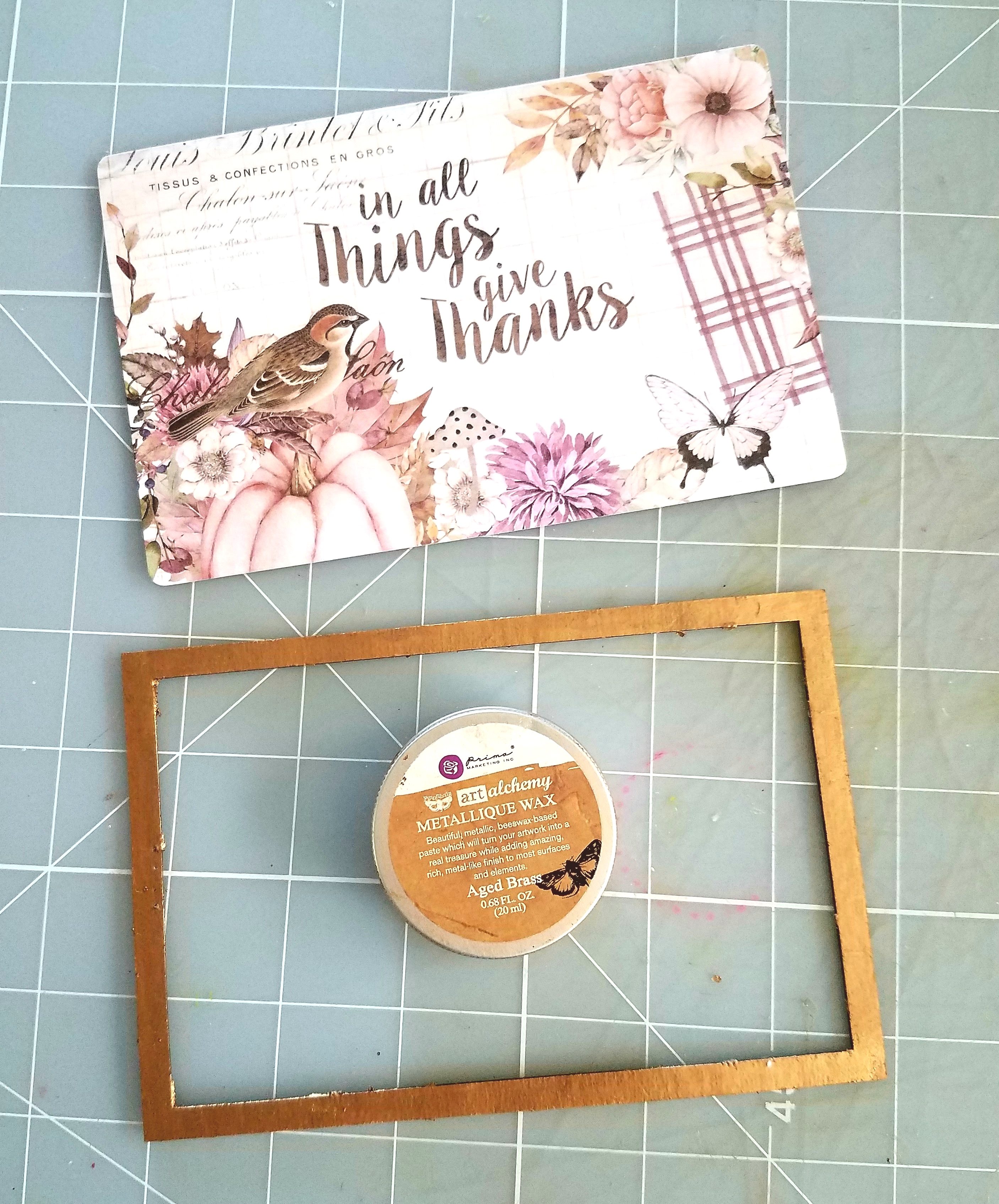From my stash, I took one of the Clear Scraps chipboard frames that was leftover from my chipboard pieces. I rubbed some metallic wax with my finger, over the top of my chipboard frame piece. This gives it a nice metallic shine. Then I took one of the journaling cards from the collection, and glued it to the back of my chipboard frame.