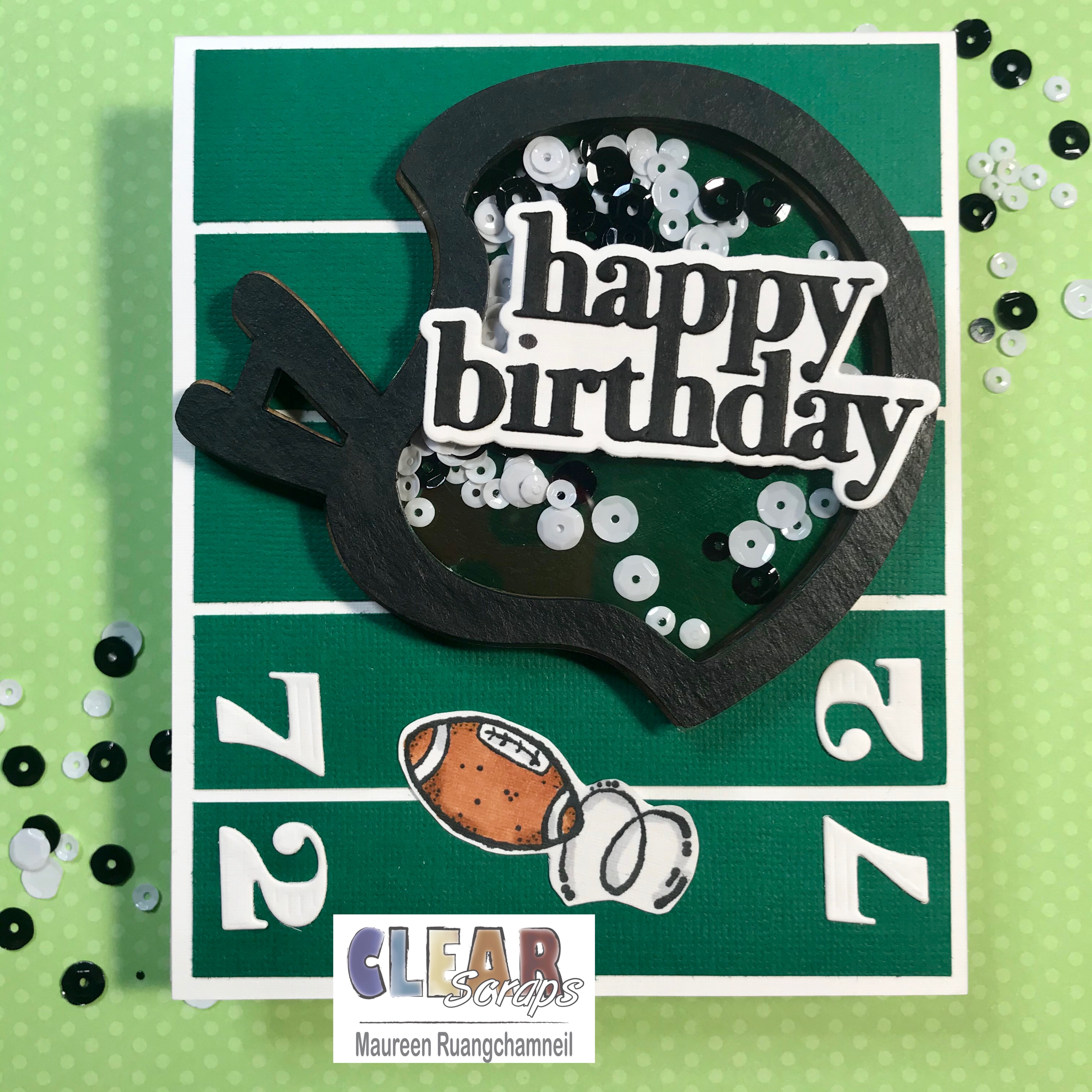 Additional supplies: black paint, green card stock, metallic green card stock, happy birthday die cut, number dies, black and white card stock, football stamp.
