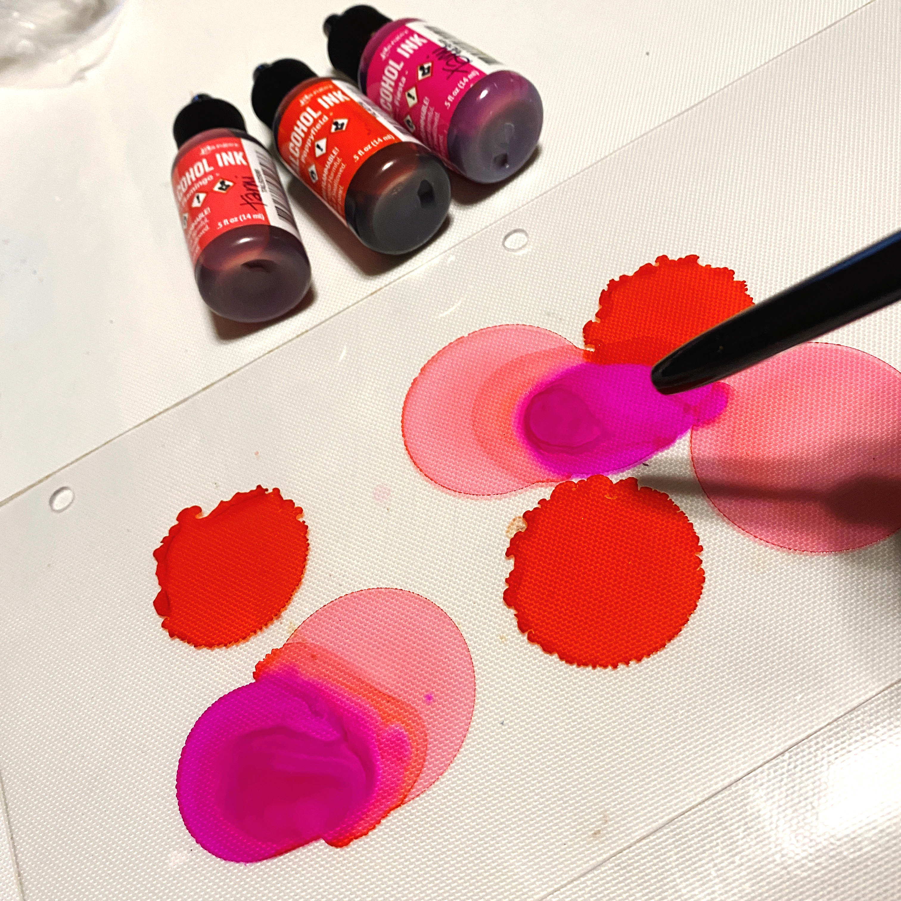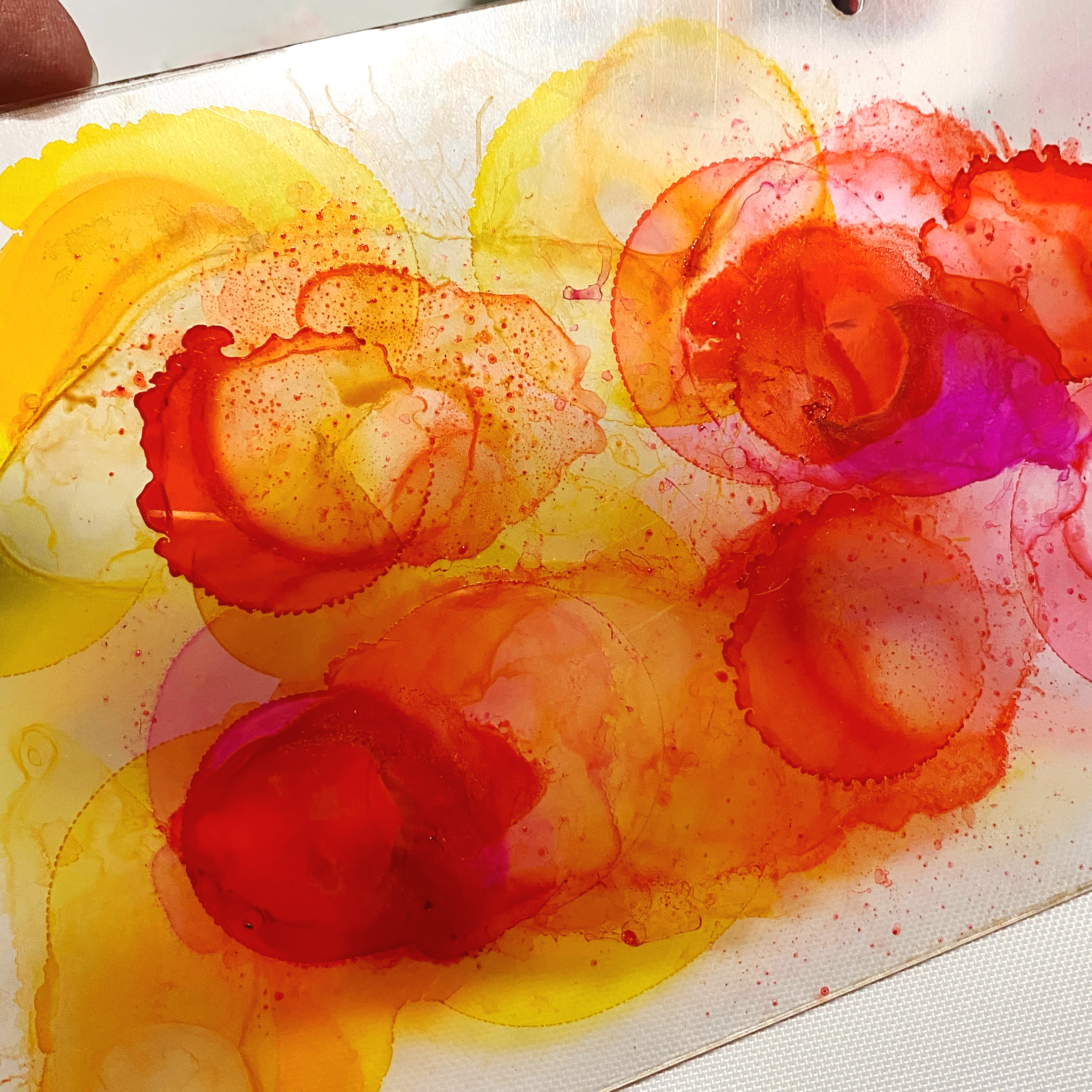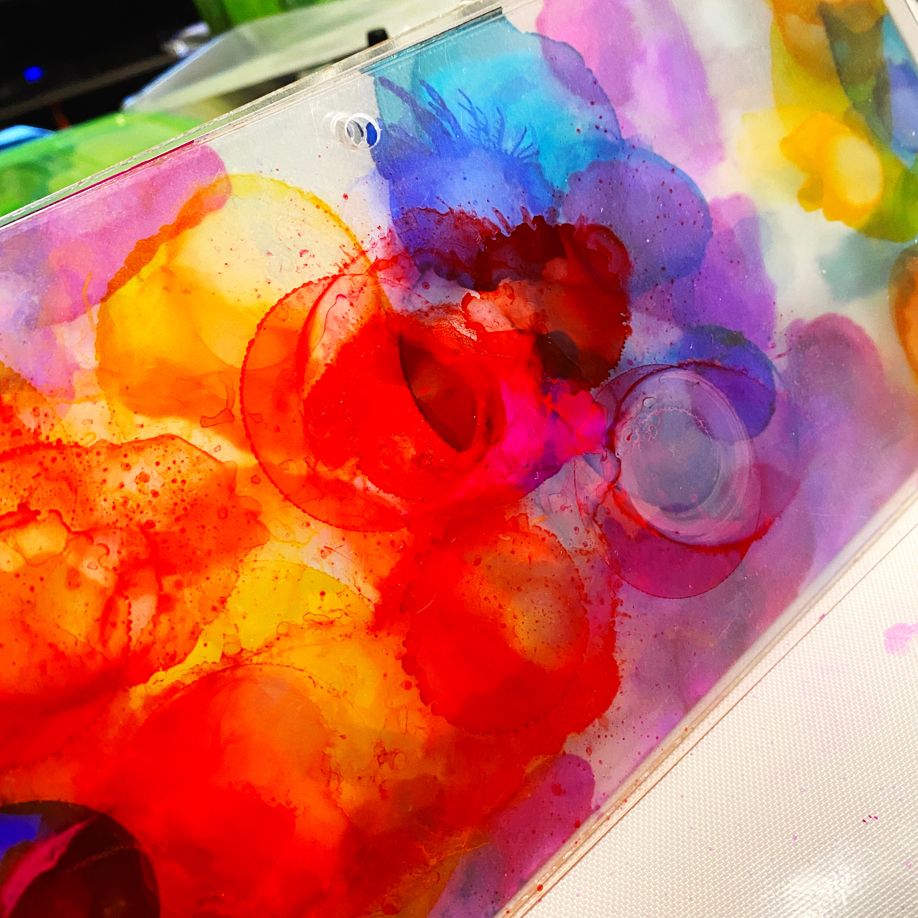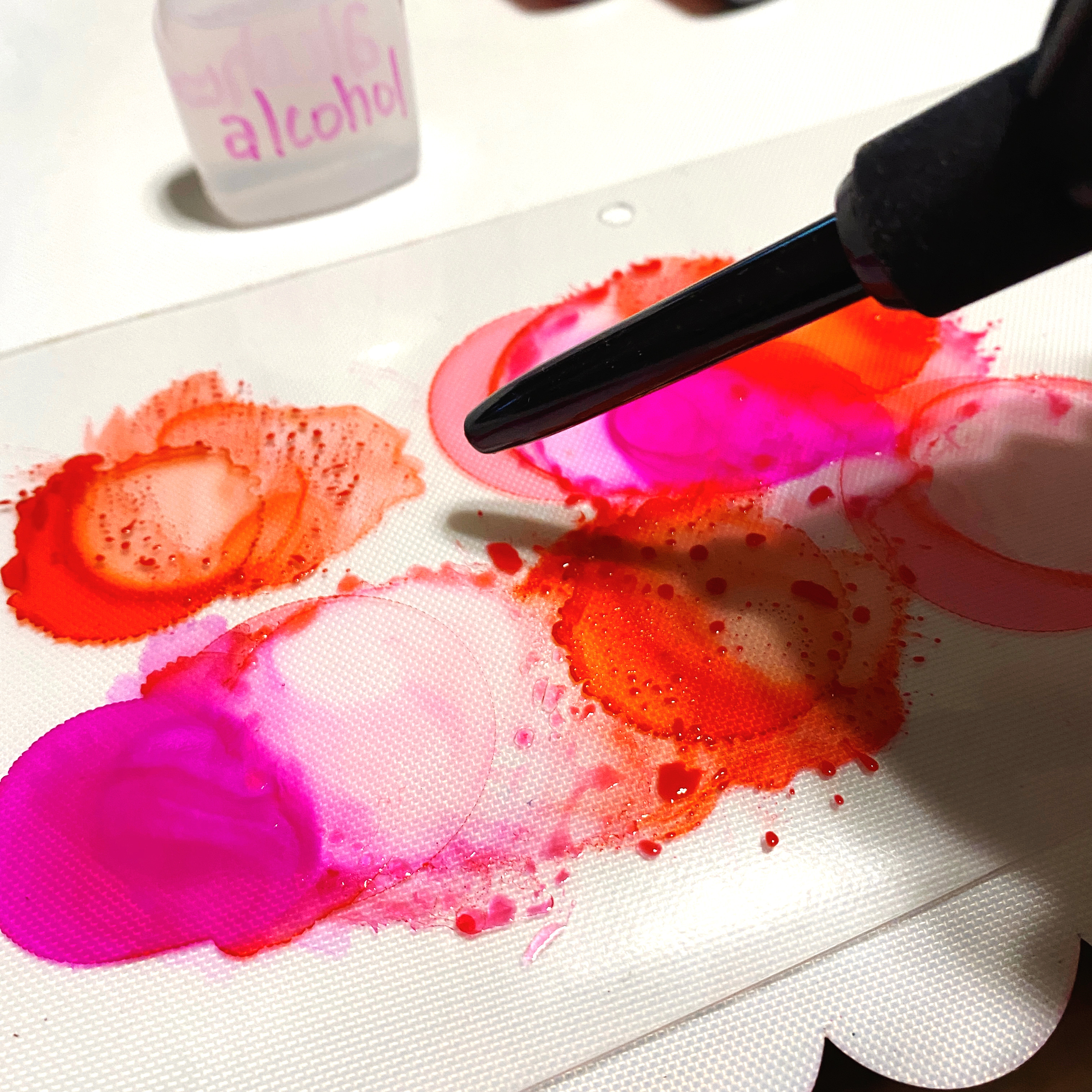 I wanted a little more blending and runs, so I added drops of alcohol and again tilted and blew on the inks…