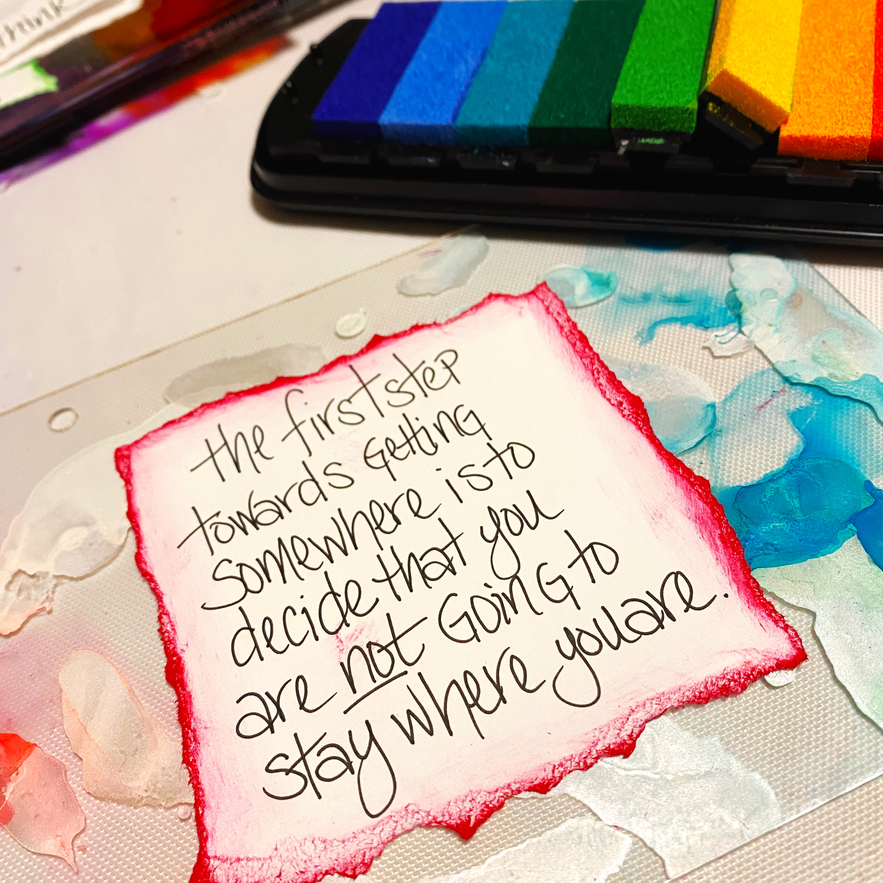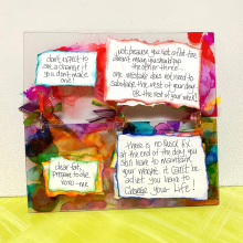 Next I started planning out my quotes and writing them on white cardstock. I adhered the pieces back to back on opposite sides of the pages. I only placed glue at the centers. I also inked the backside of the papers so that if any portion showed from the other side it looked like a mat…