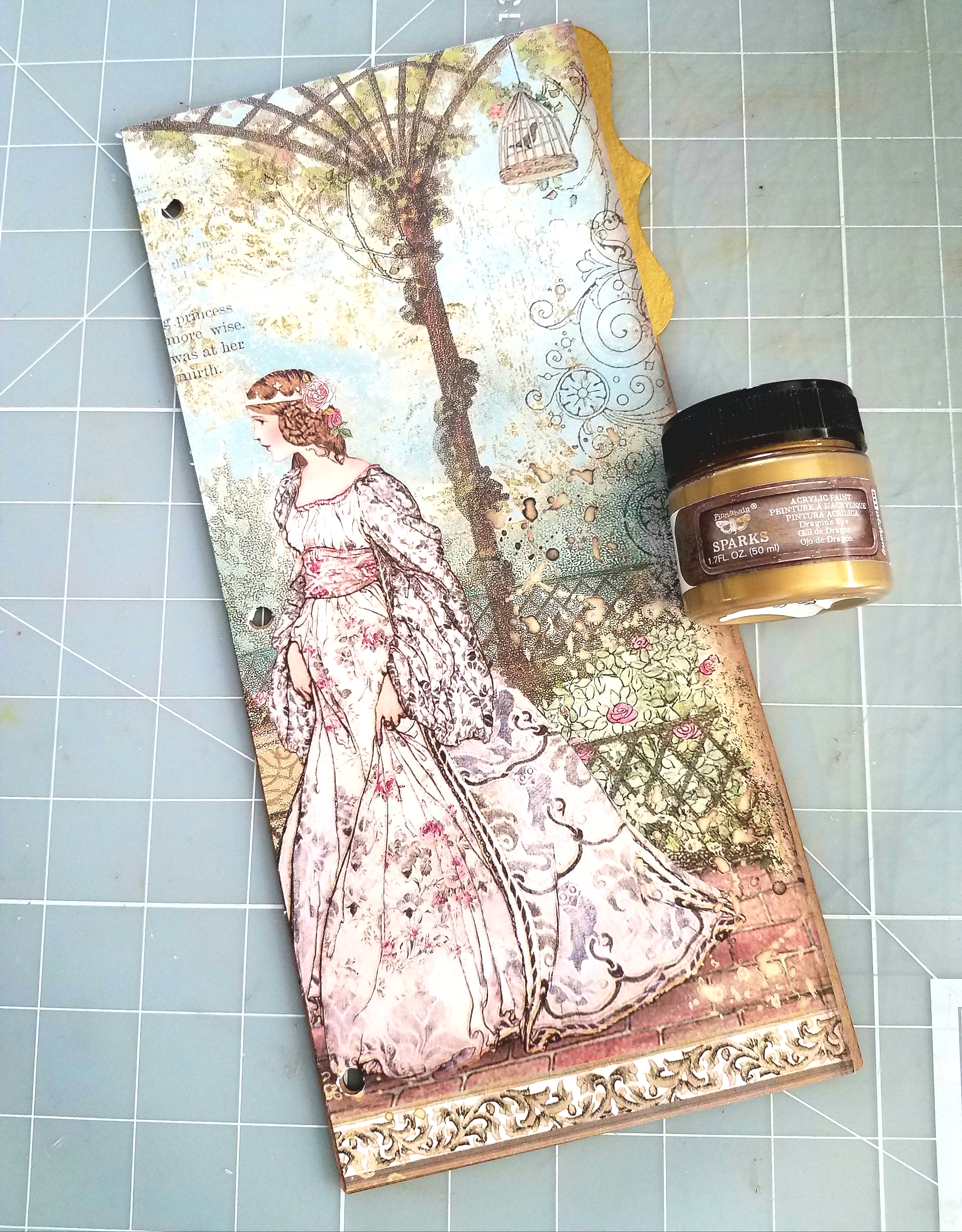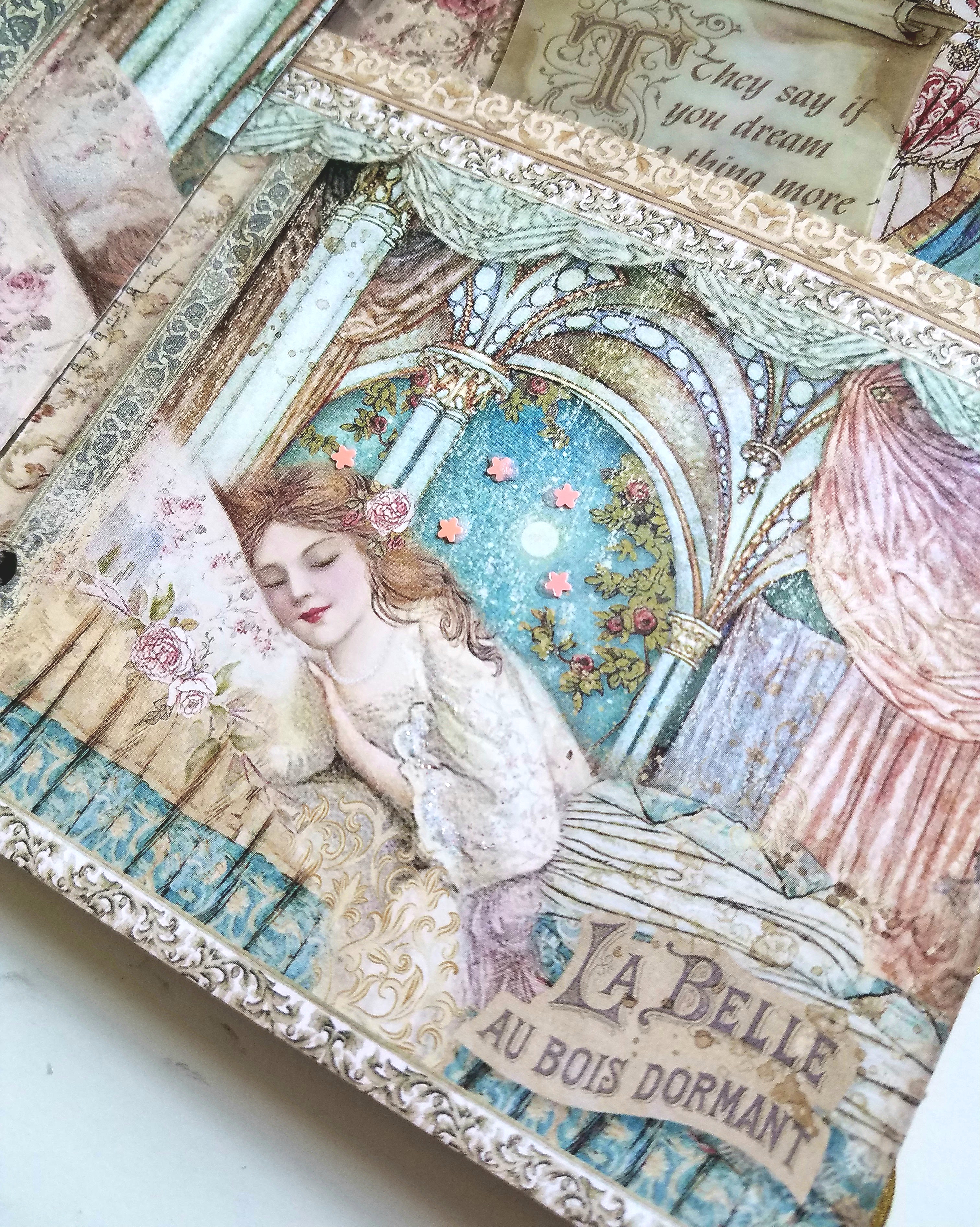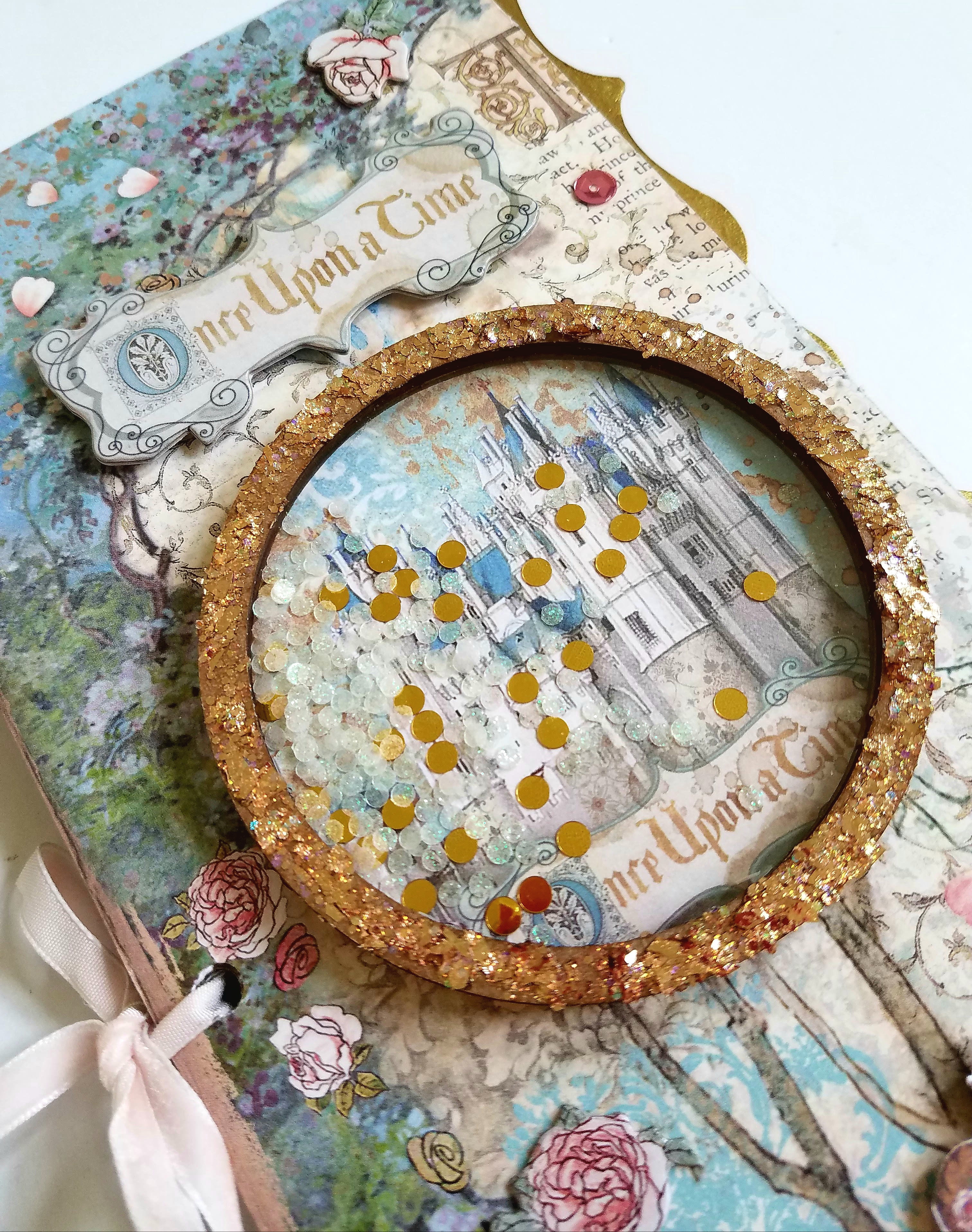 Other Supplies used: Finnibair Sparks paint- Dragon's Eye, Stamperia Sleeping Beauty collection, foam dots, Glitteriffic Gold glitter, paintbrush, scoring board, Beacon 3 in 1 glue, crystal gem, confetti in clear and gold, sequins.