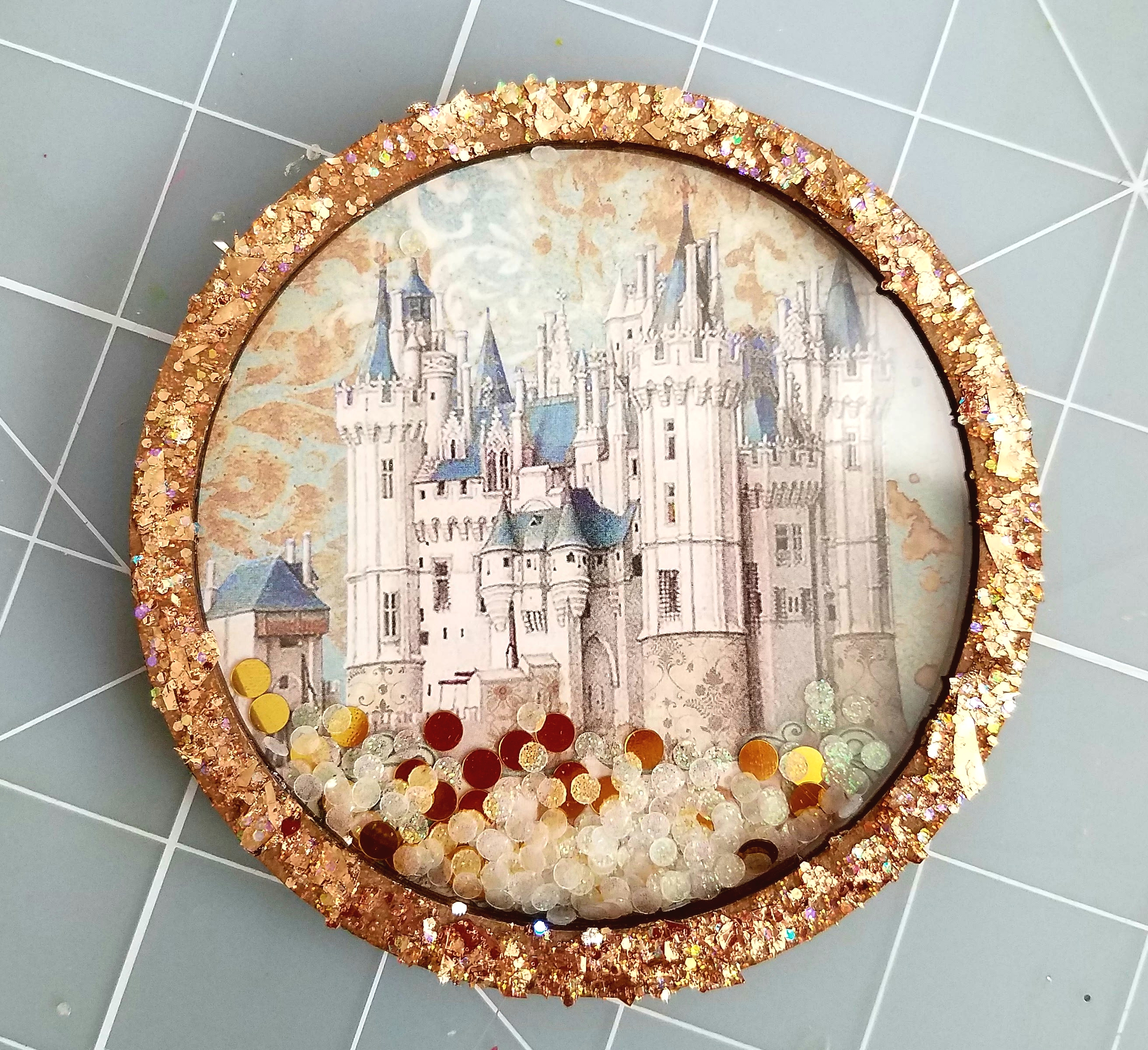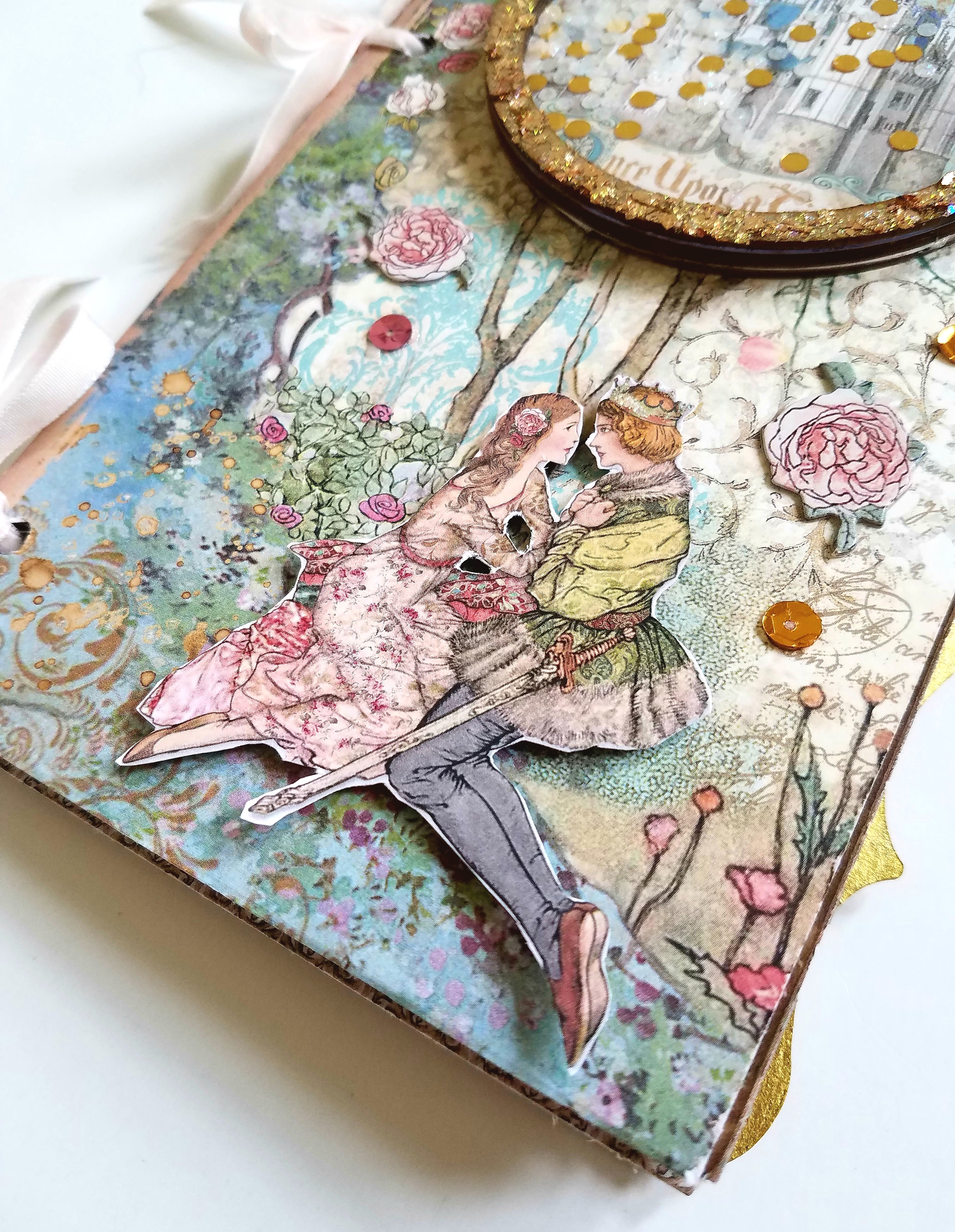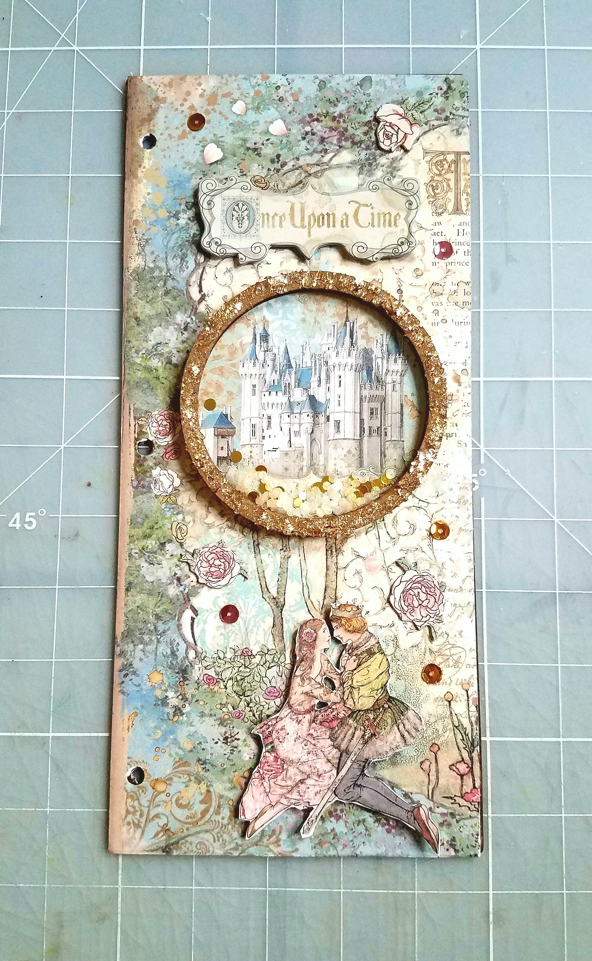 Other Supplies used: Finnibair Sparks paint- Dragon's Eye, Stamperia Sleeping Beauty collection, foam dots, Glitteriffic Gold glitter, paintbrush, scoring board, Beacon 3 in 1 glue, crystal gem, confetti in clear and gold, sequins.