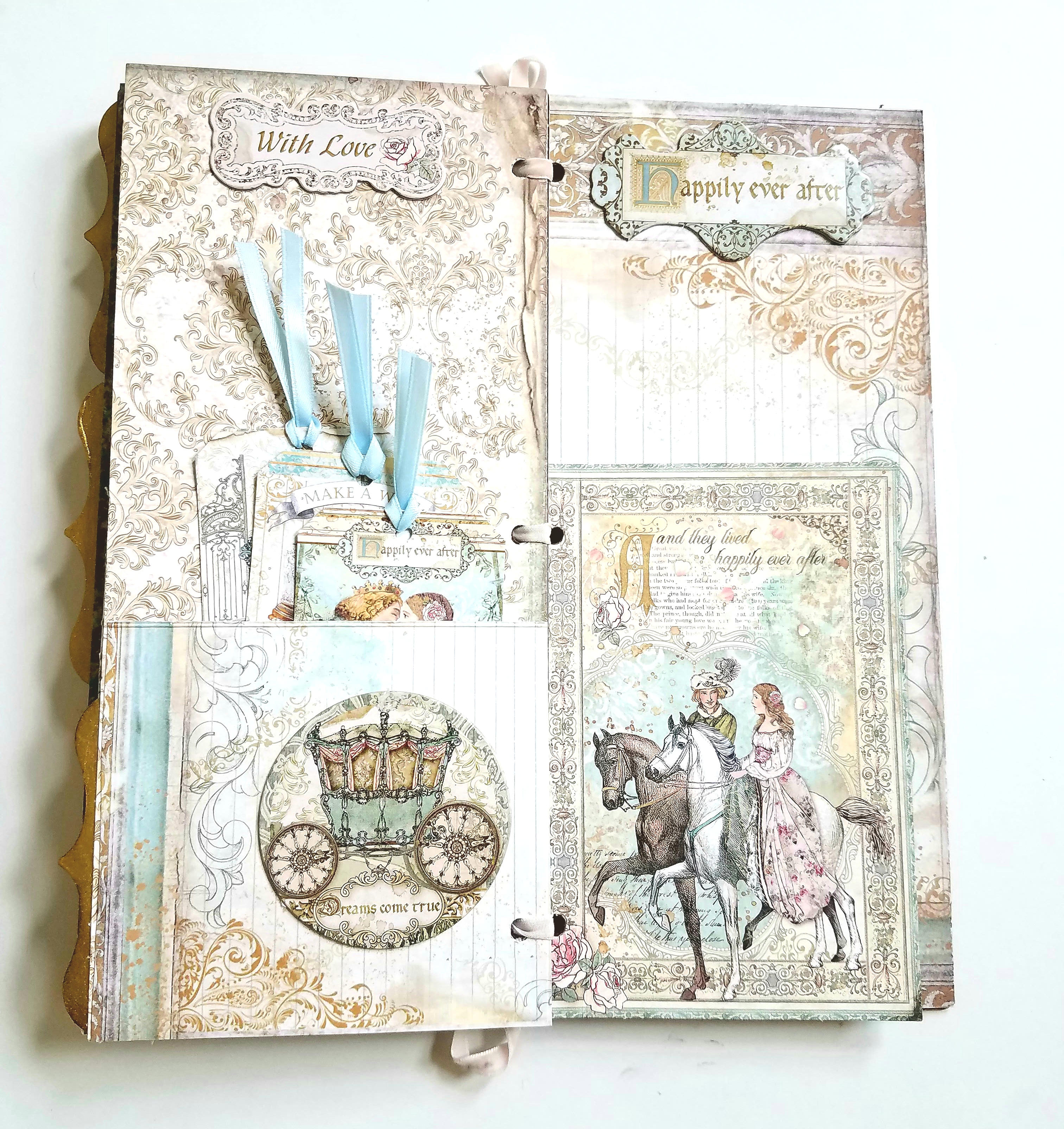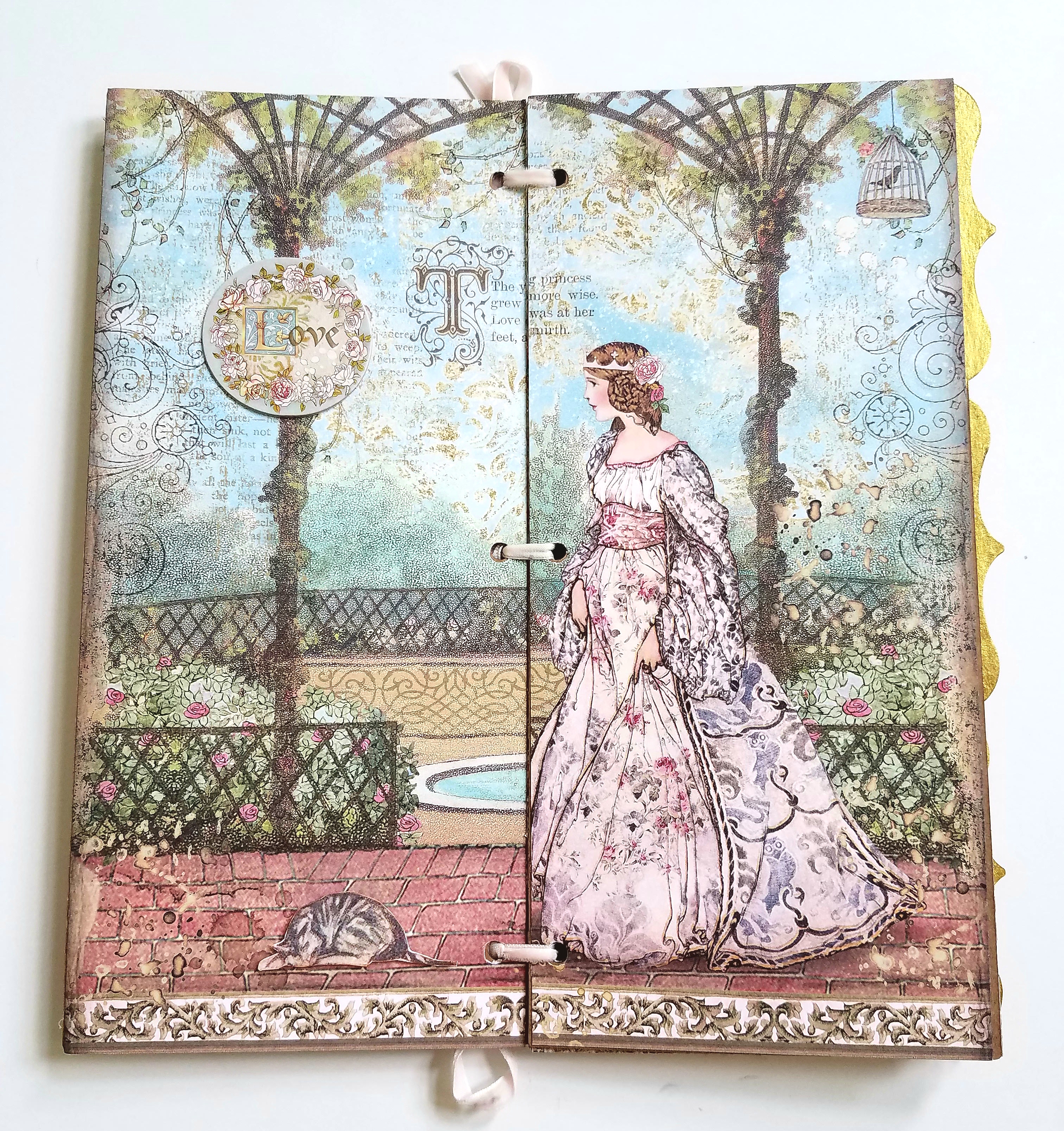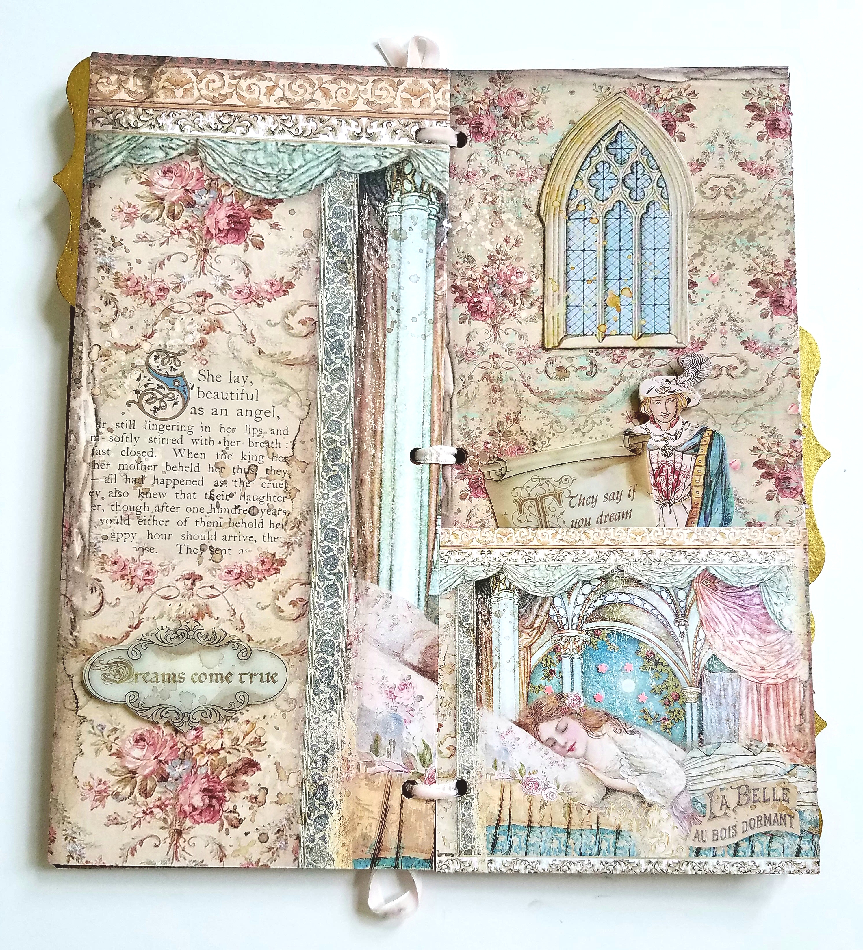 The papers I chose are from Stamperia Sleeping Beauty collection. All base papers will measure 5×11 inches, the size of this album. I adhered all my papers to the front and back covers, and all inside pages with glue. I recommend using a strong glue like Beacon 3 in 1 glue. Don't forget to mark and punch all your holes along the edge of your papers before gluing. Set your album aside for now.