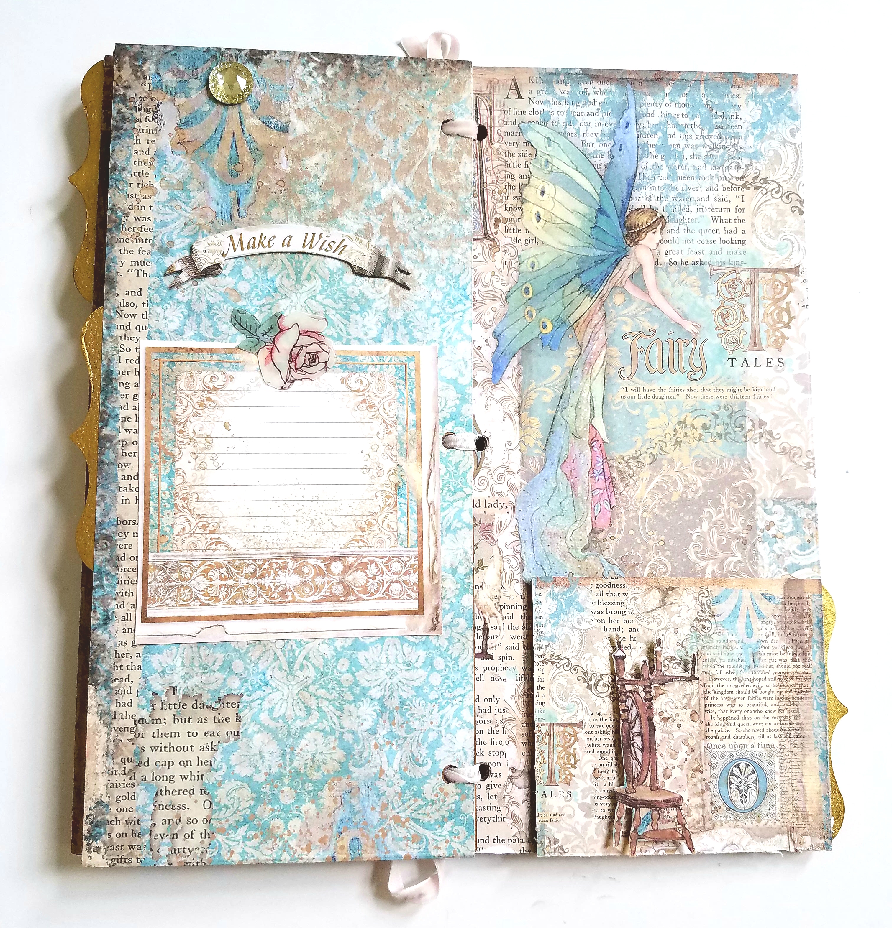 Page 5, I cut out one of the journaling cards and adhered to the center of my page and added a clear rose diecut to the top of my card. I glued another Make a Wish sentiment above my journaling card. Added a jewel from my stash to the top of my left page. For page 6, I cut a small flip page to measure 4 x 3 1/2 inches, scored 1/2 inch on the right and adhered to the right side of my page. I fussy cut the spindle wheel and adhered with pop dots to the top of my flip page. Inside my flip page I took one of the leftover images of Sleeping beauty and glued it inside.