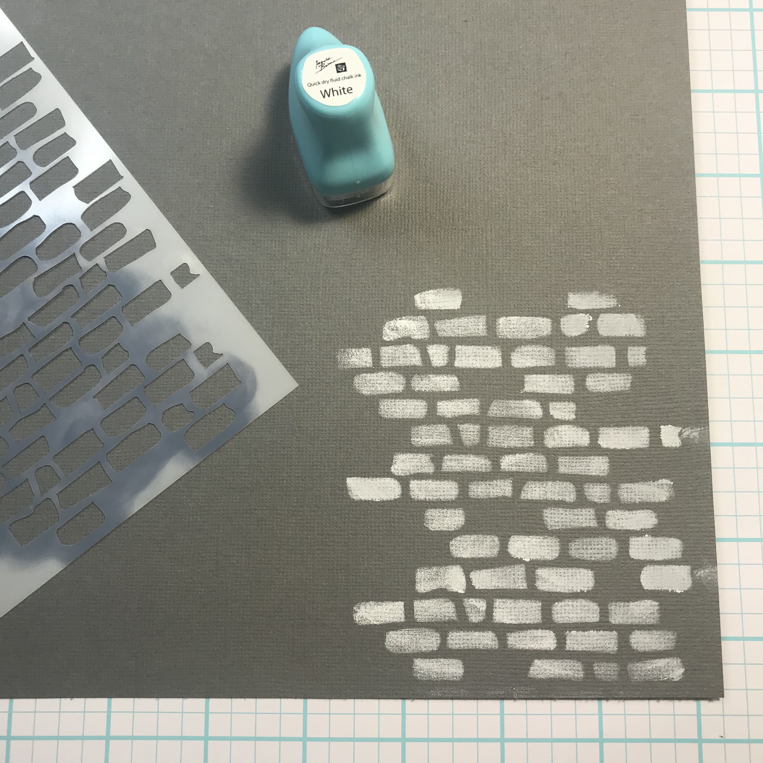 I've used a medium gray 12" by 12" sheet of card stock, and with a chalk white ink, sponged bricks in the corners through the masking stencil. This is one of my very favorite stencils – I use it for all sorts of projects!