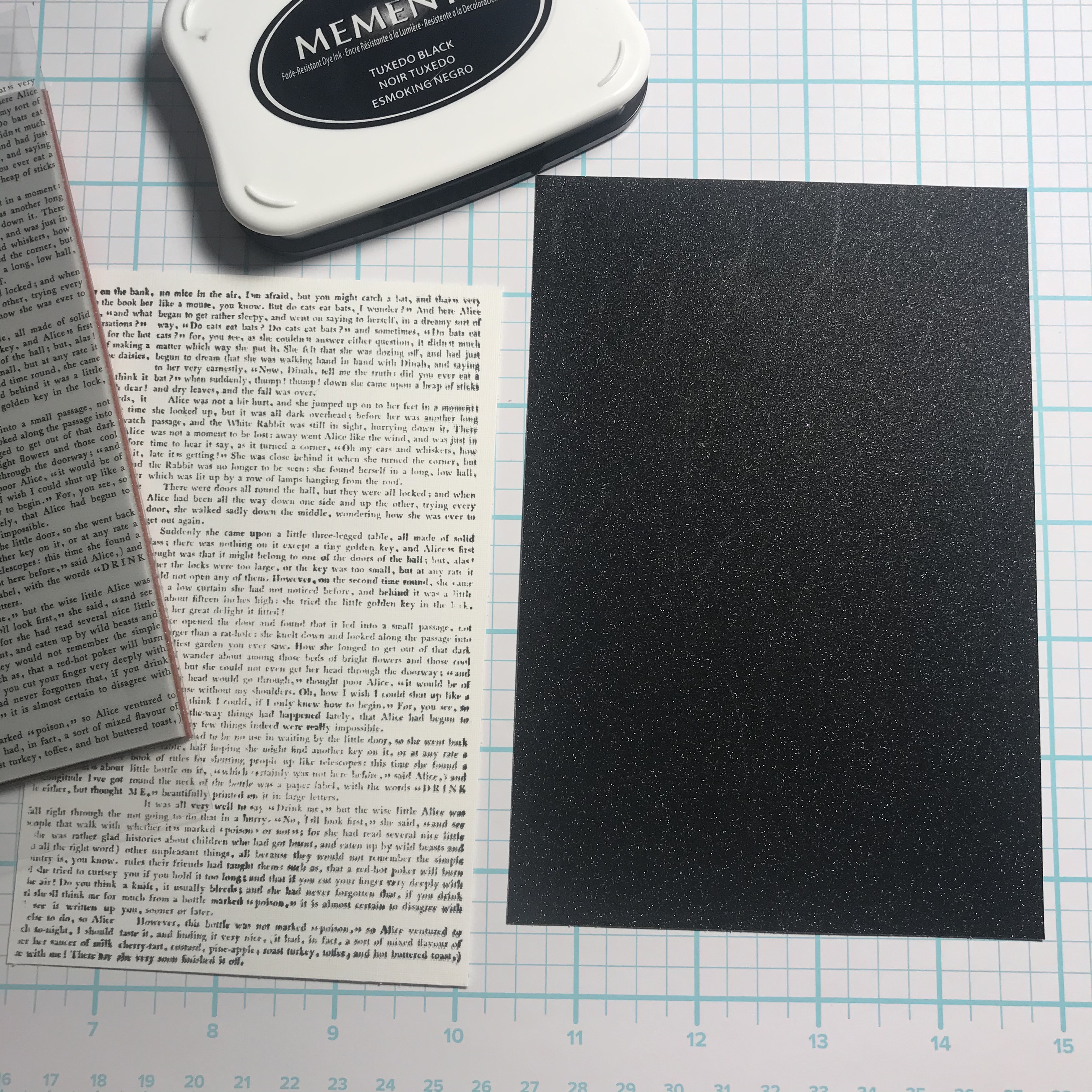 The photo is backed with 2 sheets of paper – one is a black glitter, and the other is stamped with a background stamp to look like a page out of a book. I've angled these behind the photo.