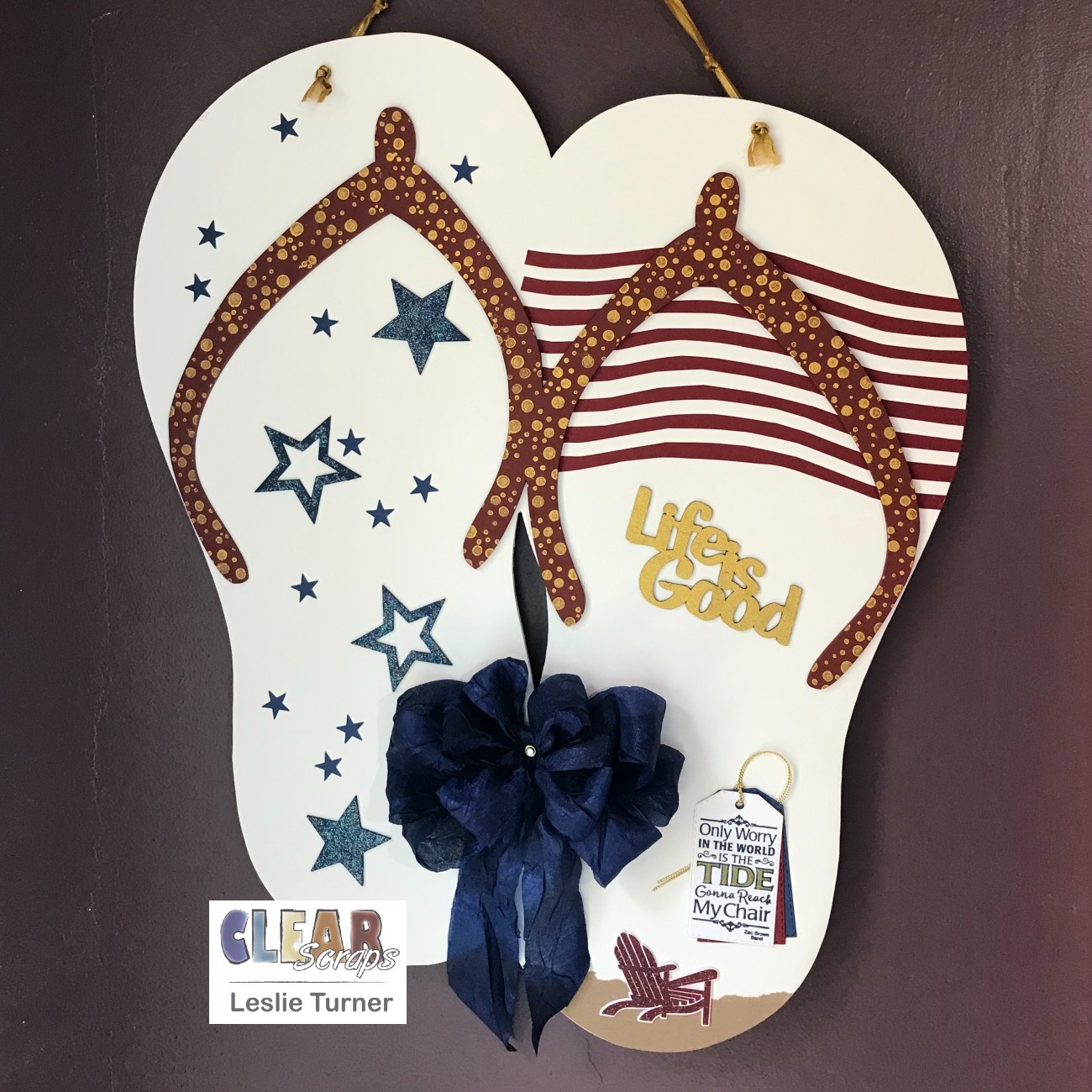 Hi everybody! Leslie here, sharing an Americana-Beach Wall Hanging with you today! This was such a fun project! I love Americana and I have a super awesome long-time friend who lives and breathes 'beach' so when I saw this amazing XL Wood Flip Flop and the Multi Stars Chipboard Embellishments and Life Is Good Chipboard Word Title, the wheels started turning! Stars and stripes, an Adirondack chair and beach sand, and this project came to life!