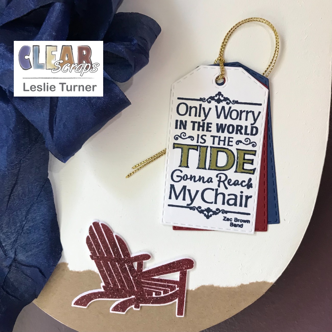 I embellished the bottom of the right flip flop with torn kraft cardstock to resemble beach sand along with a stamped, embossed and die cut Adirondack chair. I added a stamped and layered tag tied with gold metallic string.
