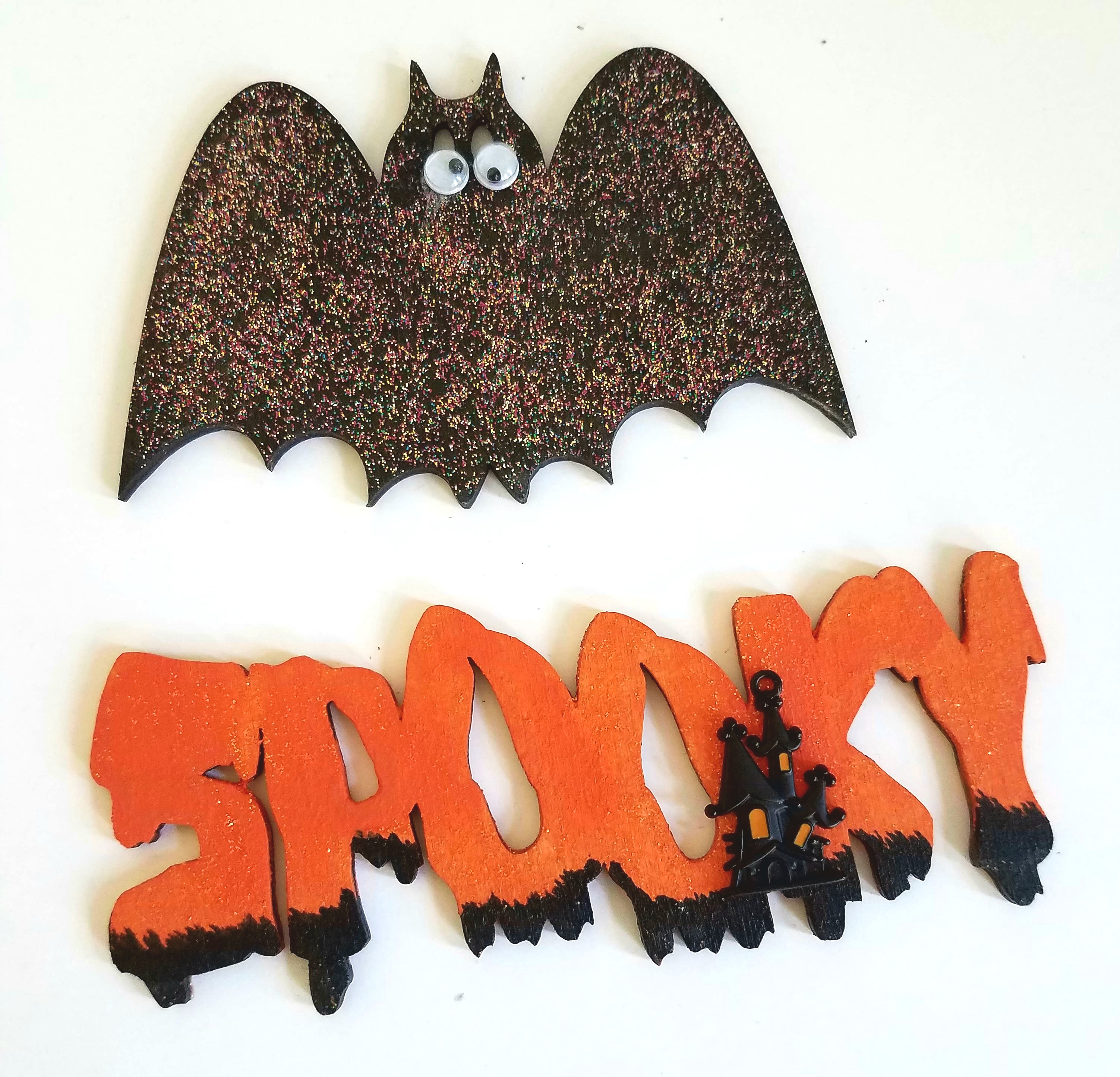 Take out your Spooky-Bat Word N Shape from the package. I used black acrylic paint and applied to the front and back of my bat shape. I painted my spooky words with orange paint. Let dry. I took some Glitz Stickles and applied with a brush to the front of my bat shape. This adds a nice glitter effect; let dry. Next I took some googly eyes from my craft stash, and adhered onto my bat over the eye area. Let dry. To add a dripping effect on the bottom of my spooky words, I added alittle black paint along the bottom. Let dry. Once dried I glued a metal spooky house charm along the bottom of my wood words, making sure you still can snap in place on your wood base.