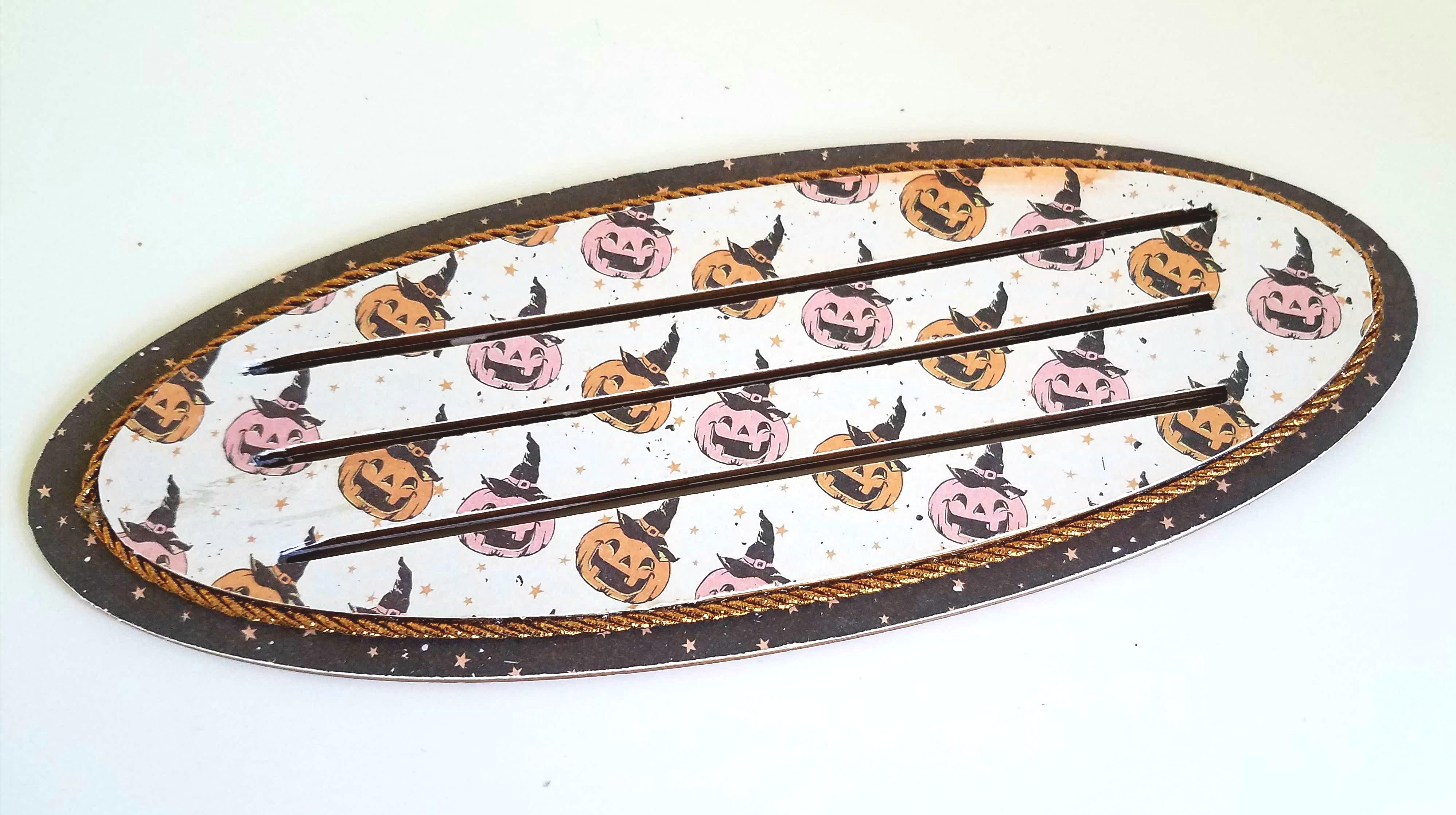 Next we will decorate our 2 bottom bases. I chose to cover mine with paper. But you can paint, stamp and ink them, depending on the look you prefer. The papers I'm using are from Frank Garcia's Thirty one collection. I chose 2 coordinating papers and traced around each shape with a pencil, then cut them out. I adhered my papers to each wood base using Beacon 3 in 1 glue. Trim along the edges with an x-acto knife, including all the slots on both bases. Then taking my Clear Scraps Sanding Tool Click Here smooth along all edges of both bases, including the inside slots. Then glue both bases together making sure your slots line up correctly. To finish off my base I glued some gold cording along the top base edge.