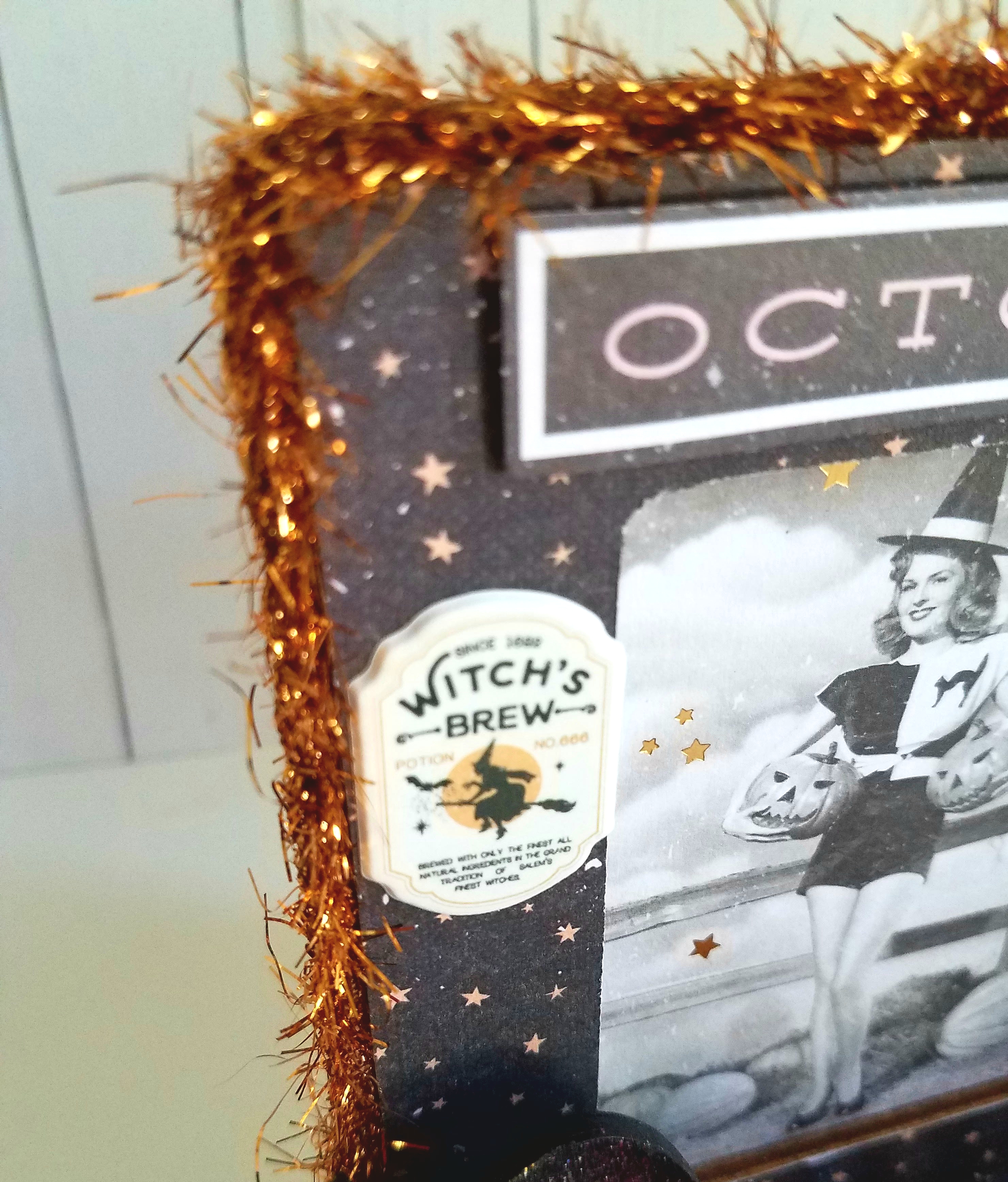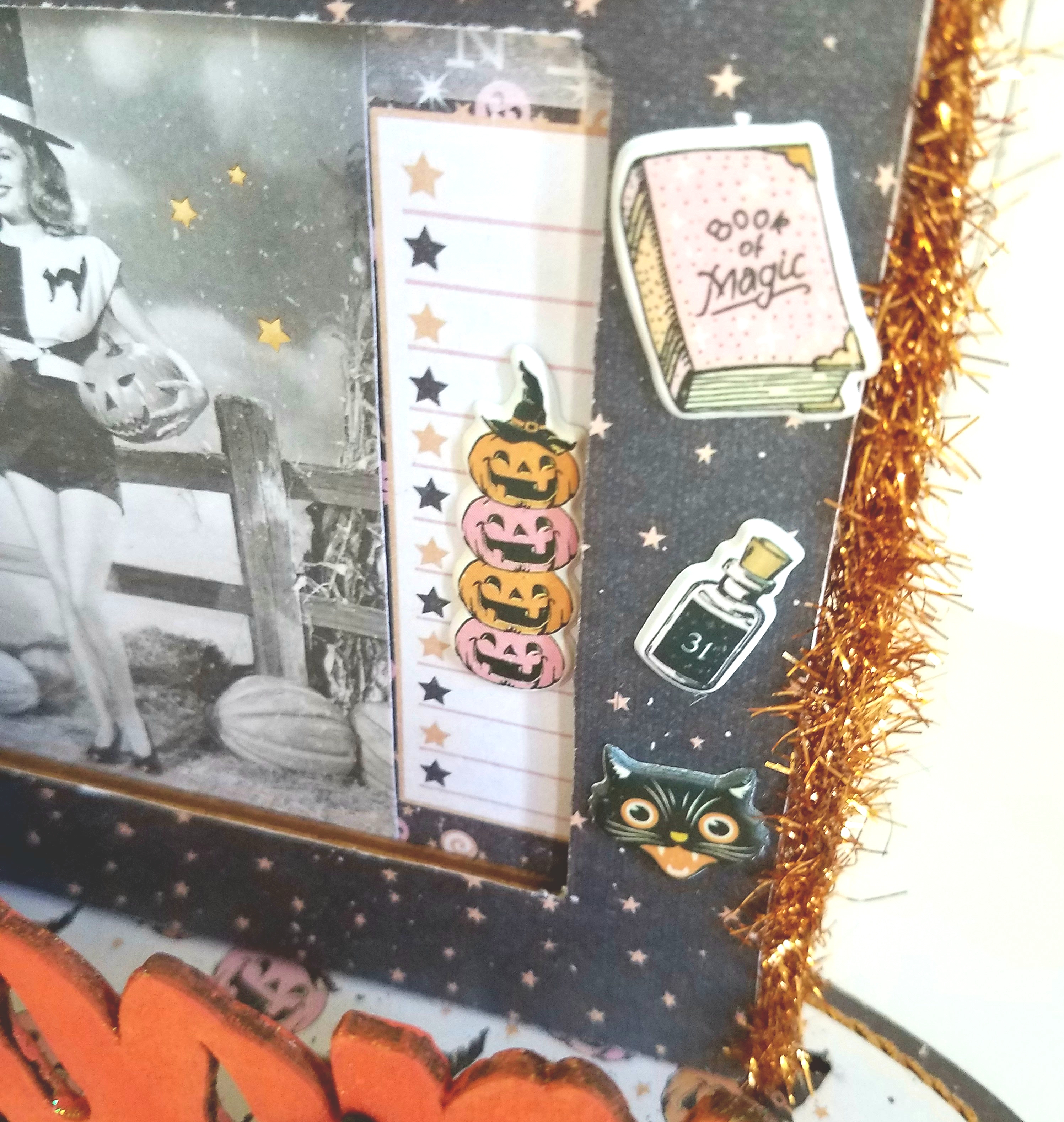 Next up we will be decorating the top frame piece. I chose another paper and traced, cut out and trimmed as we previously did on our base pieces. You can add a favorite photo to the back of your frame if you like. I chose to add a cute vintage witch photo from my ephermera pack! I added part of another journaling card on the right side of my photo. Then glue your frame to the bottom frame wood piece, making sure to line up the top edges. Next I glued some orange gold tinsel around both sides and the top of my frame. Snap frame in place on base. Now the fun part is decorating your frame! I chose some some puffy stickers from the paper collection and adhered them onto my frame. I added foam dots to the back of my ephermera words ,October 31st, and adhered onto the top of my frame. That's it! I think these Framables are the perfect Home Decor piece to decorate any room for Halloween. I think it would be a great gift idea to surprise someone too. They come apart so it makes shipping them super easy!