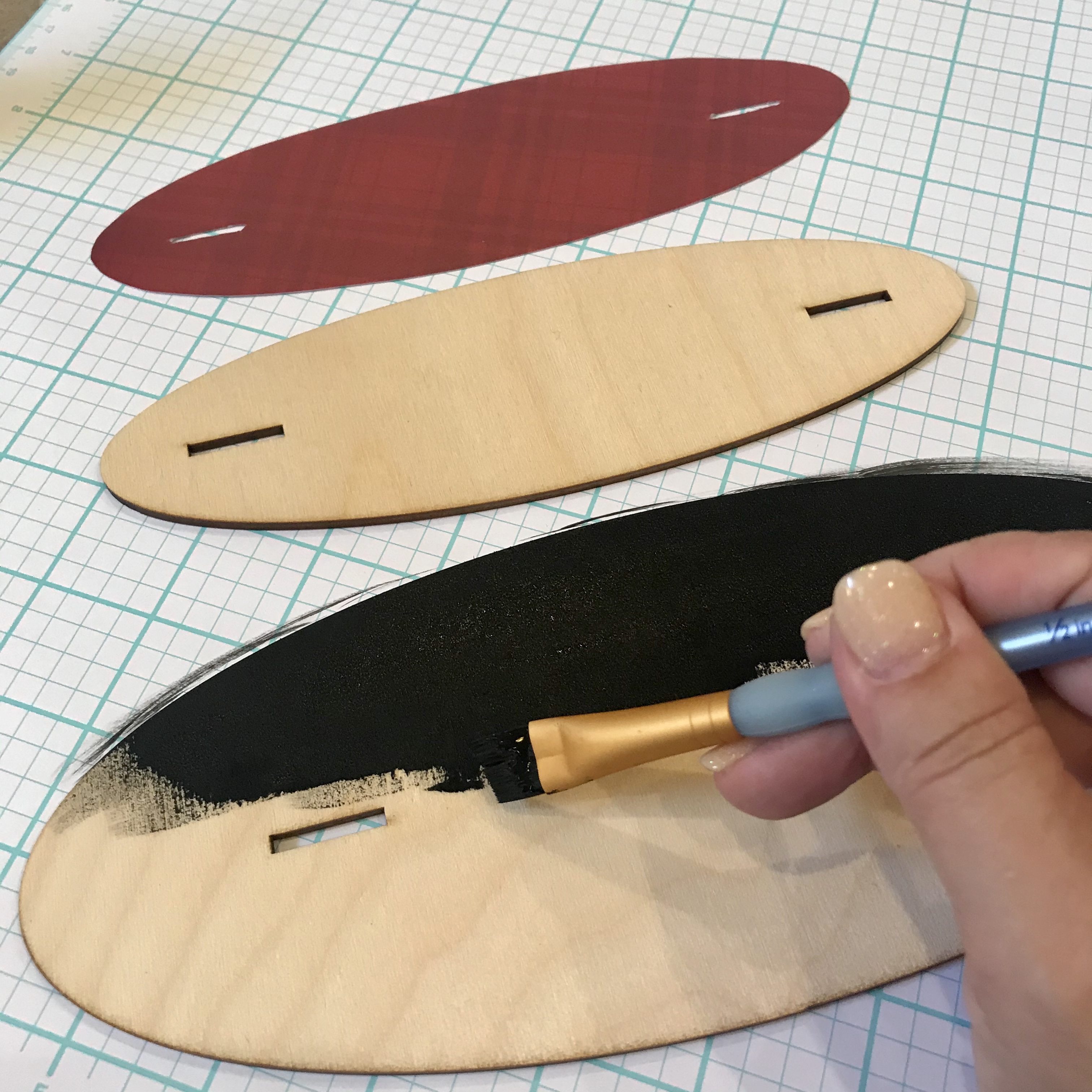 For my final touch…I am using the apple shape from the Fall Wood Collection of shapes, and I intend on preparing the other shapes for a future project too. This shape I wanted to look different than the red plaid hat, so I've sanded it, then coated it in a black chalkboard paint. What a great way to add a Fall message or personalization to your project!