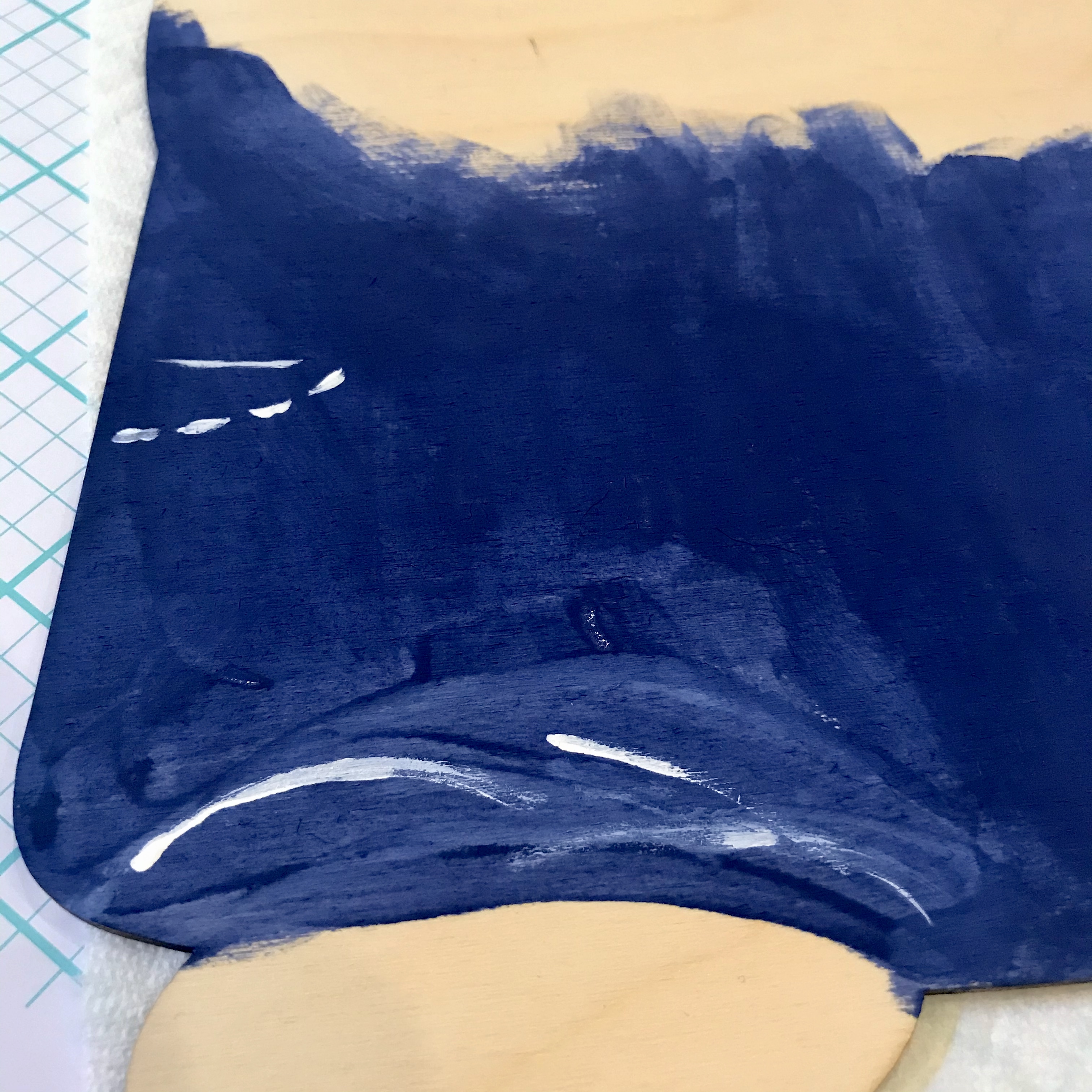 Now for the gnome "jeans." This is an acrylic blue paint, but I took some drops of water to it so it would look a bit more 'washed' in areas. Feel free to take a second coat if you prefer more coverage on the wood! Then, I coated a paintbrush lightly with white paint, and brushed a lot of it off on a paper towel. This "dry brushing" technique allows you to add light streaks of white in areas. I made several rainbow shaped arcs where the jeans would drape around the shoes.