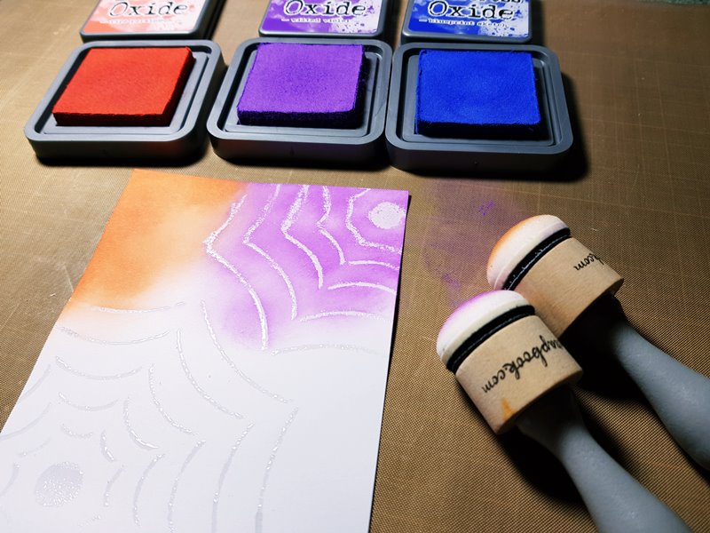 ▼ Time to add my favorite Halloween colors! As you can see here, I used three colors of distress oxide inks along with blending tools to blend orange, purple, and blue to the background.