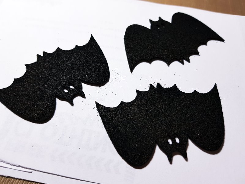 ▼ After the background is finished, I moved on to give the bats chipboard a coat of black embossing powder. Starting by tapping the bats chipboard to VersaMark ink pad, here shows what it looks like after sprinkling the black embossing powder. And again, the last step was to heat with a heat gun.