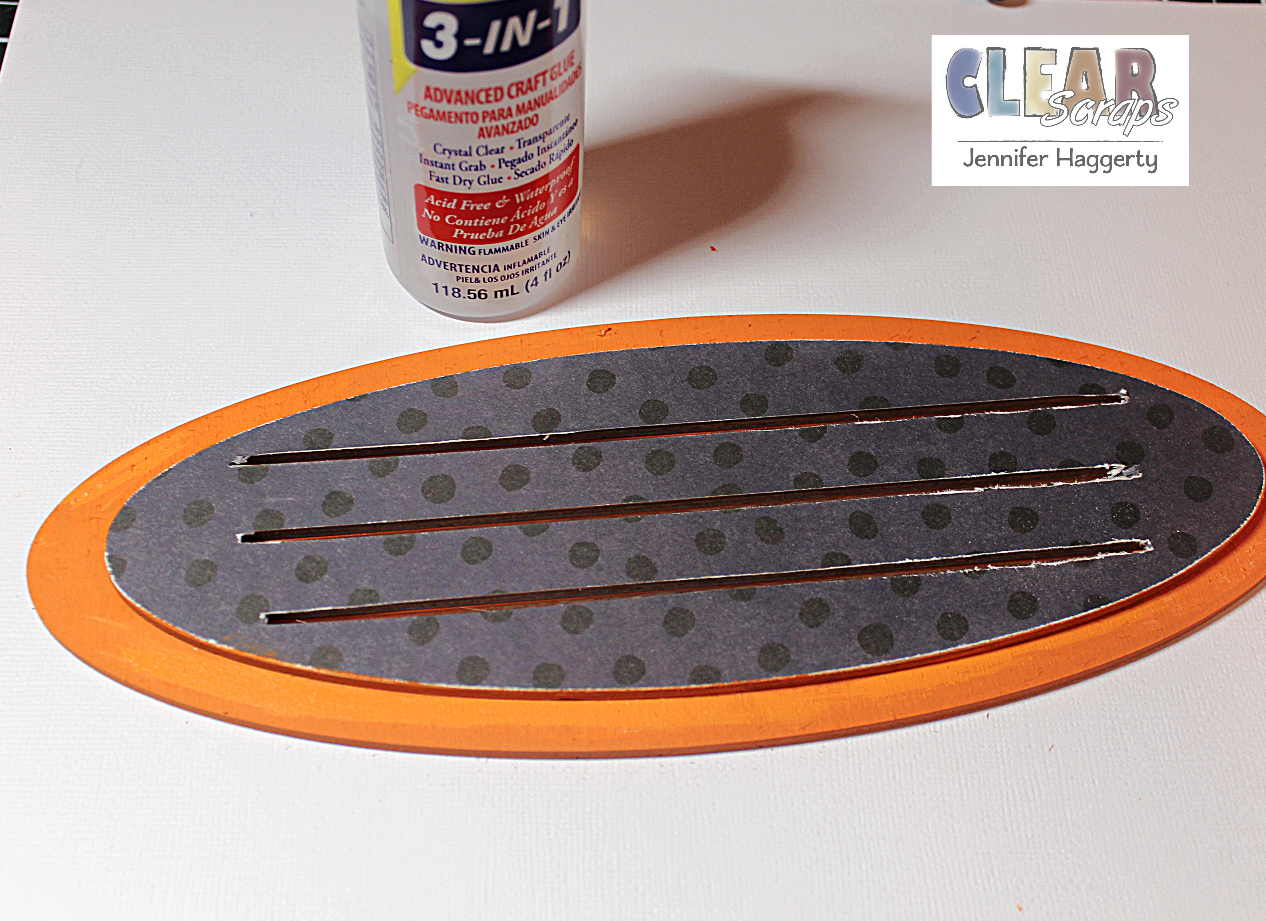 I began by covering my Scallop Frame and the smaller oval of the base with patterned paper. I adhered my paper using Beacon 3-in-1 Adhesive then trimmed excess away with an x-acto knife and a sanding tool.