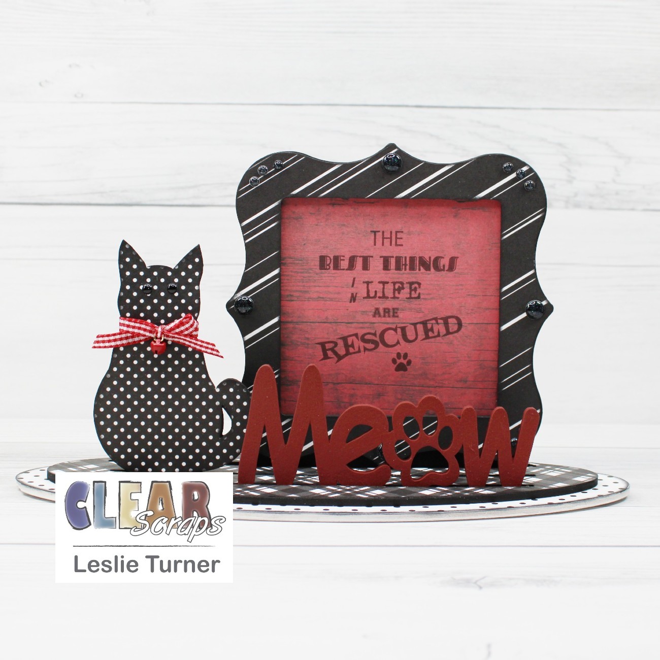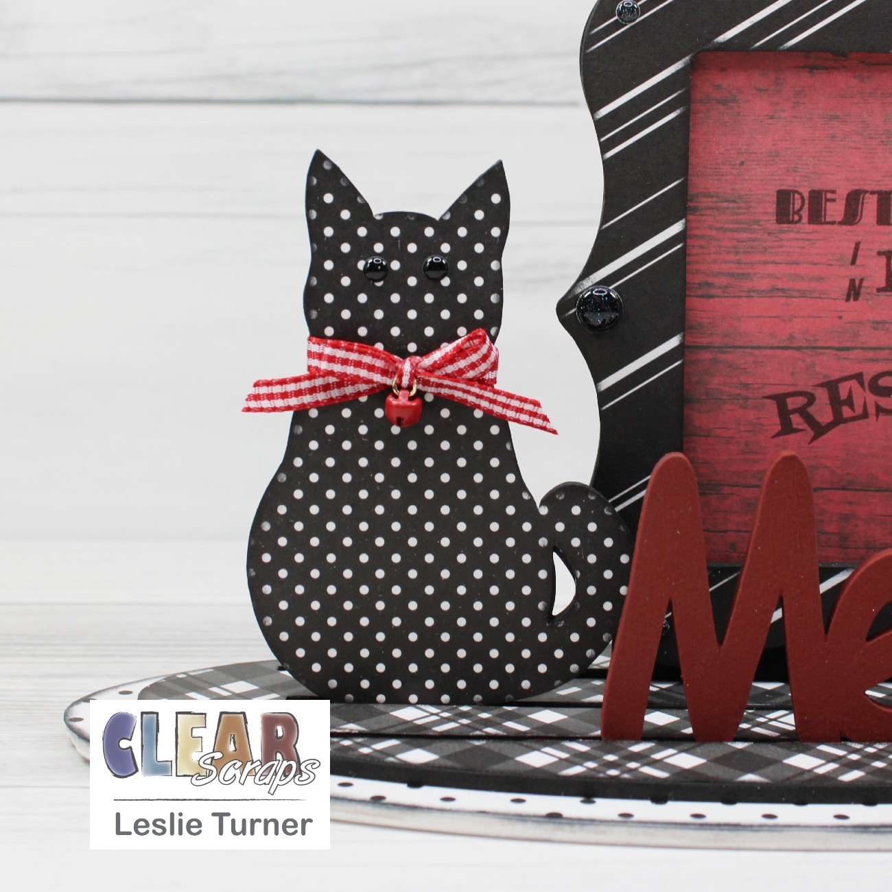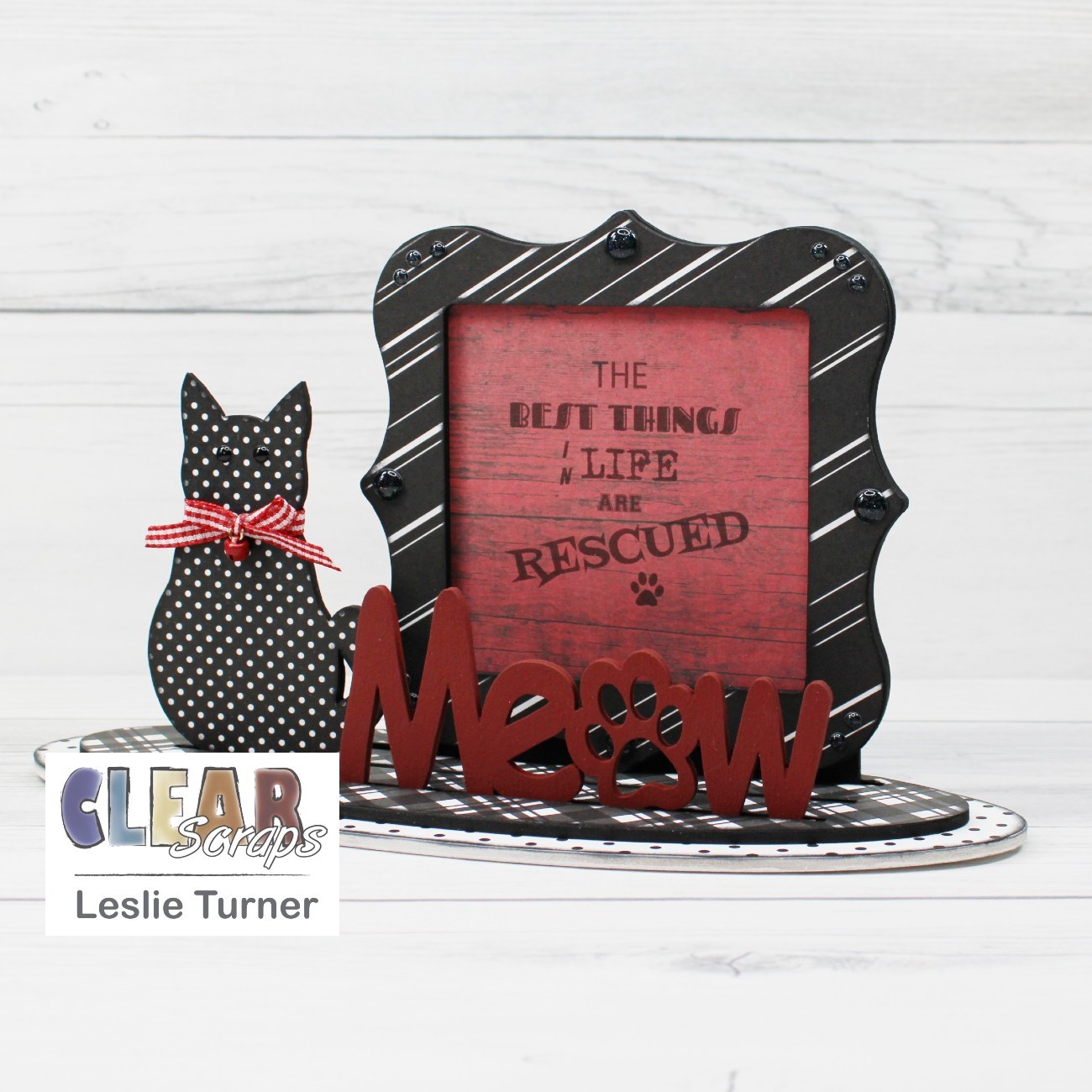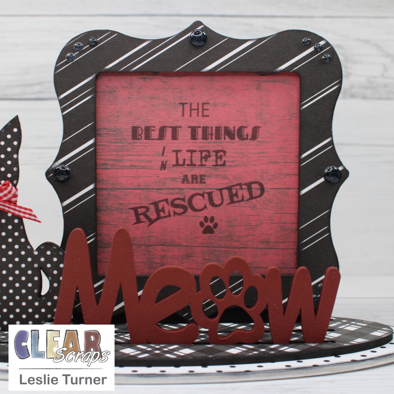 Hi everybody! Leslie here, sharing a 3-D Frameables project! Yep, I've jumped on the 3-D Frameables wagon… they are SO much fun, and the sky is the limit with regard to interchangeable frames, shapes and words! I used the Deco Frame and Meow-Cat Word n Shape and created this project in a B&W + Red color combo which is one of my favorites! I have to tell you that this project is really close to my heart because my husband and I are 'crazy cat people' and we rescue. We have ten indoor fur babies with a catio and nine more outside (feral and semi-feral) with another catio in a fenced back yard! Okay, on to my project…