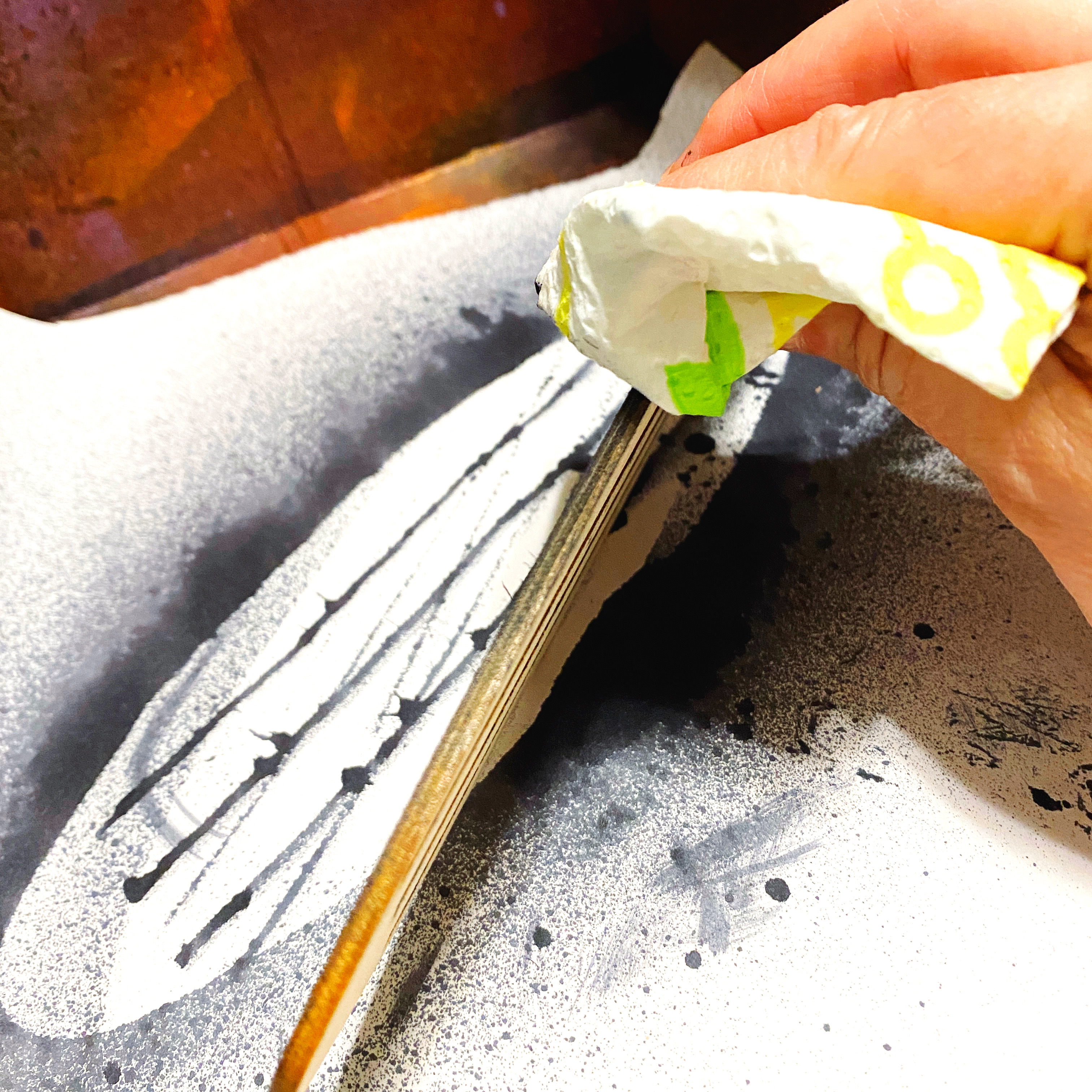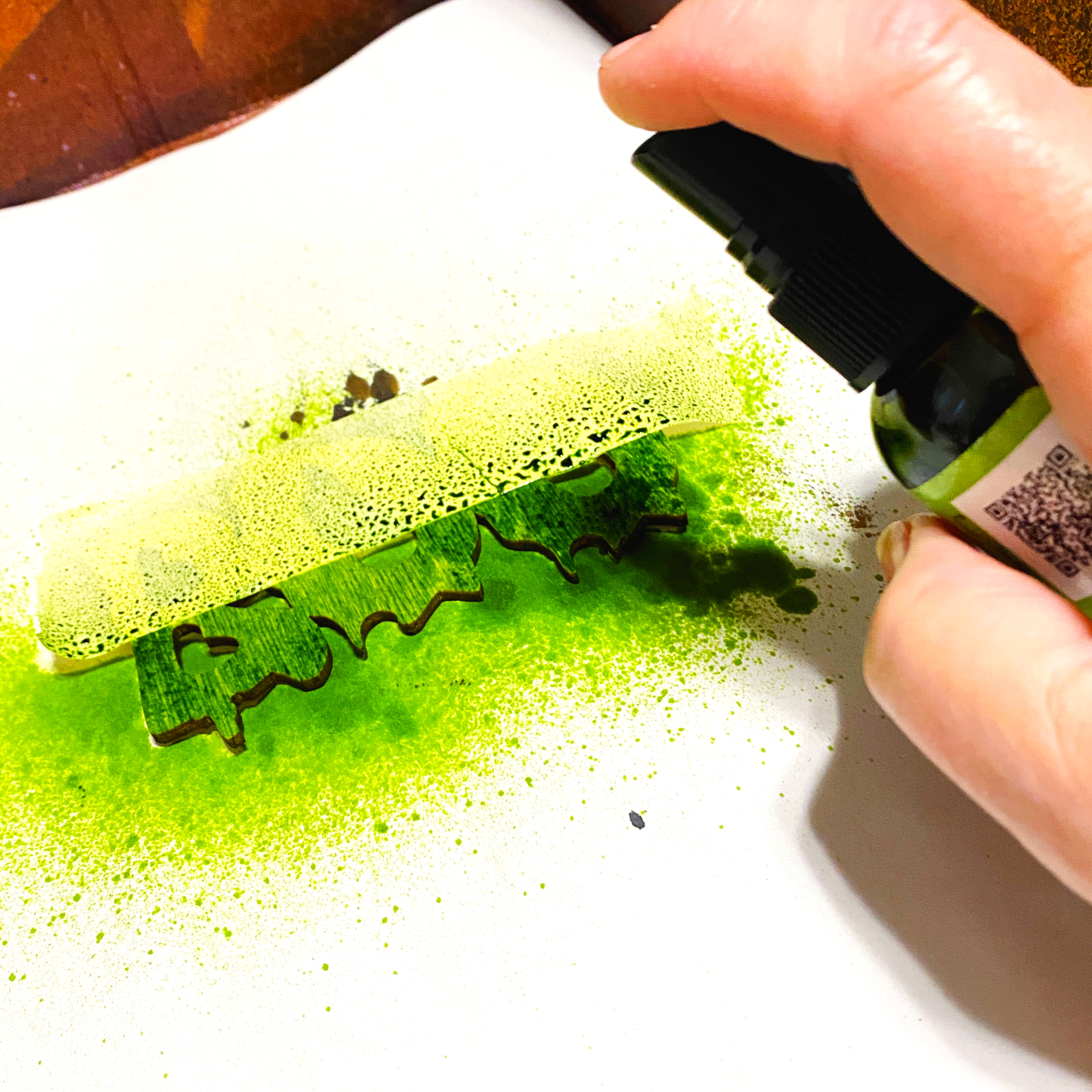 I started by using orange and black spray inks on the base pieces. The bases were set aside to dry while I worked on the other parts of the project…