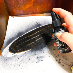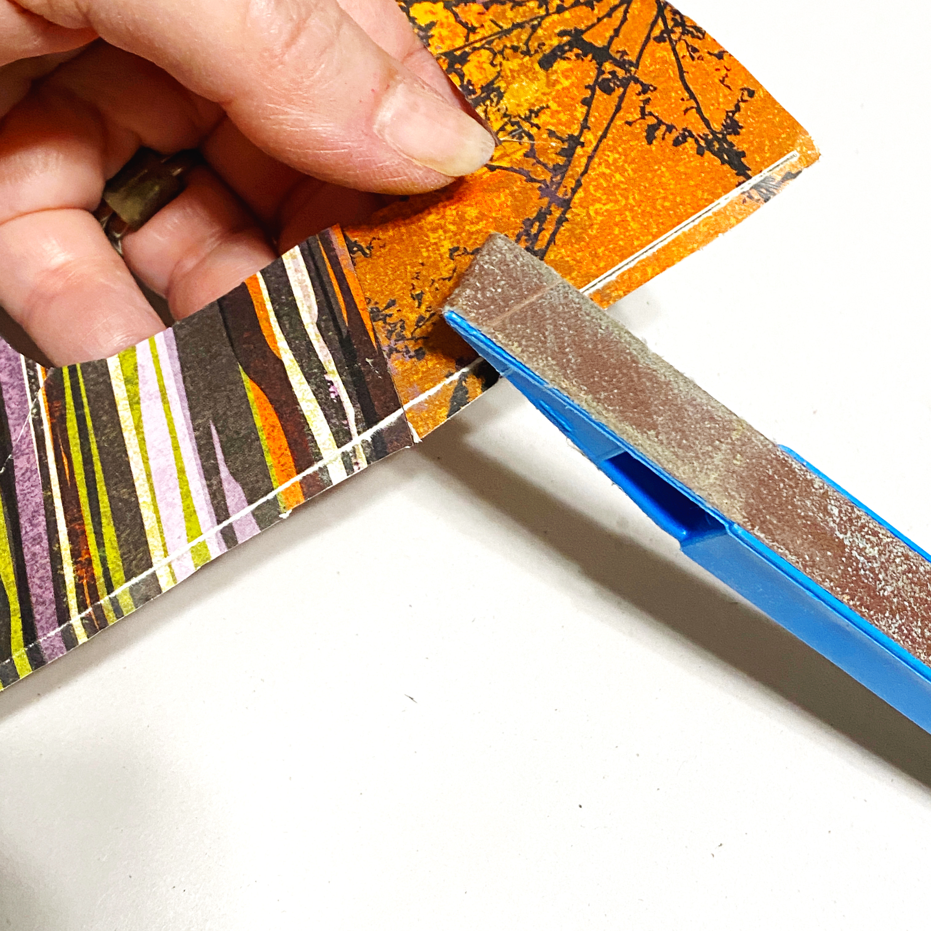 The excess paper was trimmed from around the edges. The paper from the center of the frame was also cut out. Diagonal cuts made into the corners to help make removing the excess paper with the Sanding Stick easier…