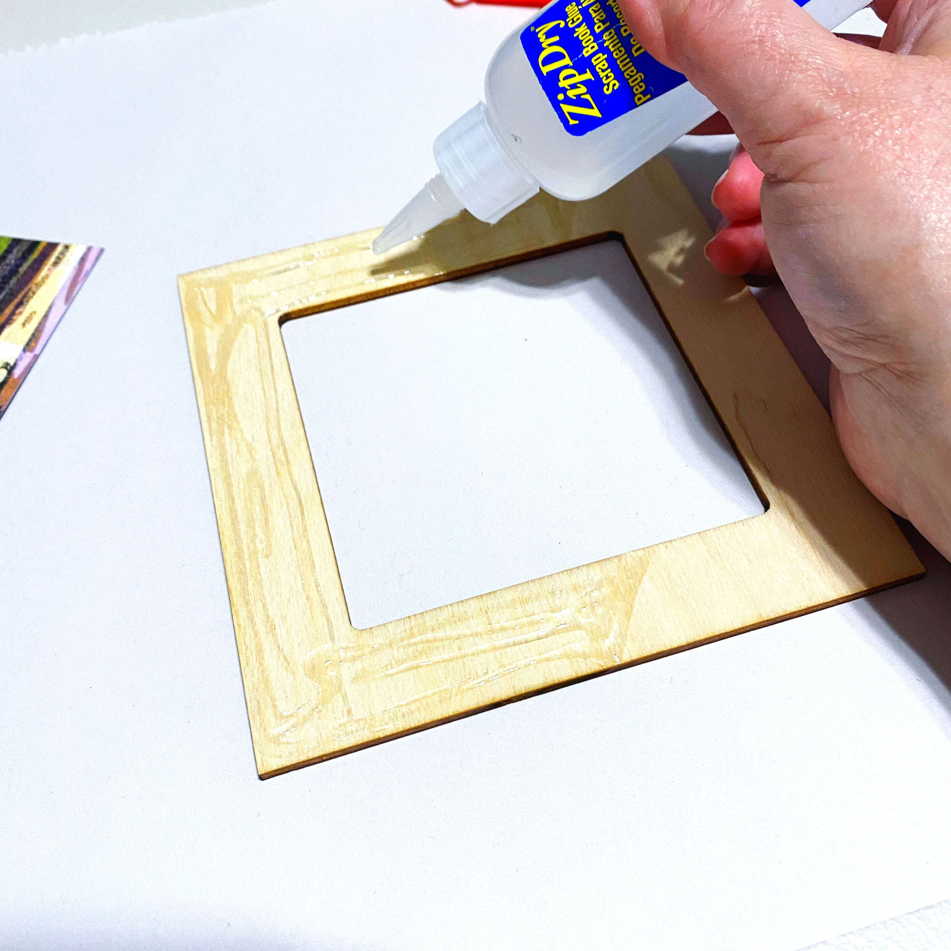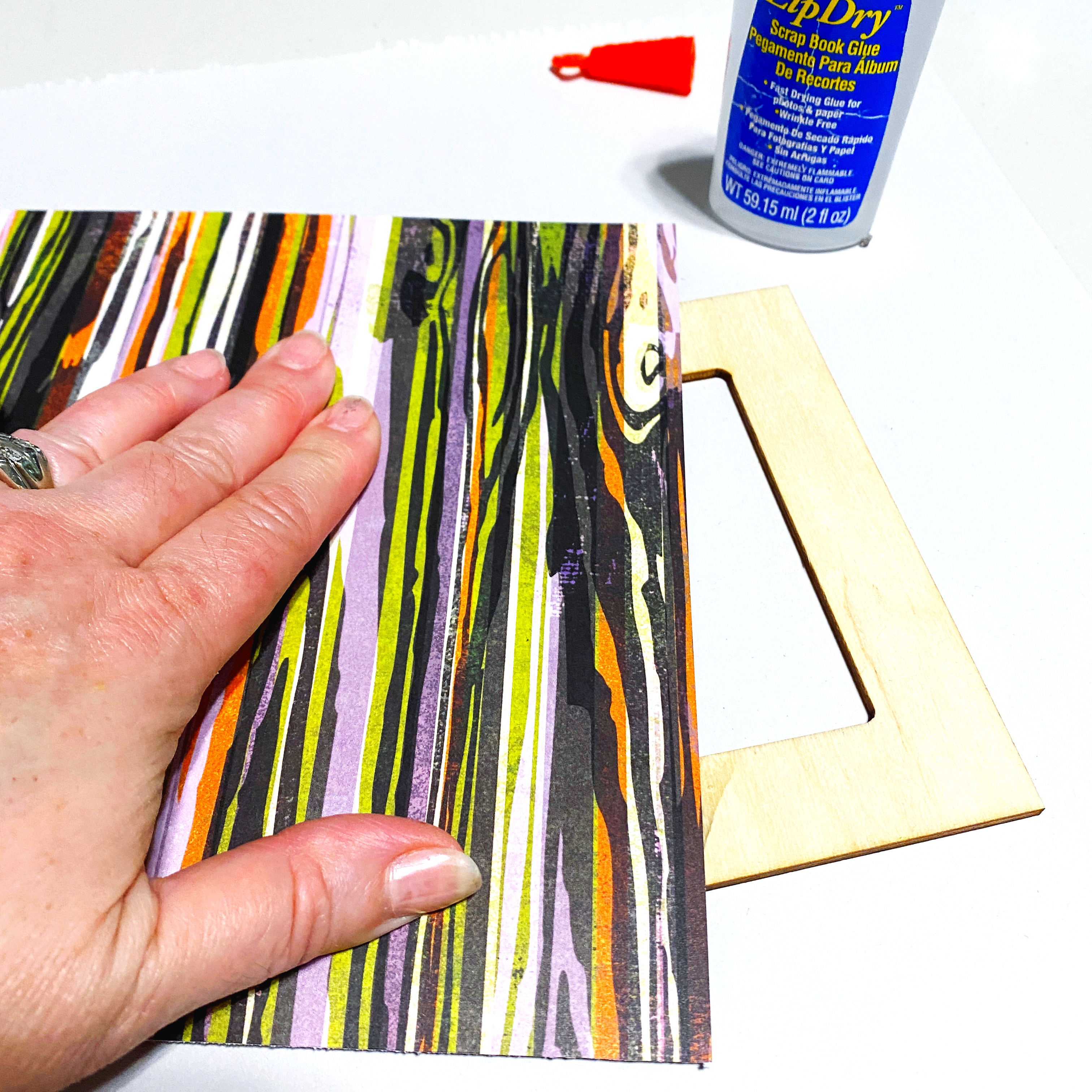 I used 2 different patterns of printed paper to cover the frame. I applied the glue to the portion of the frame I wanted covered with the first paper, then did the same with the second. Rubbing over both to be sure they were securely adhered…