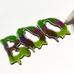 For the Boo word shape, I taped off the top half and sprayed the bottom with lime green. The tape was then repositioned over the green and the top sprayed using purple ink. I took the tape off and allowed the purple to drip down into the green. While the purple ink was still wet, I sprinkled it with clear embossing powder and heat set it…