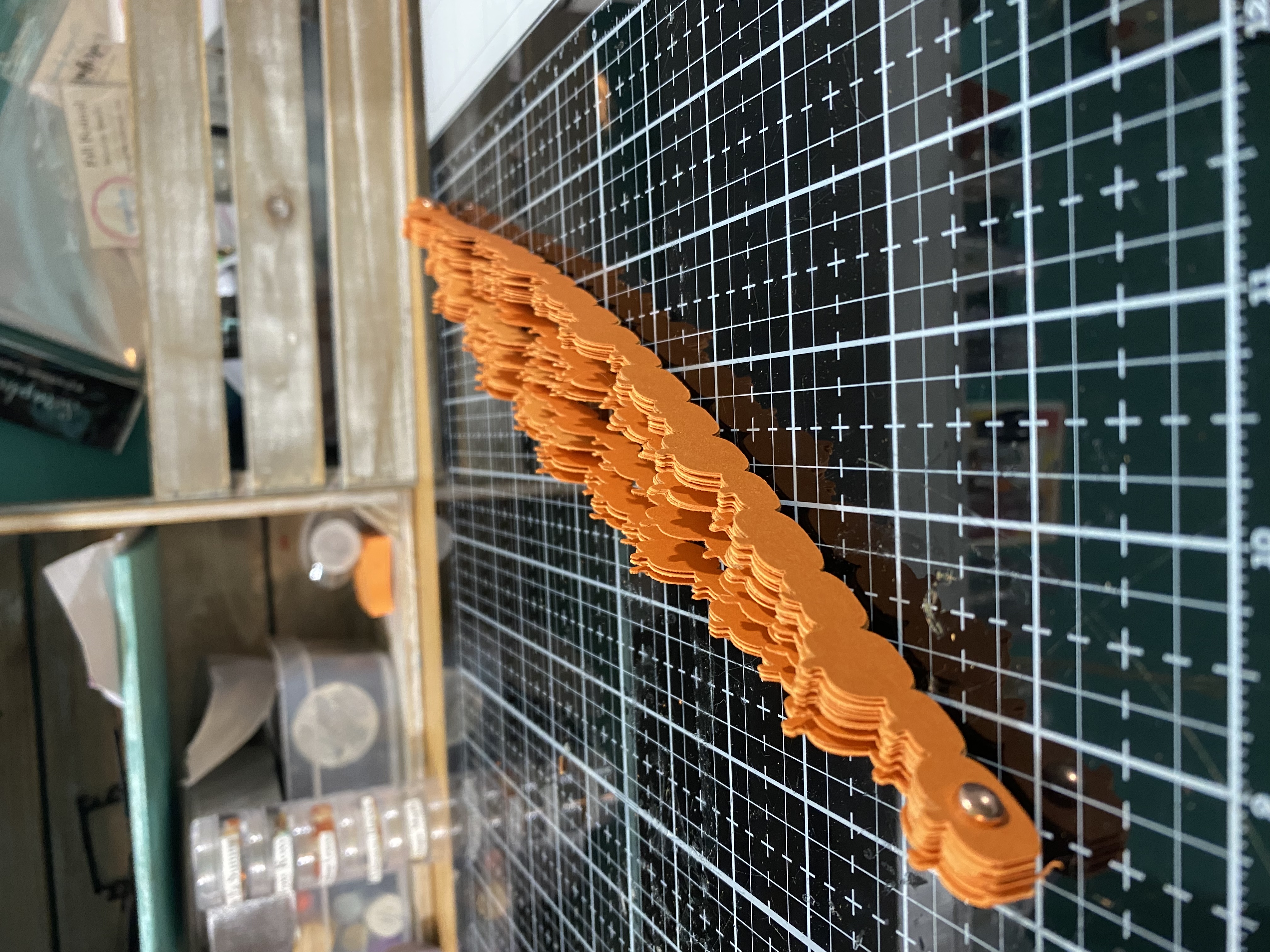 I started off by using an old Creative Memories border punch, with the pumpkins cartridge. I don’t remember exactly how many I punched out, but it was a lot. I pierced holes in both ends and adhered them with a brad, so I was able to move them into a half circle. To get it to stand, I glued it to a stack of heavy chipboard pieces.