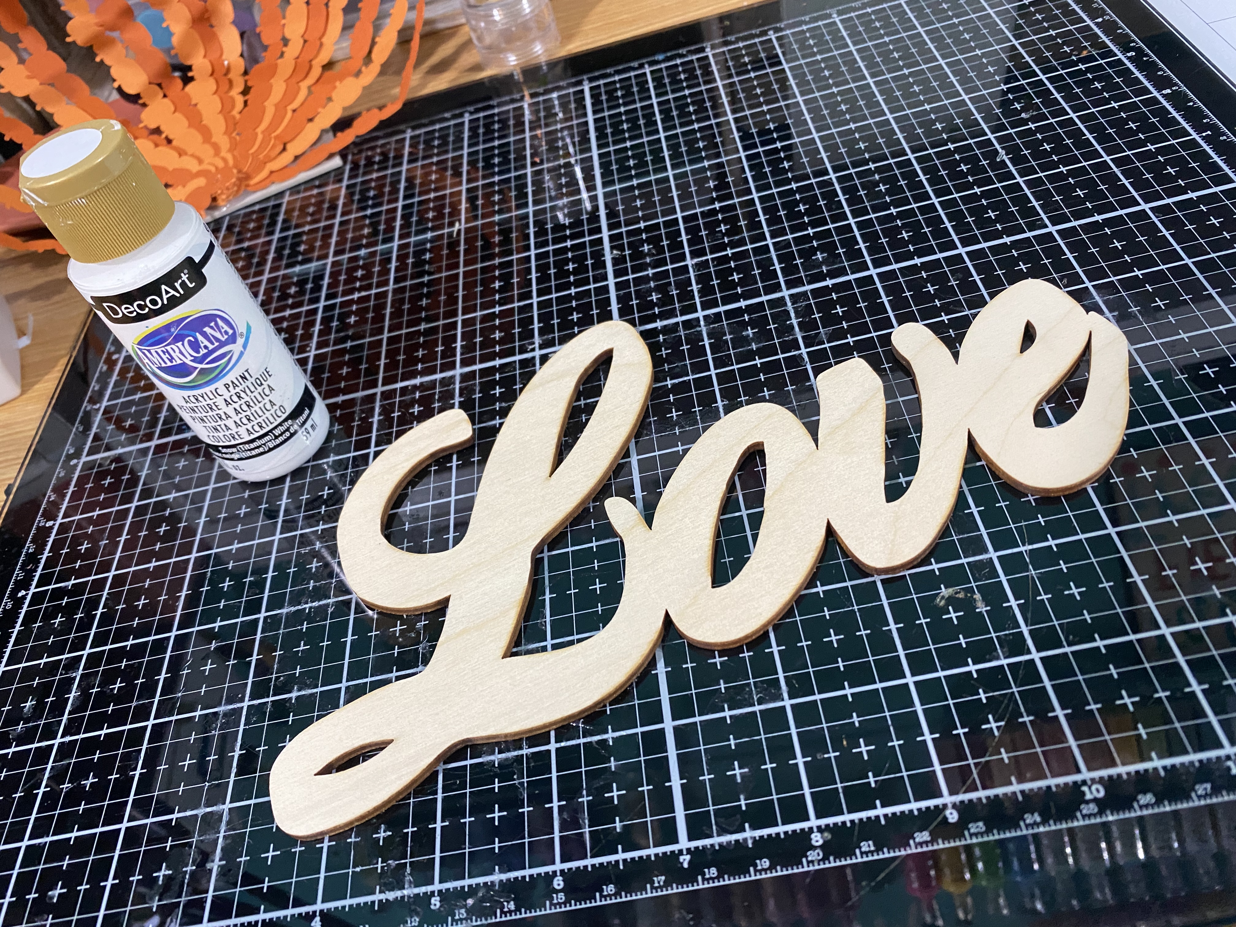 For my Love XL Script Wood Word, first I painted it white and left it to completely dry. Then using a fan brush and metallic silver paint, I brushed it over the white, but not solidly allowing the white to peek through quite a bit.