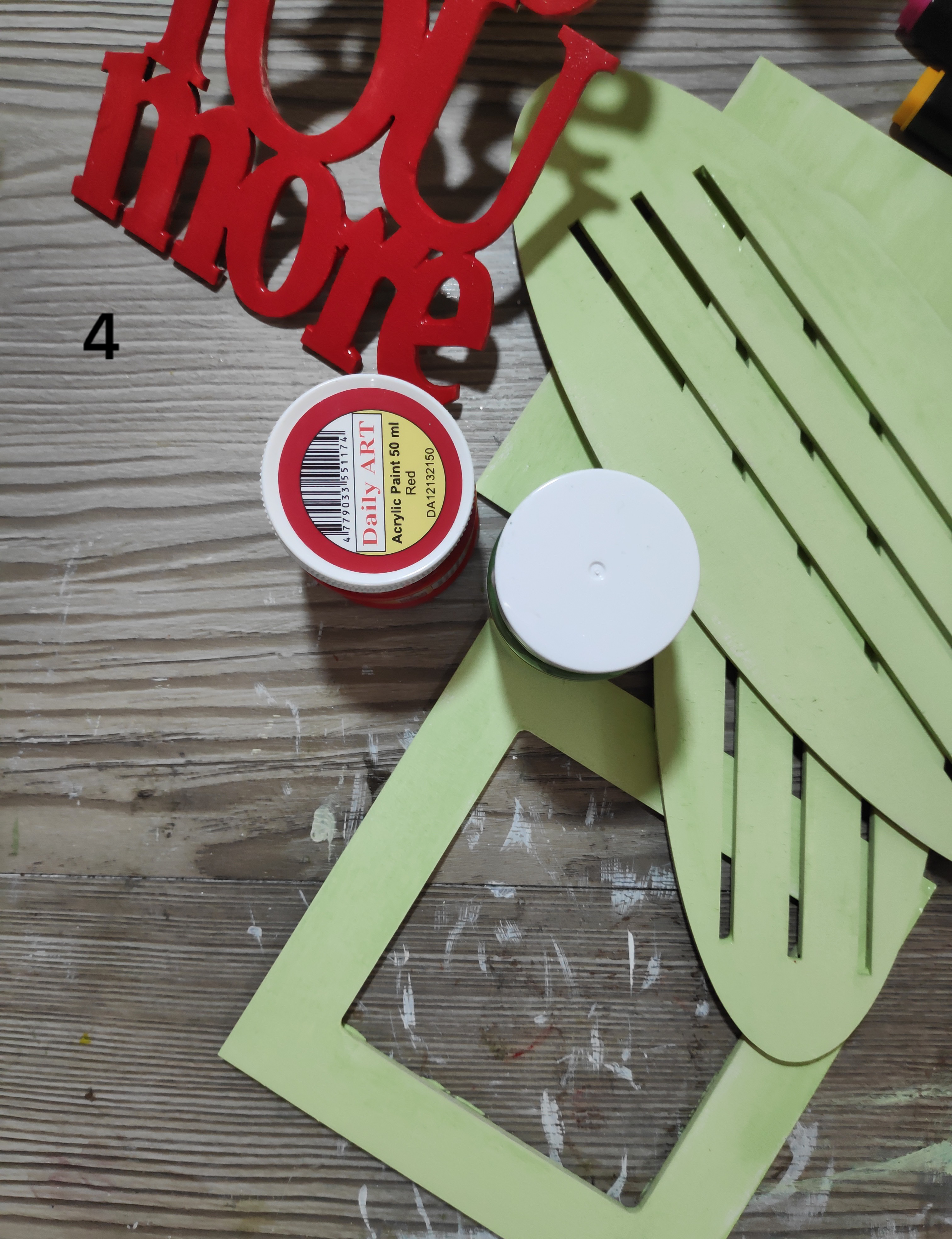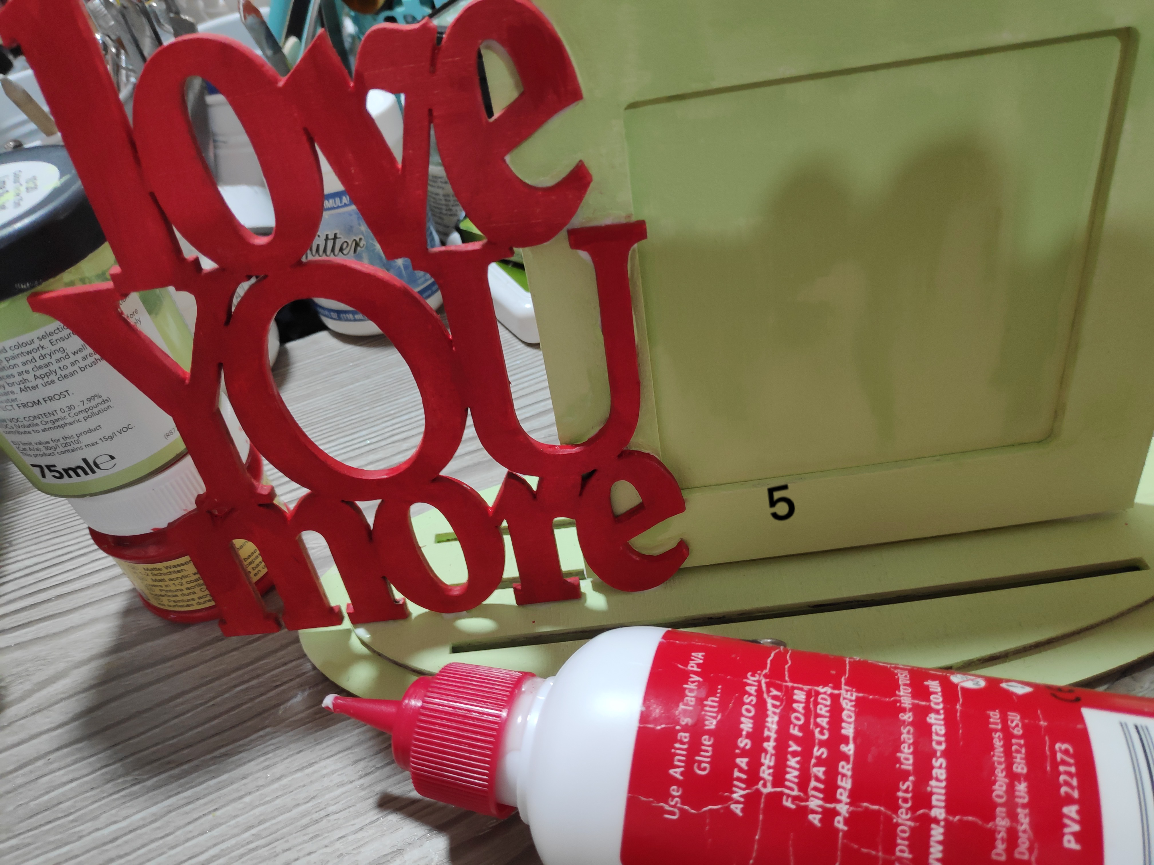 I have used Green Acrylic paint to colour the wood frames and red Acrylic paint to colour the Wood Quote which reads “Love you more”.