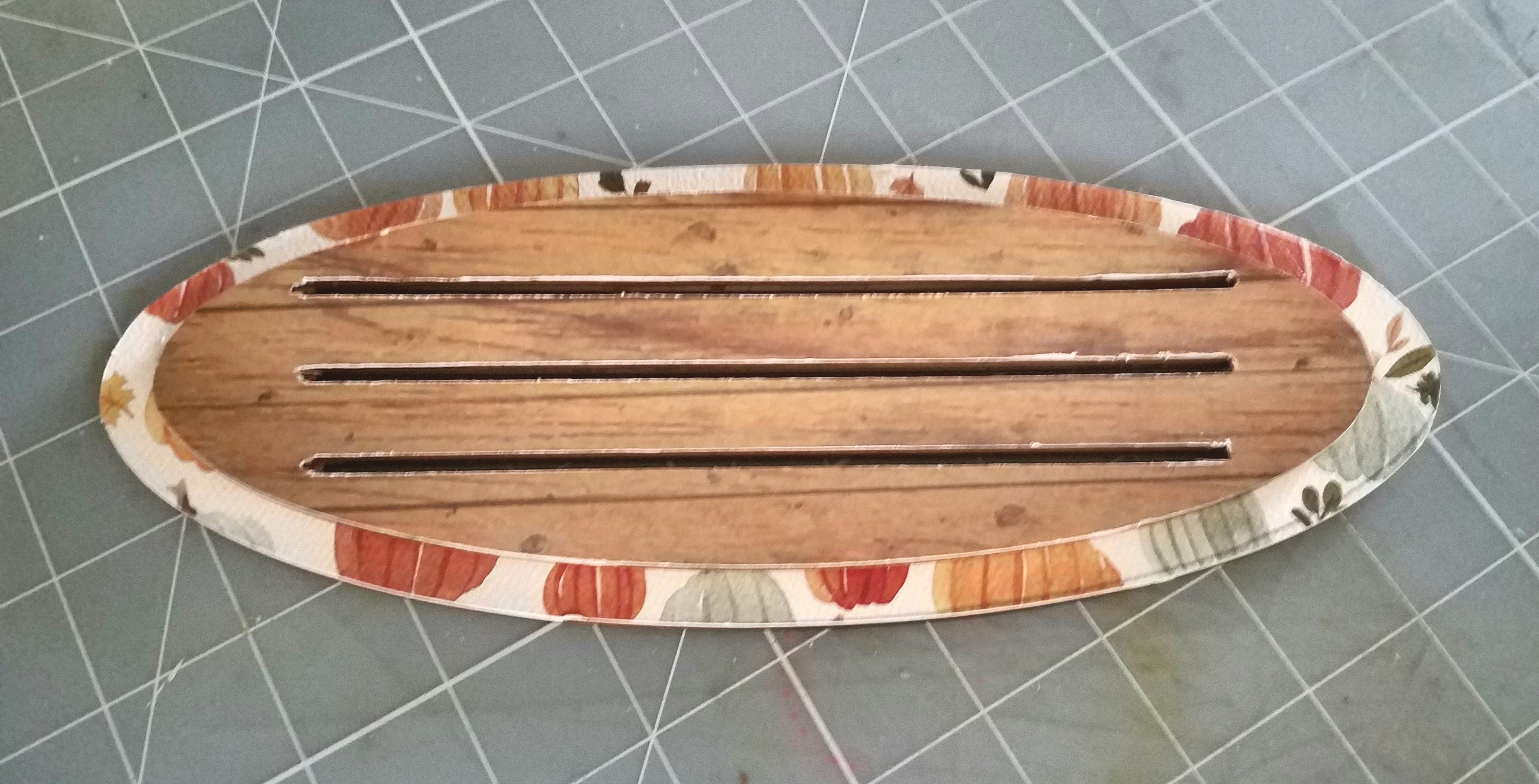 To start off, take out the 2 base pieces from your package. I chose to trace my wood bases onto patterned papers. But feel free to paint them if you like. The papers I'm using for this project are from Carta Bella Hello Autumn collection. After tracing, cut them out and glue your papers onto both bases. I recommend Beacon 3 in 1 glue to adhere your papers to your base. Using an exacto knife, trim away any excess paper. Also make sure you cut out your 3 slots on top. You can smooth all edges with a sanding tool or distress tool. Make sure all your slots are clear of any excess paper. Then lining up your slots, glue the two base pieces together.