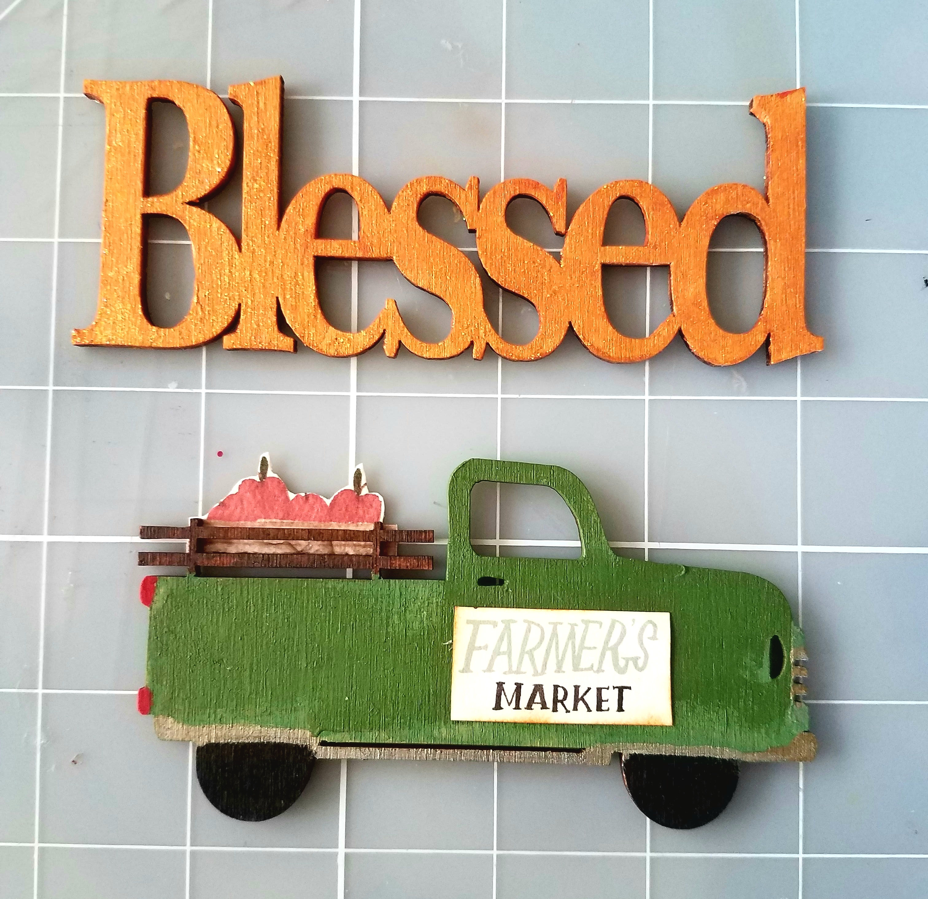 Next take out your Word/truck pieces from your package. I painted my Blessed words with Orange glitter acrylic paint. And for my truck I painted the body with Shamrock green acrylic paint. I used silver acrylic paint for the chrome bumper areas. Red for the back taillights. I applied brown acrylic paint to the back fenced area of the truck. Let dry. While your pieces are drying, I fussy cut some apples from one of the journaling cards and glued behind the wood fence at the back of the truck. Then I fussy cut the Farmers market sign, inked around the edges before adhering to the side of my truck. Paint the wheels of the truck with black acrylic paint.
