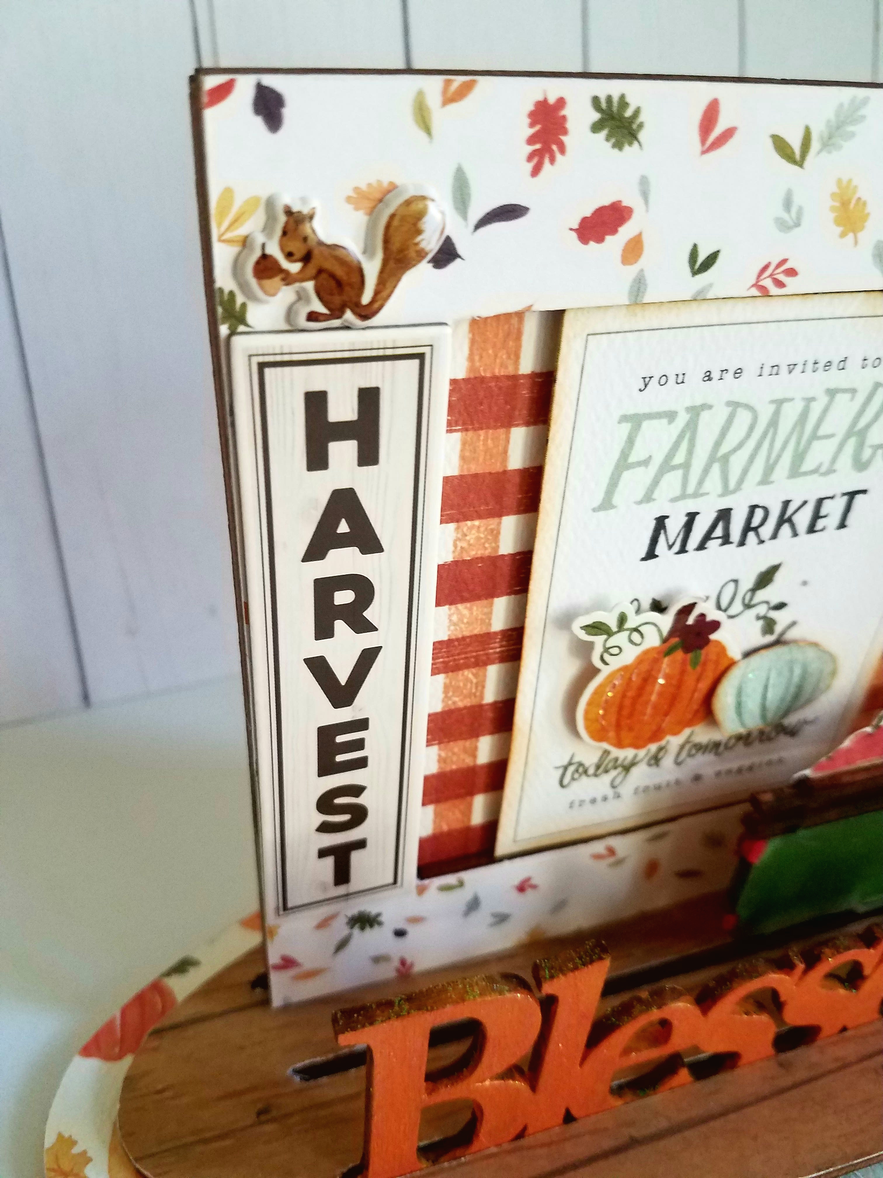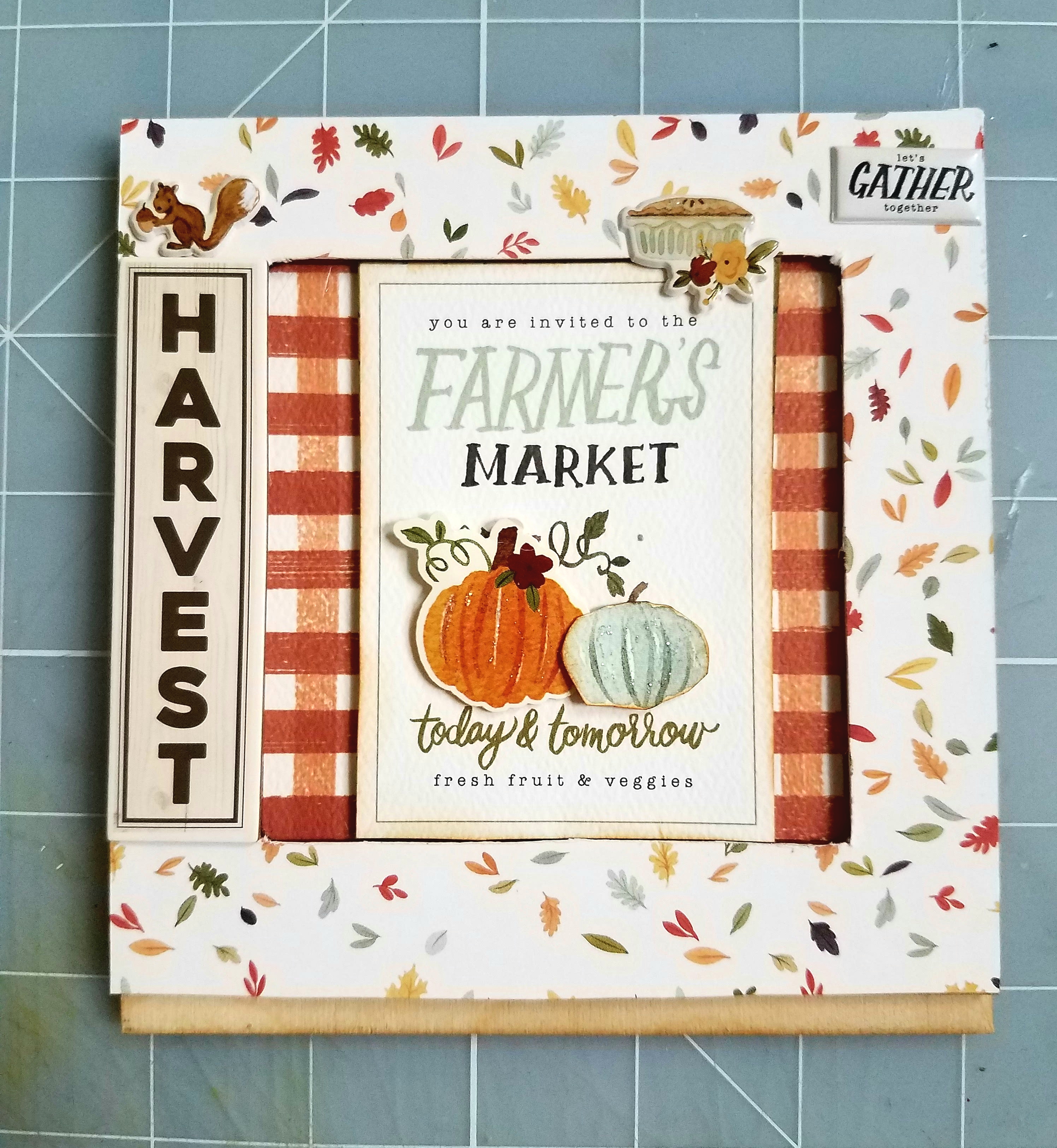 To finish off my 3D frame I decorated with a few puffy stickers and chipboard Harvest sticker along the left edge of my frame.
