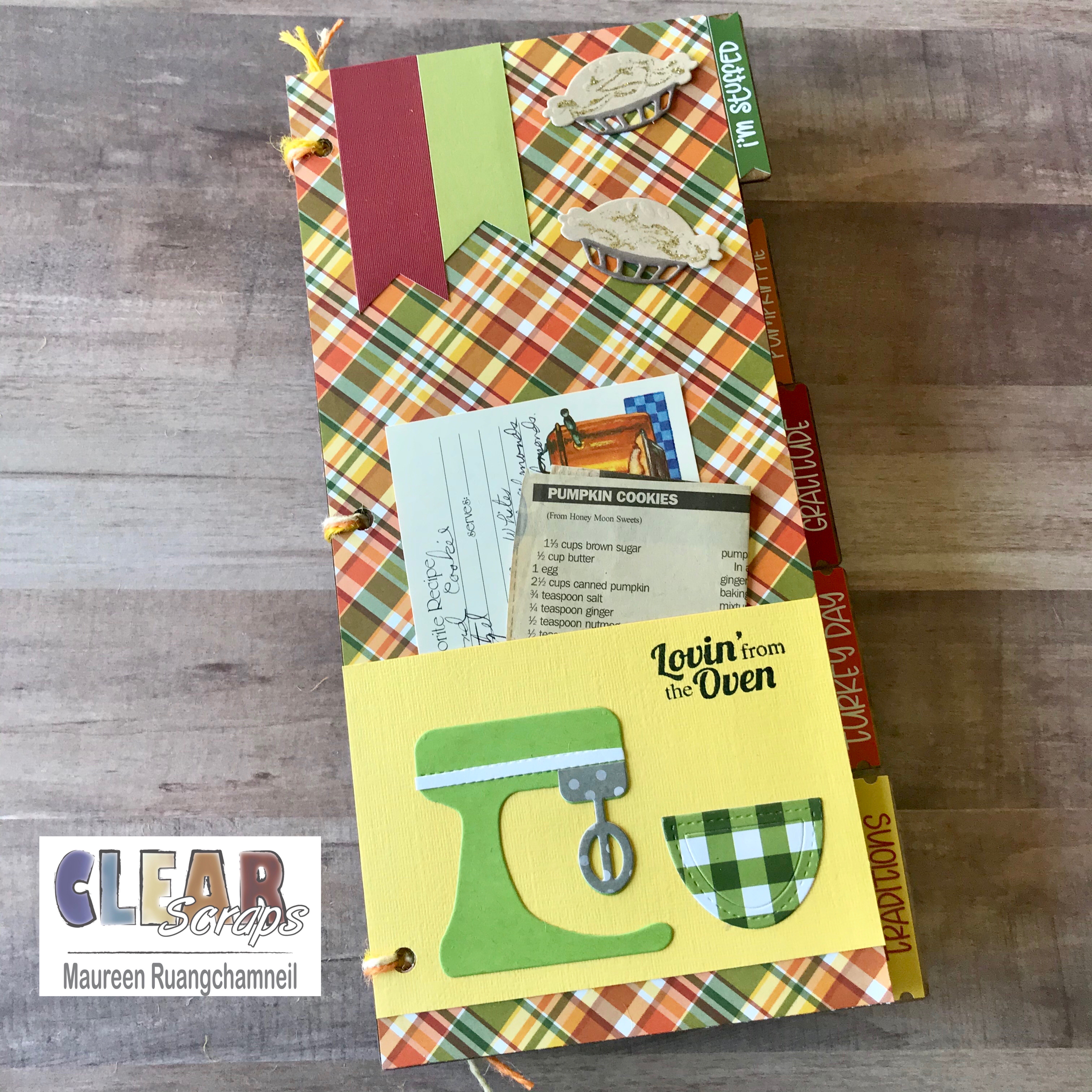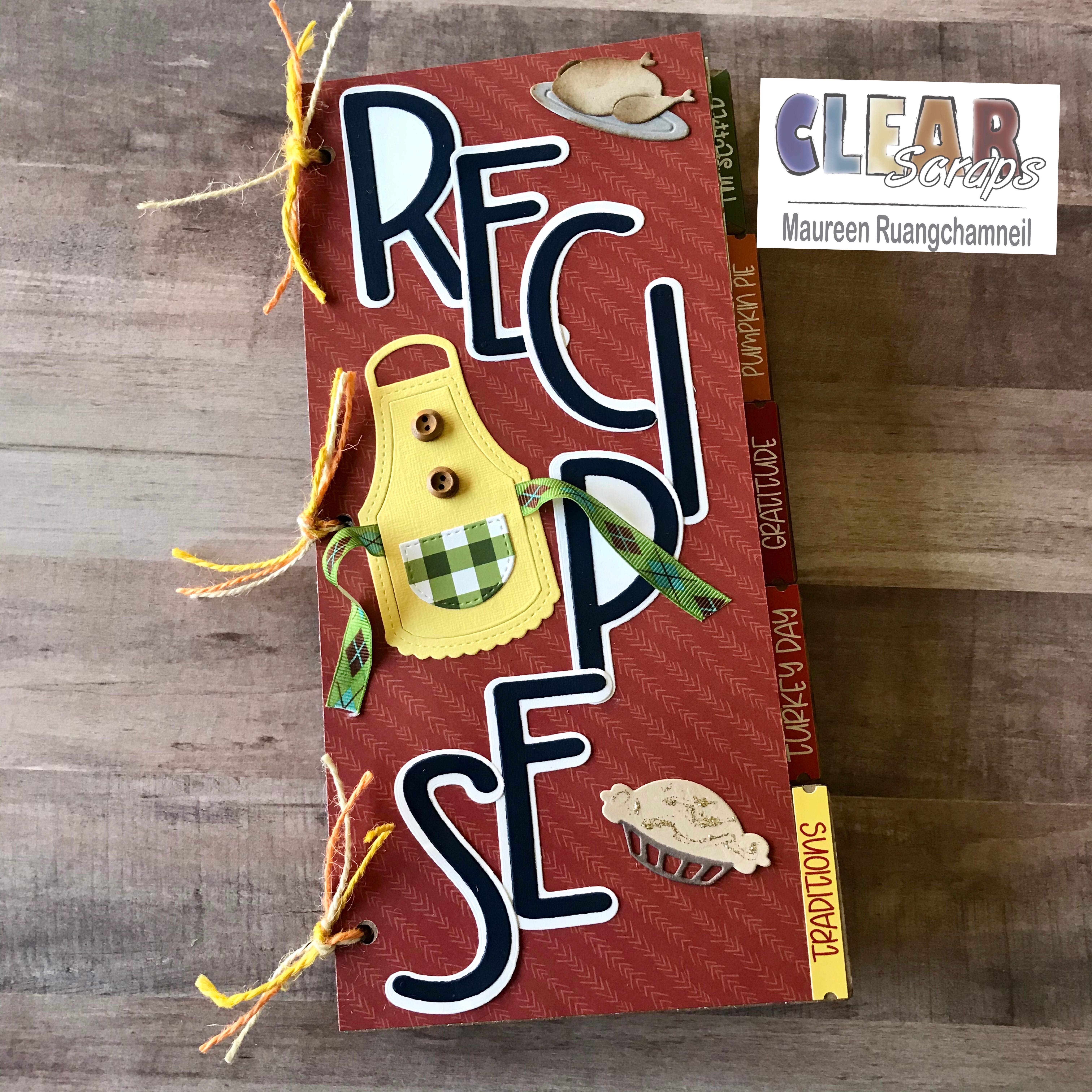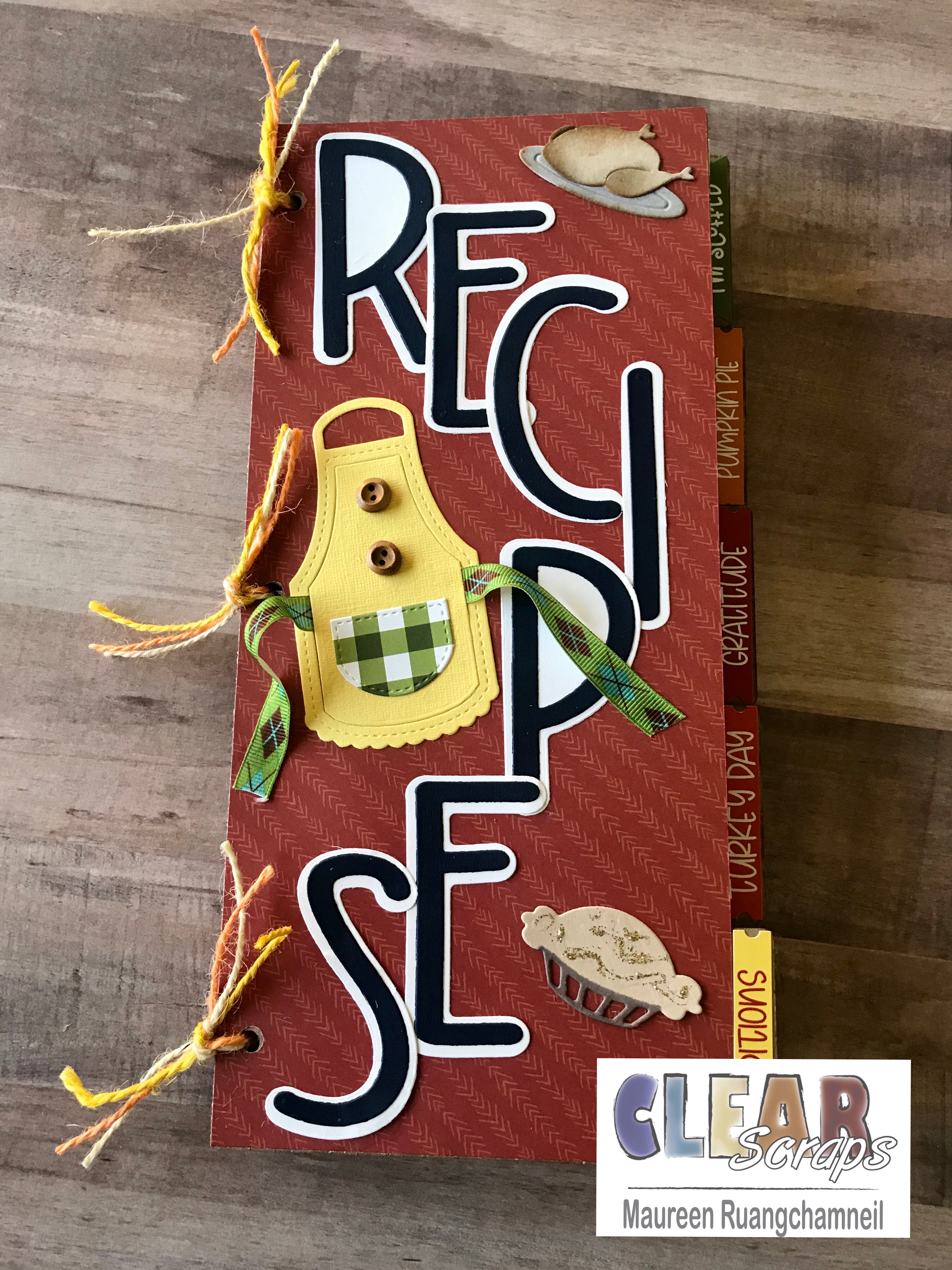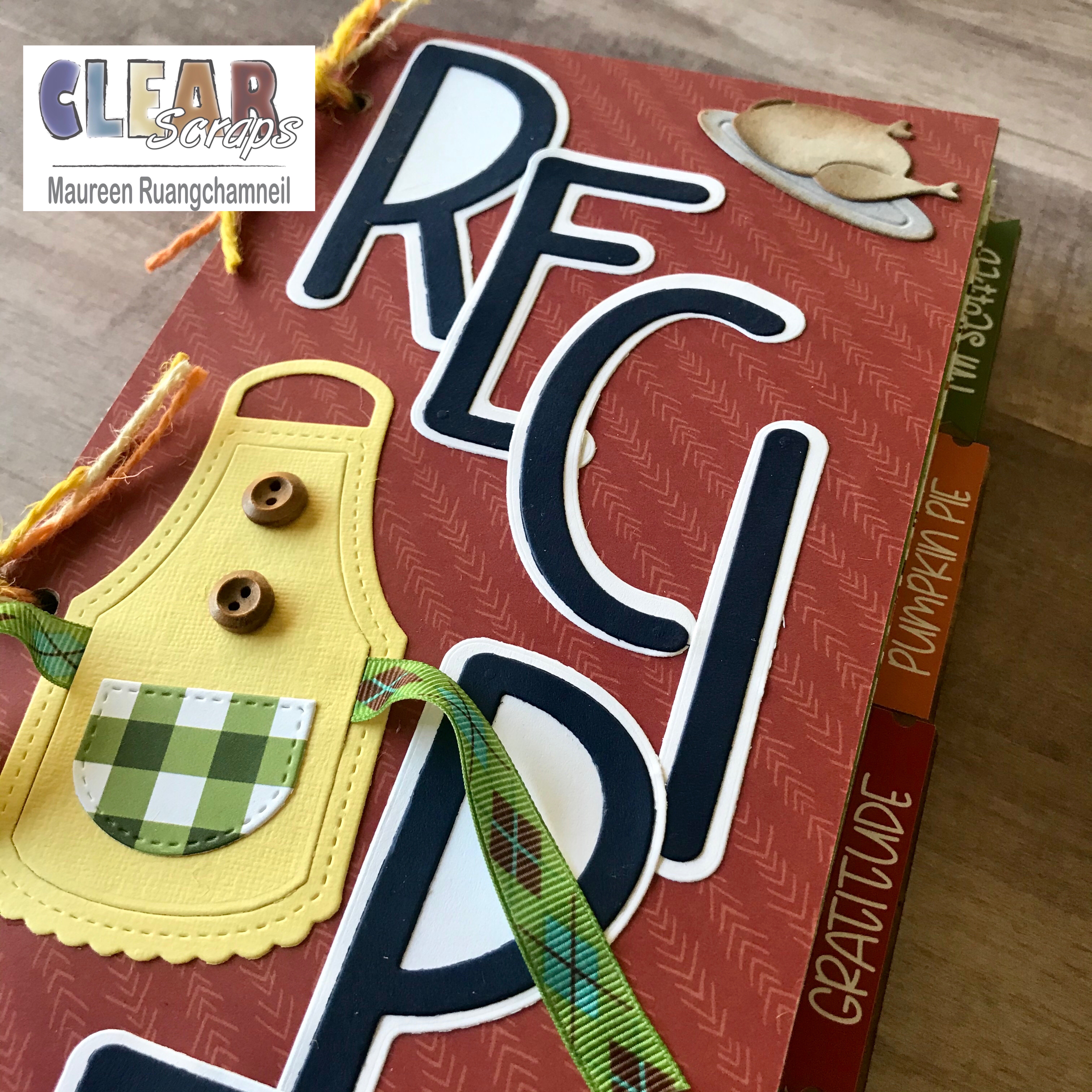 For the cover, I've die cut the letters to spell 'recipe' in a letter set that has a drop shadow, in navy blue and white. I've staggered this down the page, and left room in the open spaces to add additional die cuts, like an apron, turkey and a pie.