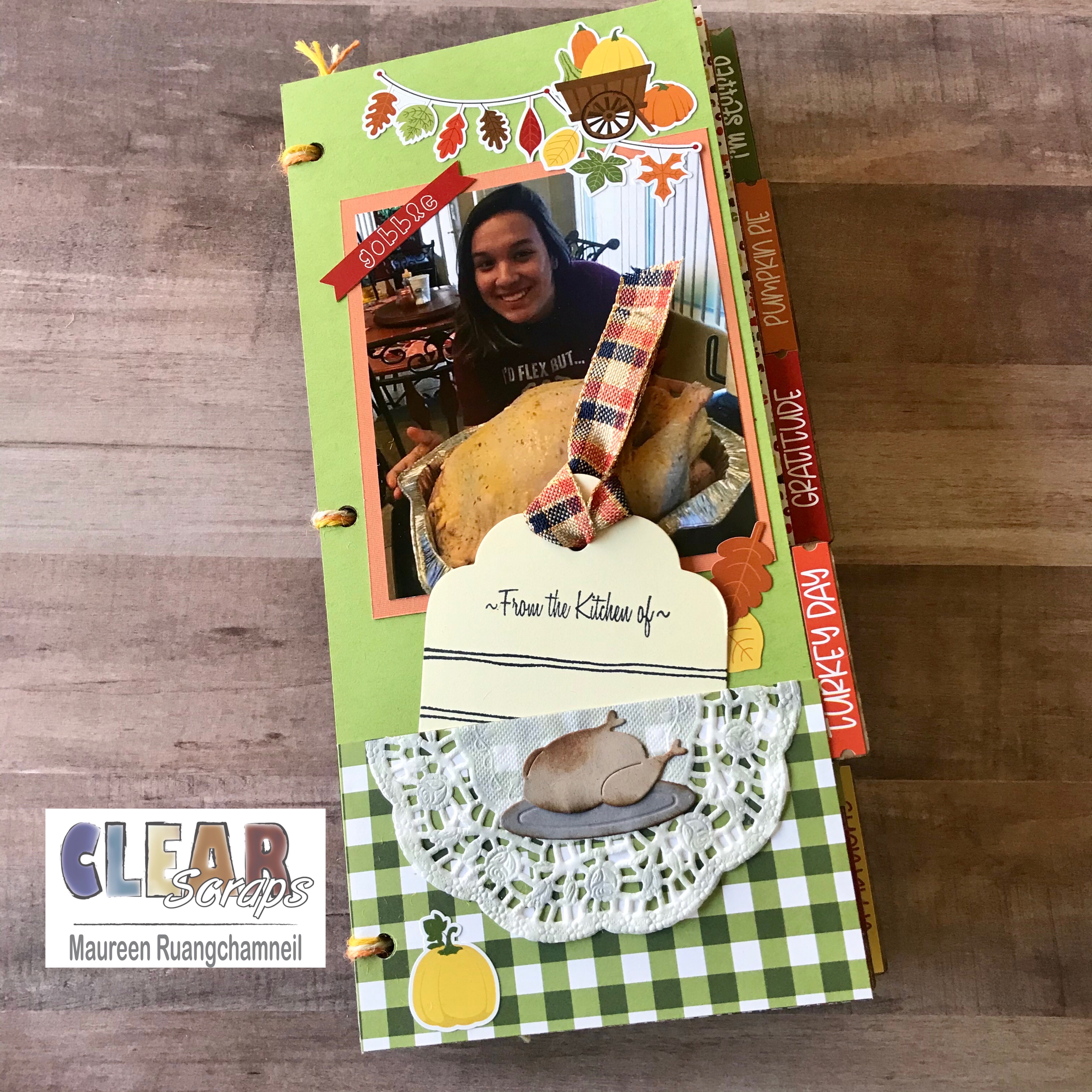 On page 2, I've added a photo of my daughter helping me with turkey prep. It's also got a pocket at the bottom and an empty recipe tag shaped like a gift tag.