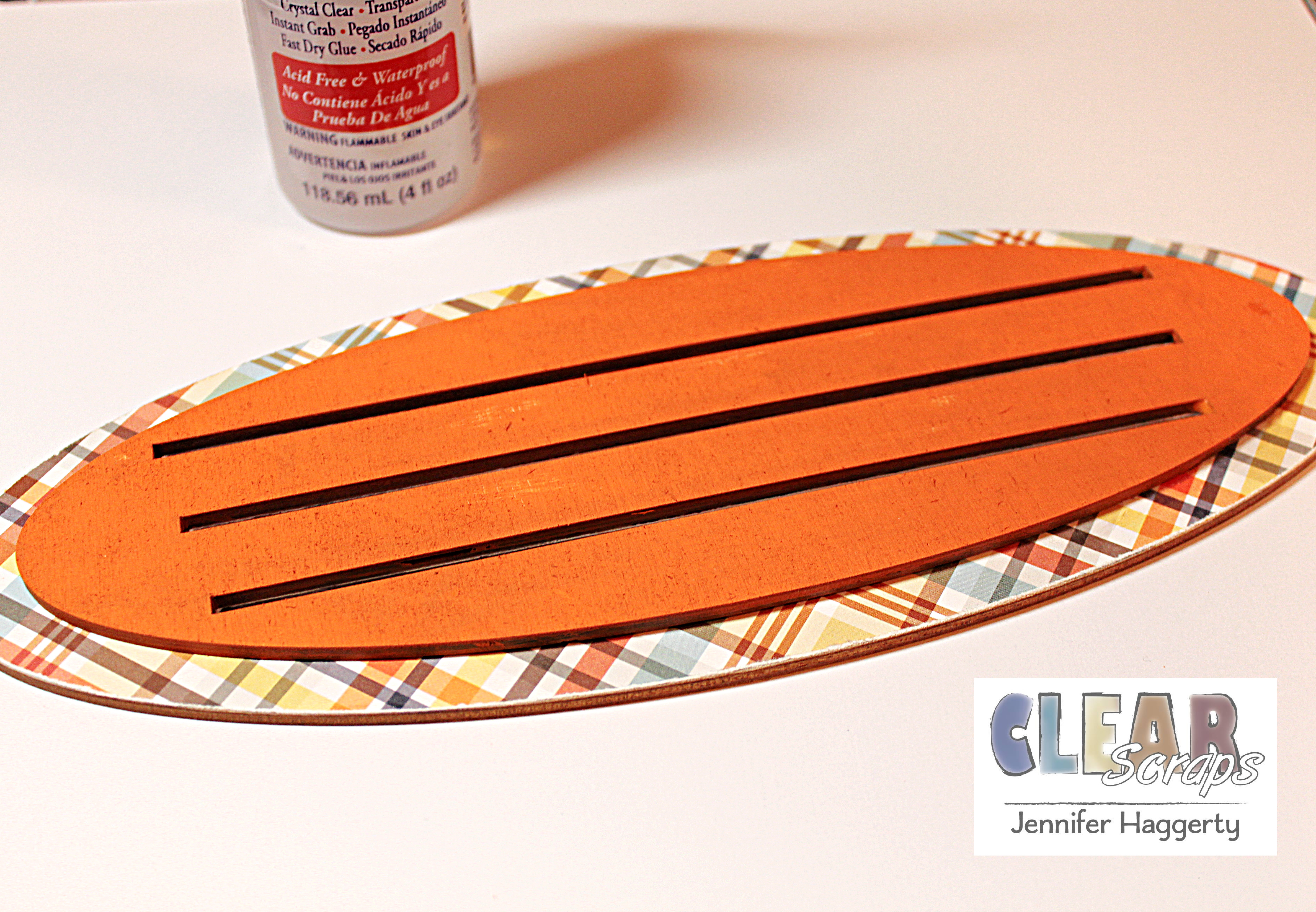 I began by using my Beacon 3-in-1 Adhesive to affix patterned paper to the Deco Frame as well as the larger oval of the Wood Base. I cut away excess paper with scissors and an x-acto knife. I then used my sanding stick to smooth edges between the paper and wood.