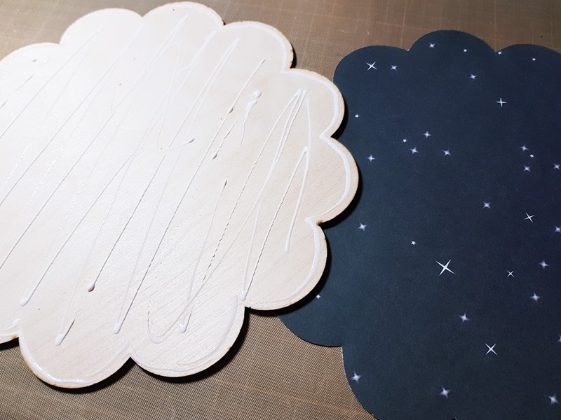▼ I started by laying the wood shape on patterned paper, tracing it with a pencil, and cutting it out with scissors. Then, I applied tacky glue to adhere the cut-out piece to the wood shape as the background. The papers and ephemera I used for today's project are from the Echo Park Paper with the Away in a Manger collection.