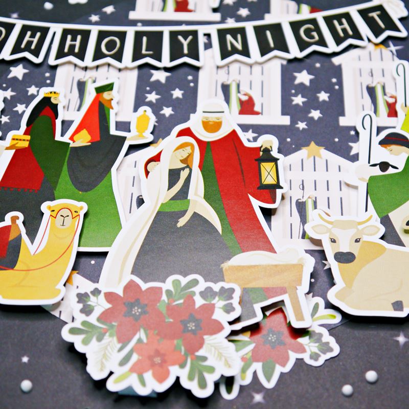 ▼ Then, I used these stickers from the collection to decorate around the wood shape for the Nativity scene. Adding the depth to the layering, I used double-sided adhesive foam to adhere the ephemera to each layer.