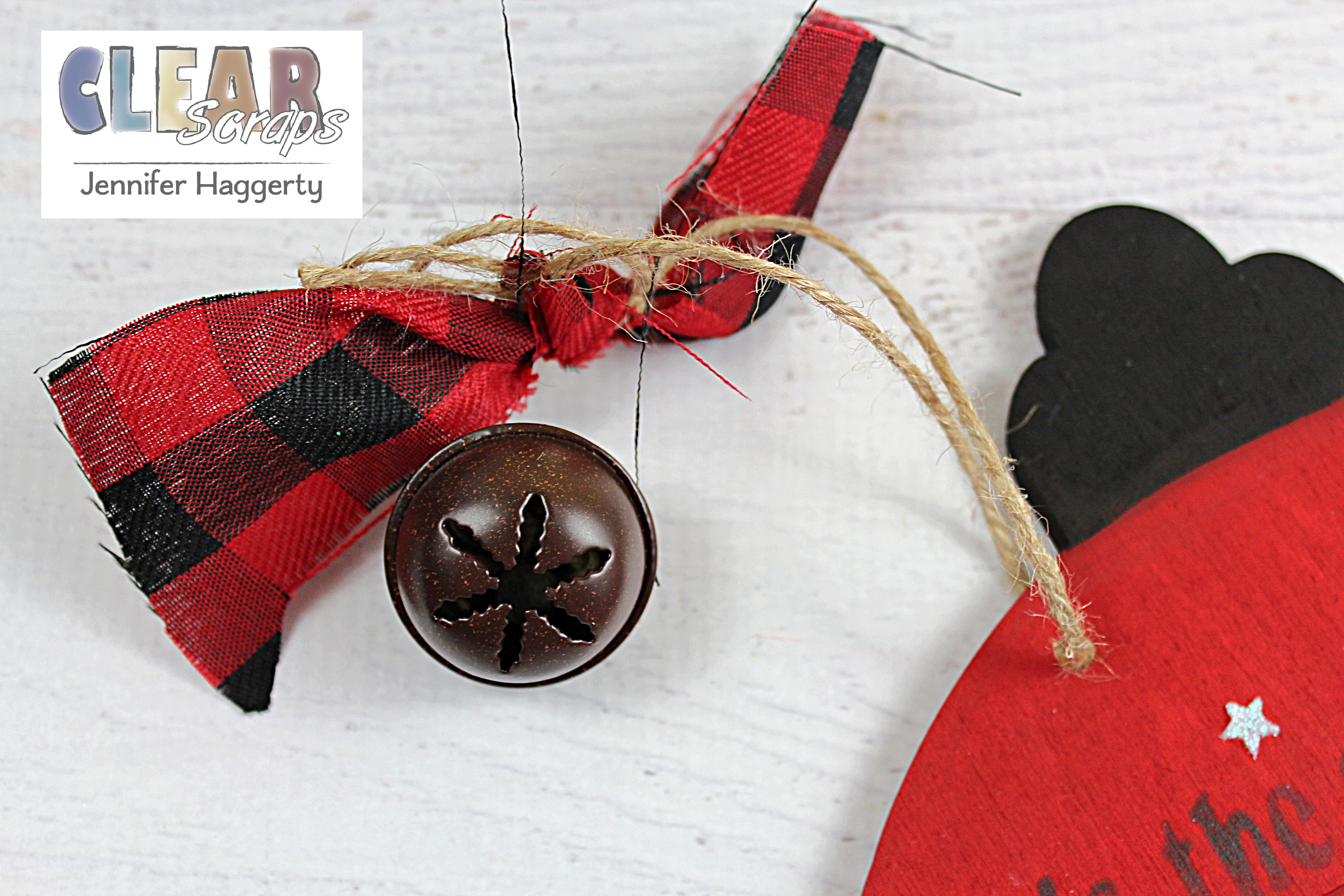 Last, I punched a hole in the top left of my pallet and strung jute through to hang. I attached buffalo plaid ribbon and a bell to accent.