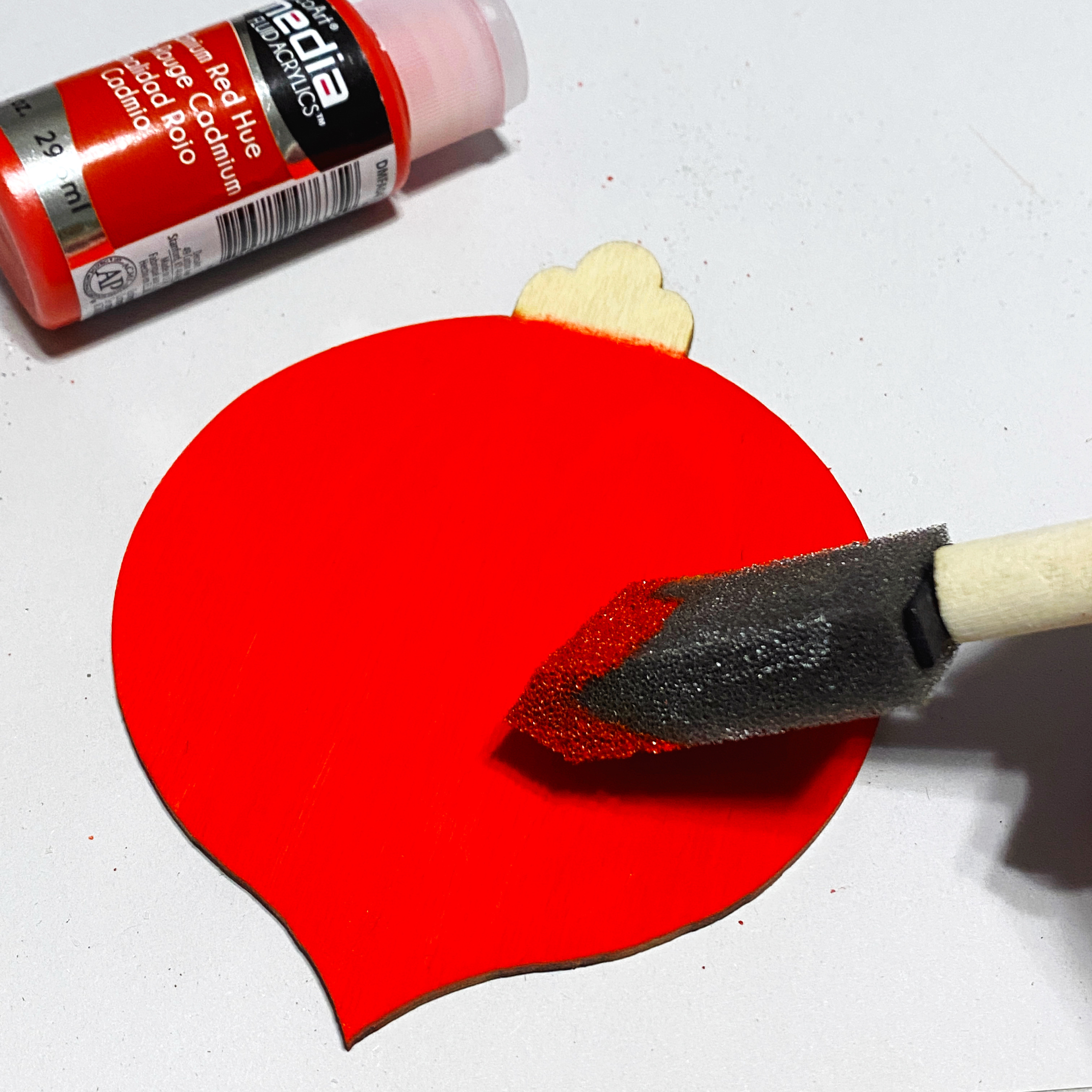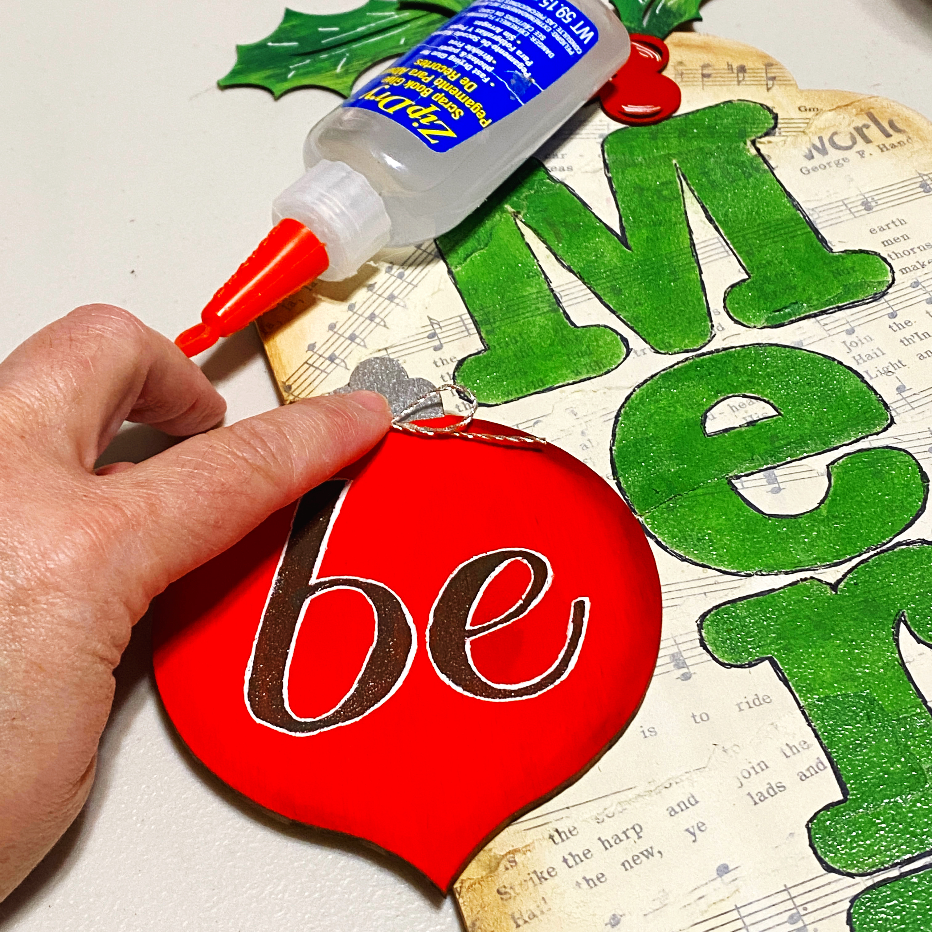 I painted the ornament from the Wood Holiday Shape Collection red, then used a dark Charcoal Pigment Ink to stencil "be" at the center. I used a stiff detail brush (a beauty swab works) to fill in the spaces in the letters with ink. (I did the same thing on the "e" in "Merry". I also embossed the word…