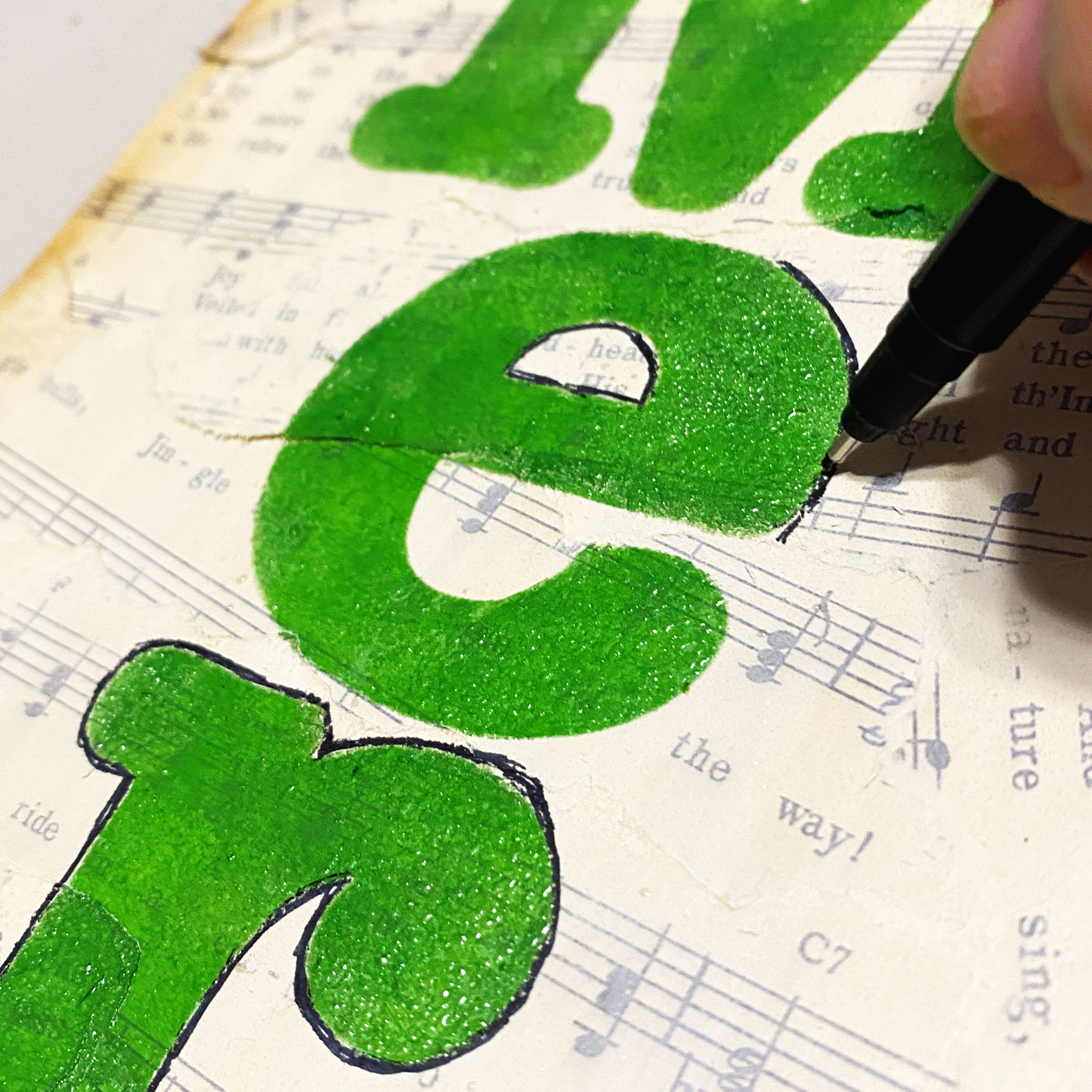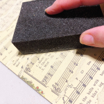 To age and mute the music a bit, I first sanded it with a sanding block, then painted it with some diluted white paint. The edges were also distressed with chalk ink…