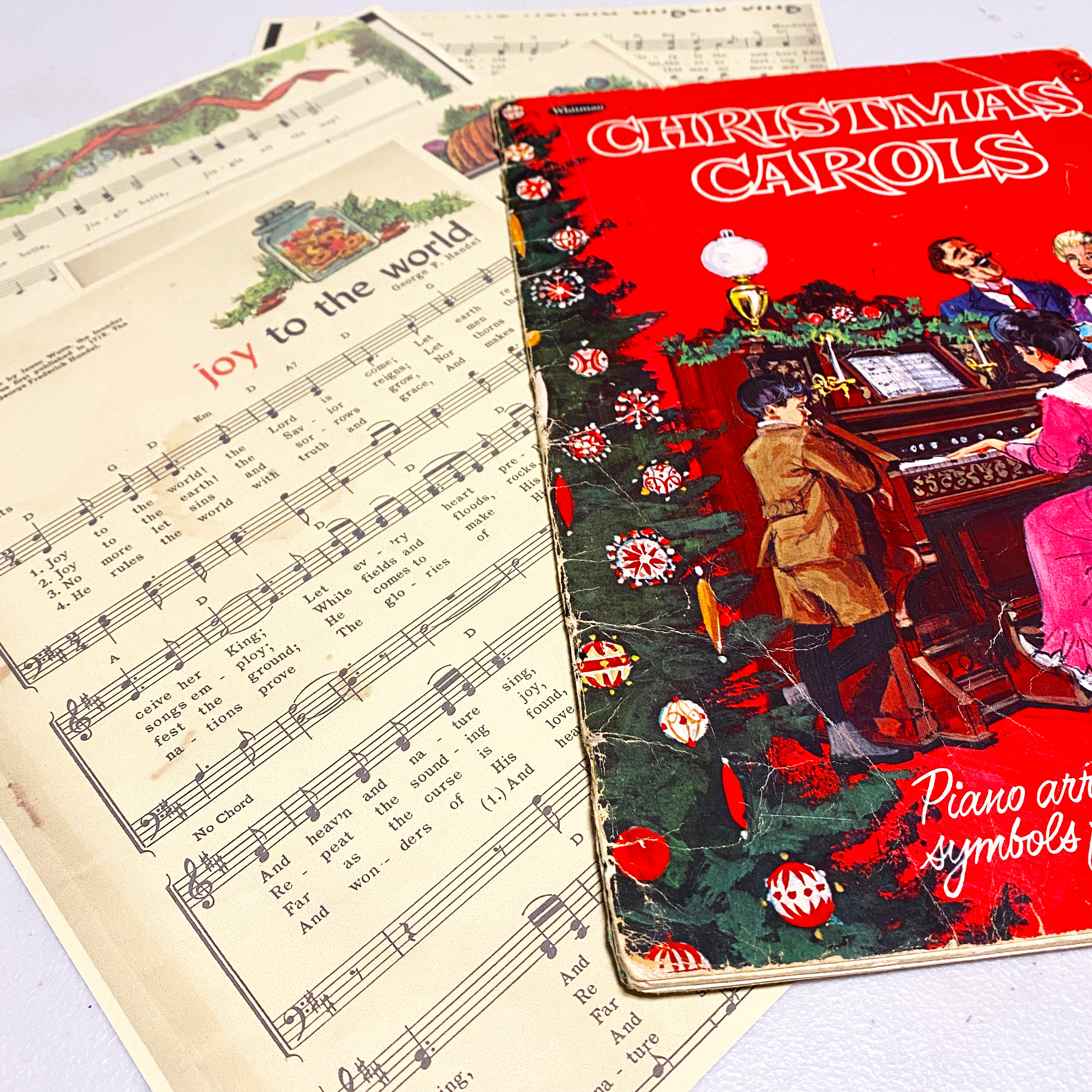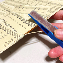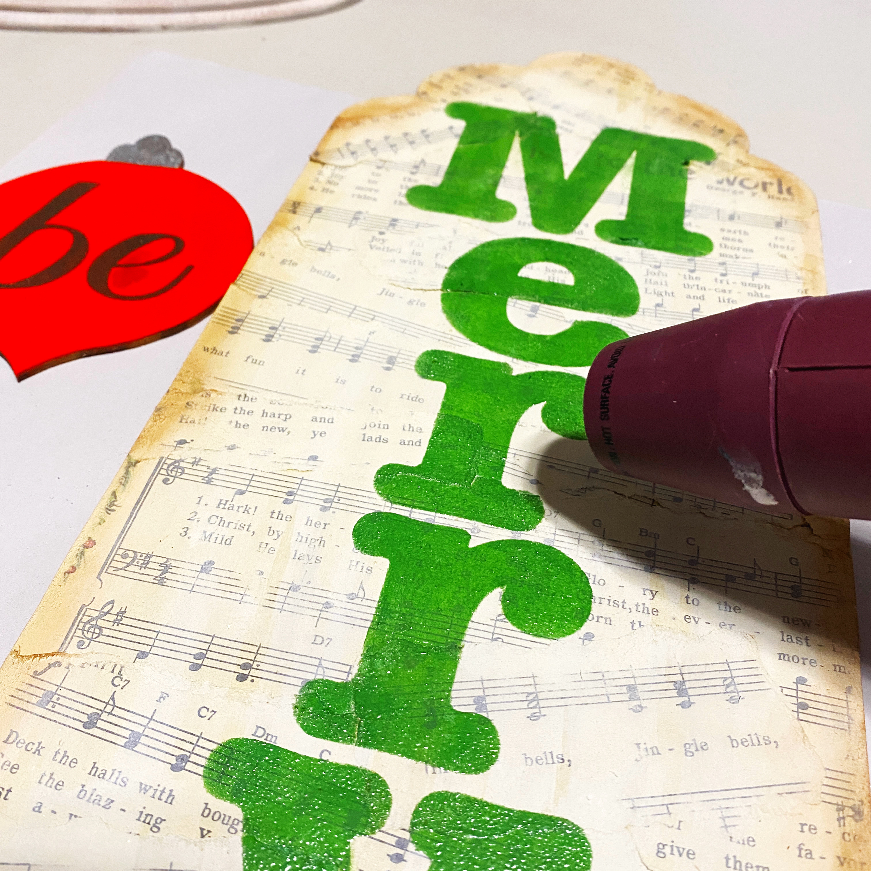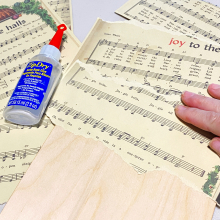 I started by making color copies of some vintage Christmas music I had. (I'm telling my age, but that book was MINE when I was a child taking piano lessons!) Then I tore strips from the papers and adhered them to the tag. The excess paper was trimmed, then I used the Sanding Stick to finish removing the paper from the edges…
