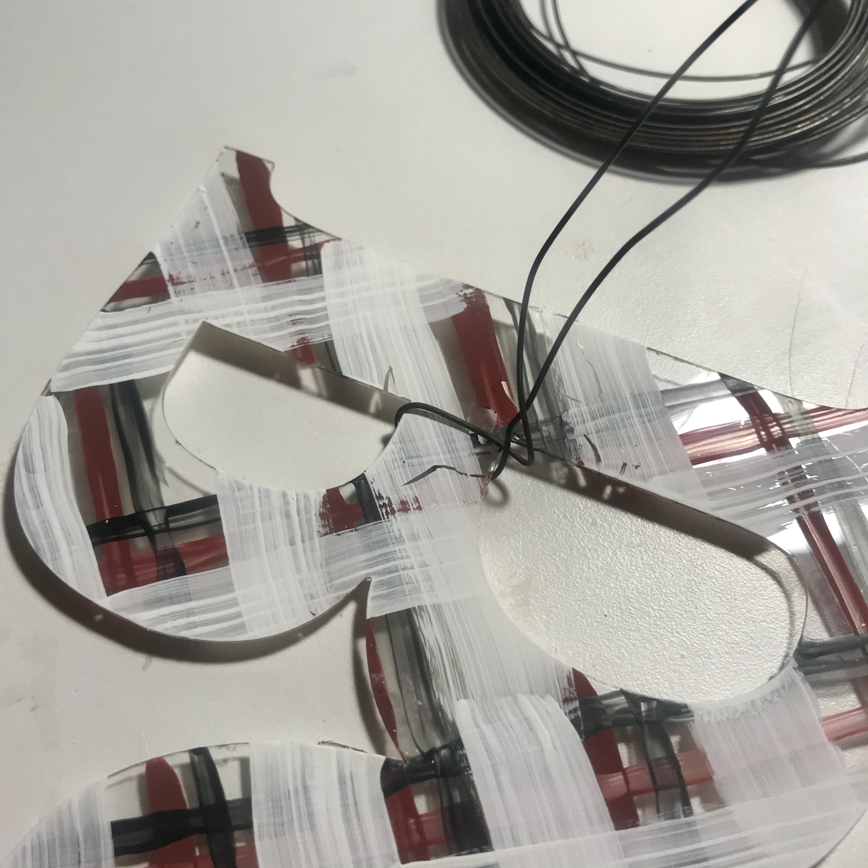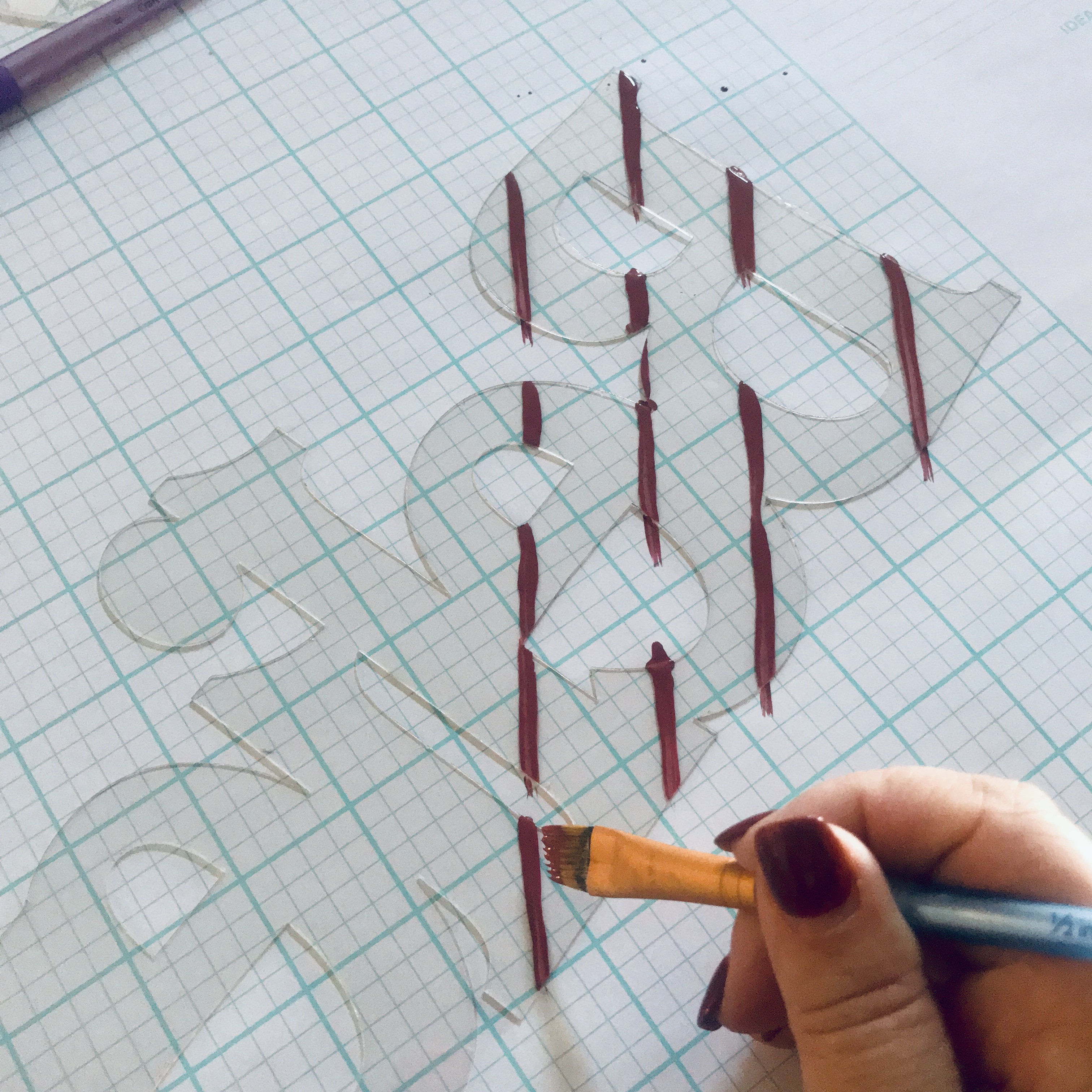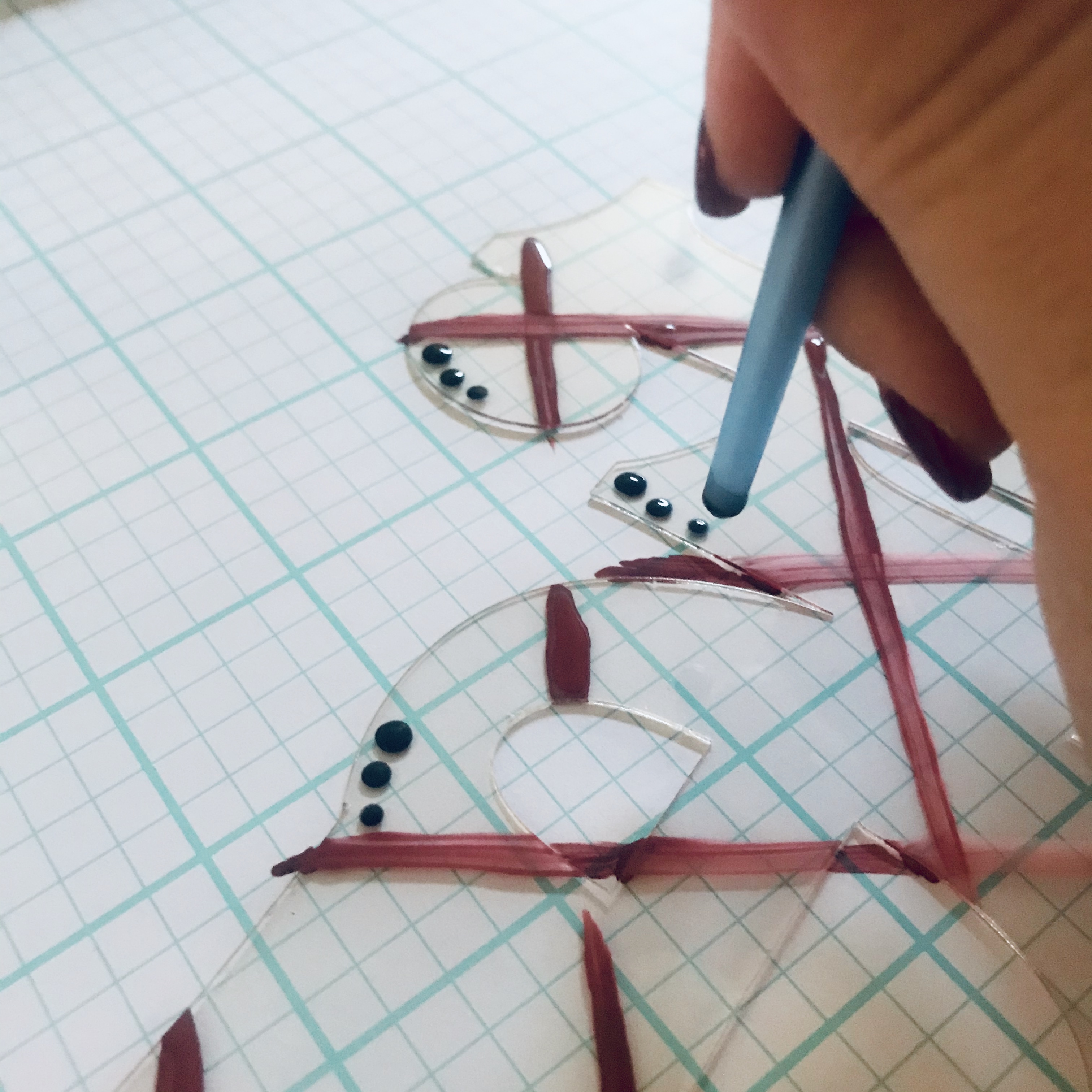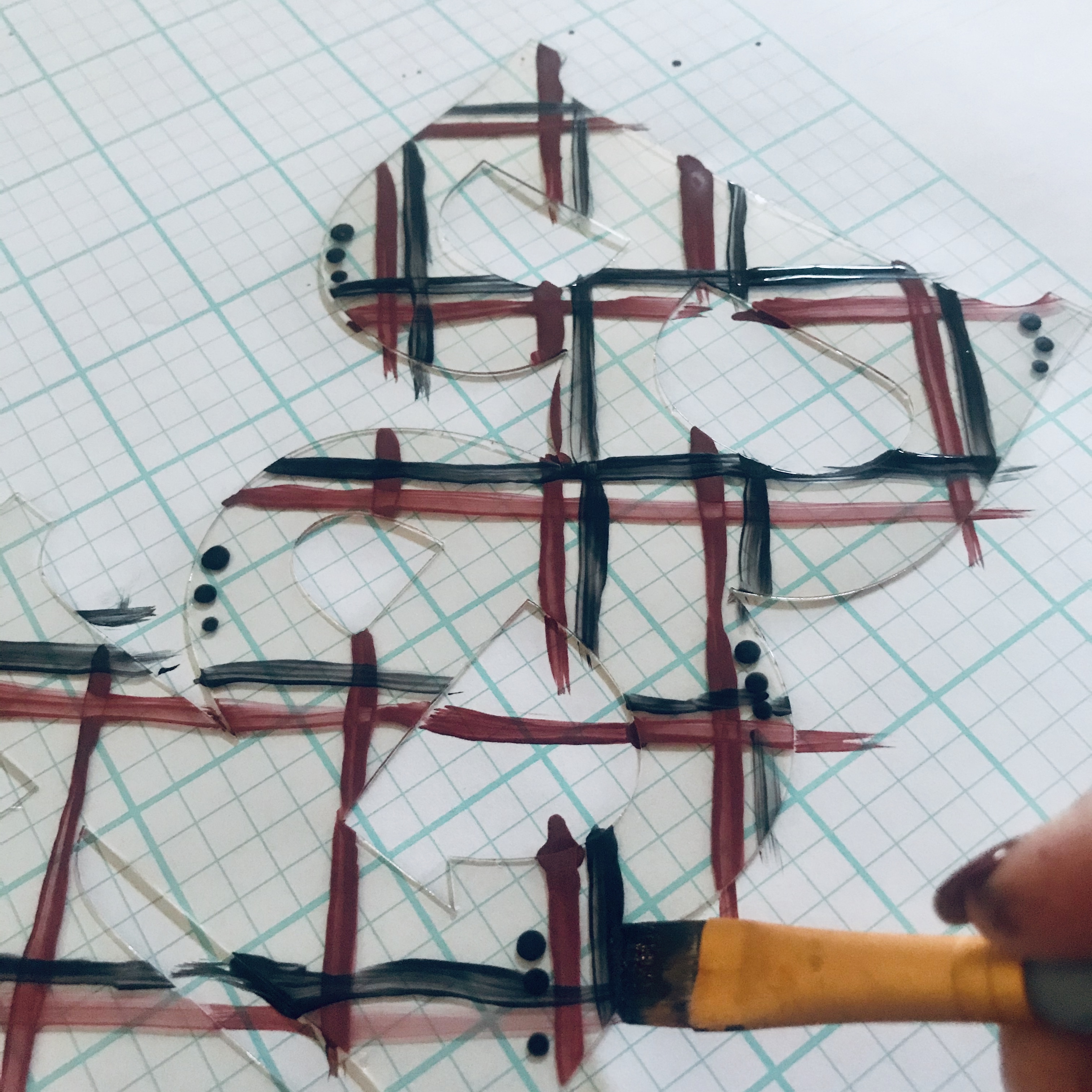 The first thin red stripes went diagonal in one direction and then crossed in the other direction. I let this dry completely, then moved to making thin black stripes going in the same directions.