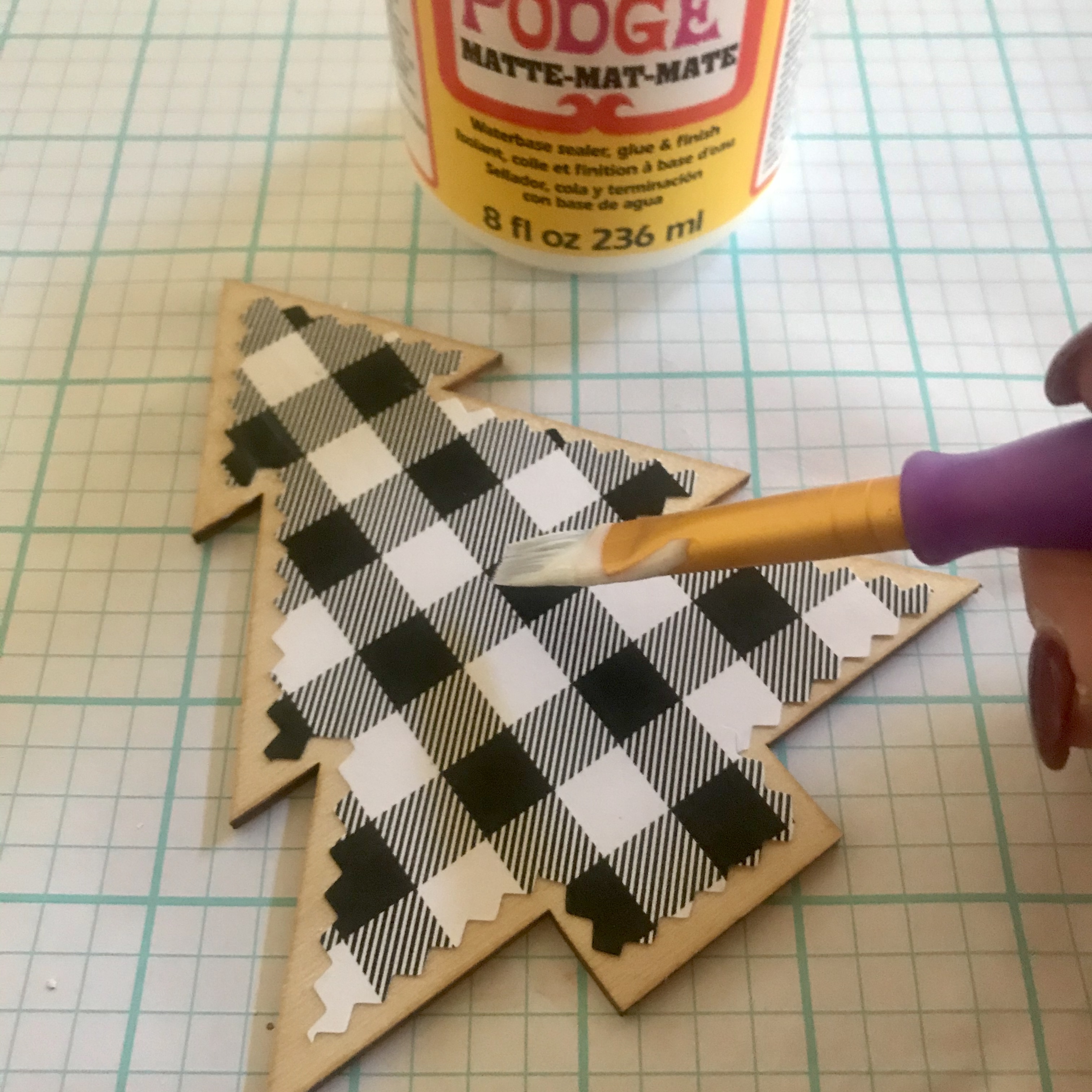 It was time to decorate the Holiday Wood pieces next. I chose to cut 2 Christmas trees with a pinking shears and decoupaged the fronts in a black and white checkered printed paper.