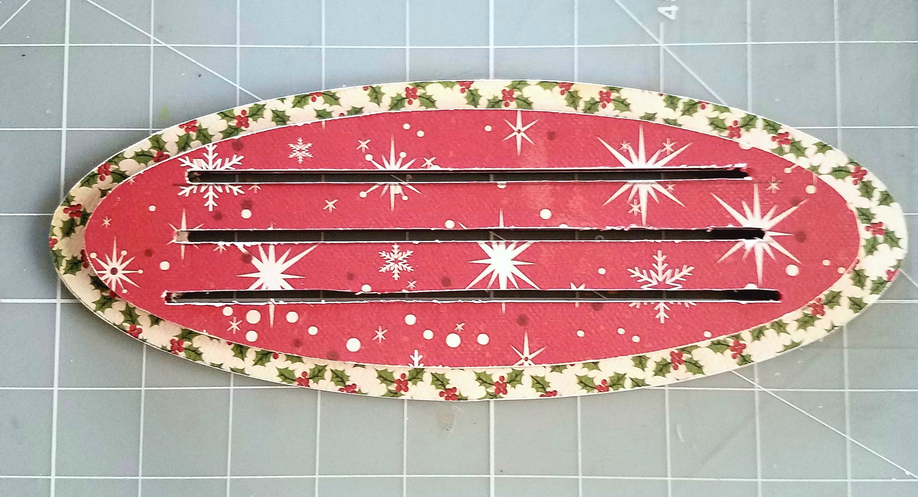 I trimmed all along the edges of both bases using my x-acto knife. Then distressed edges till smooth. I prefer using Clear Scraps sanding tools Click Here Make sure to sand in between each of the slits on top of both bases till smooth and clear of any excess paper. Then glue both bases together using Beacon 3 in 1 glue. Set aside to dry.