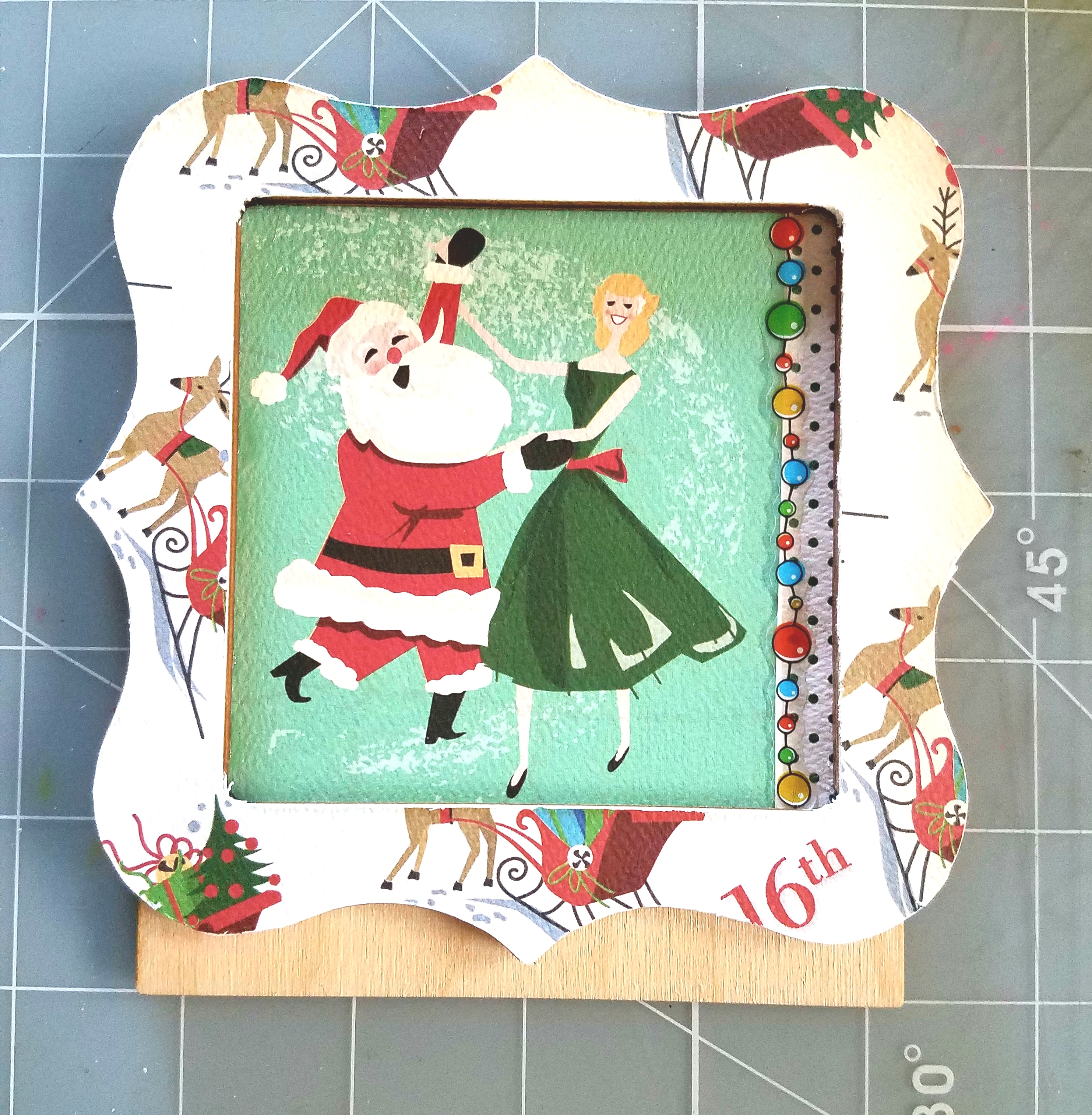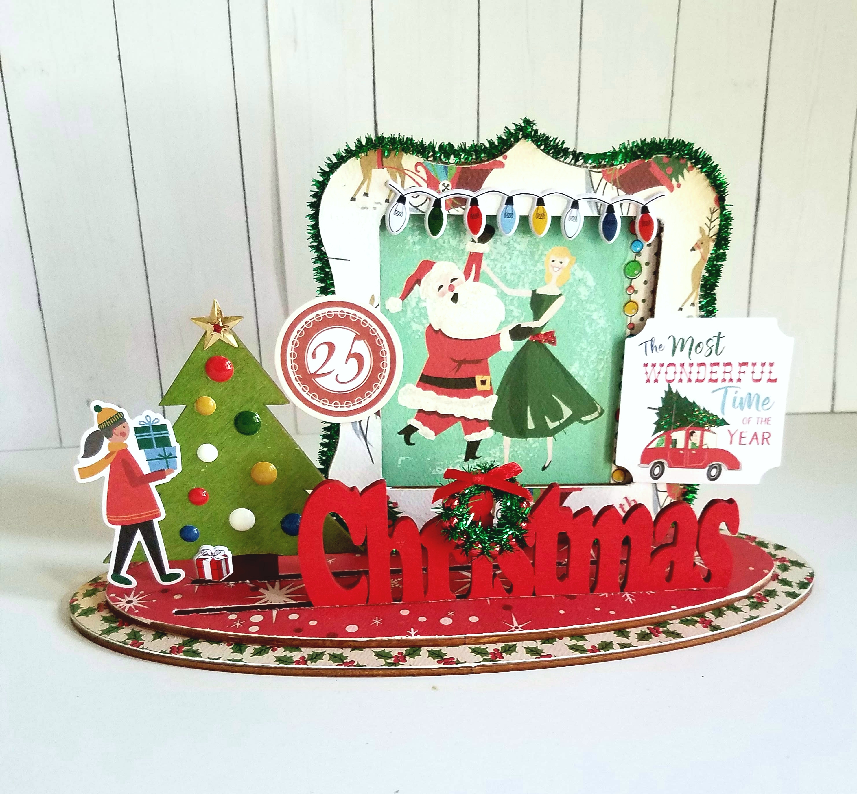 Now the fun part left to do is decorating your frame and shapes! I glued some green tinsel around my frame edge. Adhered a puffy sticker string of lights at the top of the inside frame. Then added a ephermera 25 and sentiment piece on each side of my frame.