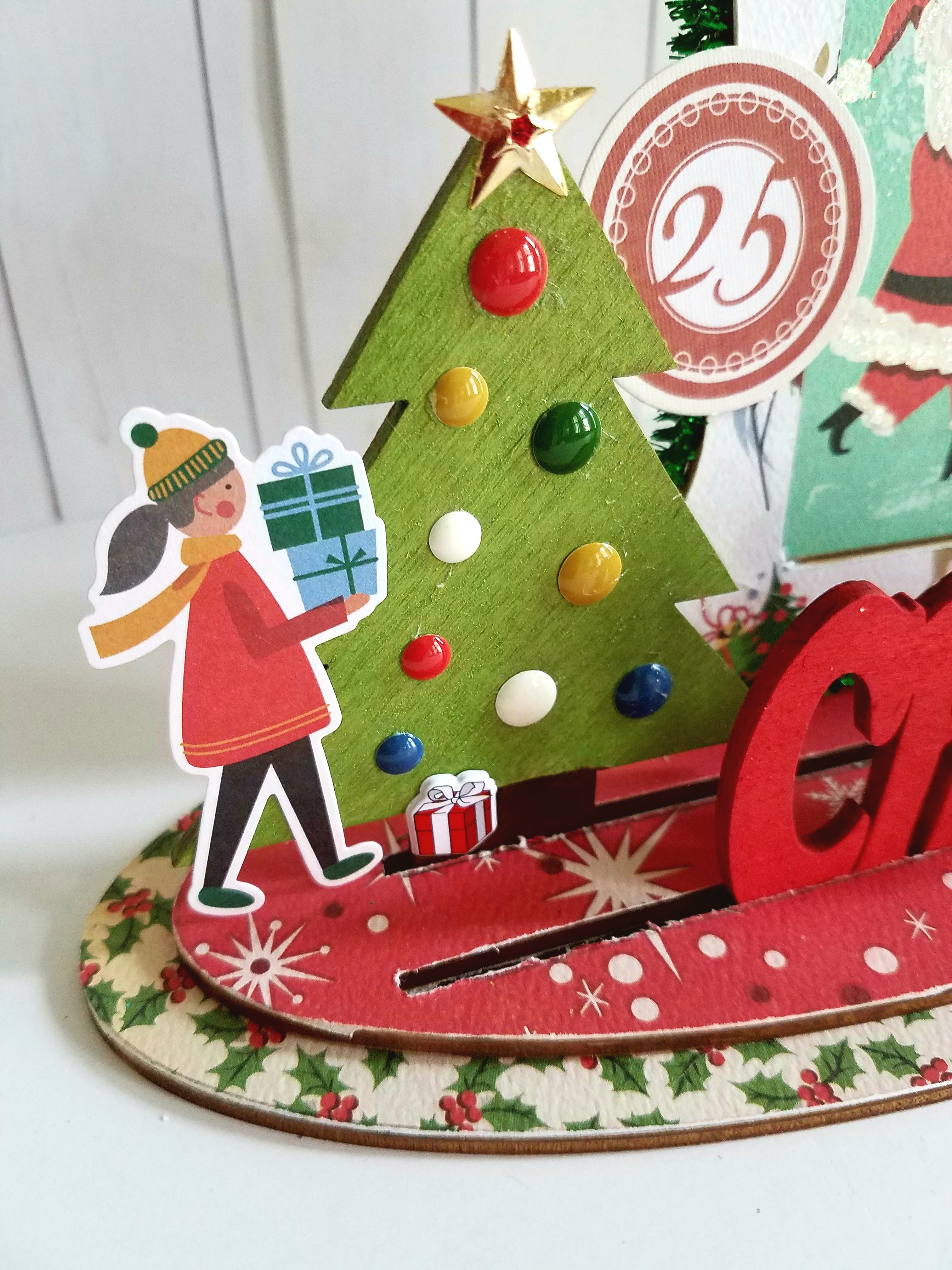 I adhered a Christmas wreath from my stash to the top of my Christmas wood word. And added some enamel colored dots to my Christmas tree to resemble ornaments and a sequin Star at the top of my tree! To finish my project I glued puffy sticker present at the bottom of my tree, along with a ephermera girl image to the left side of my tree. Added some glitter to my Santa fur and beard.