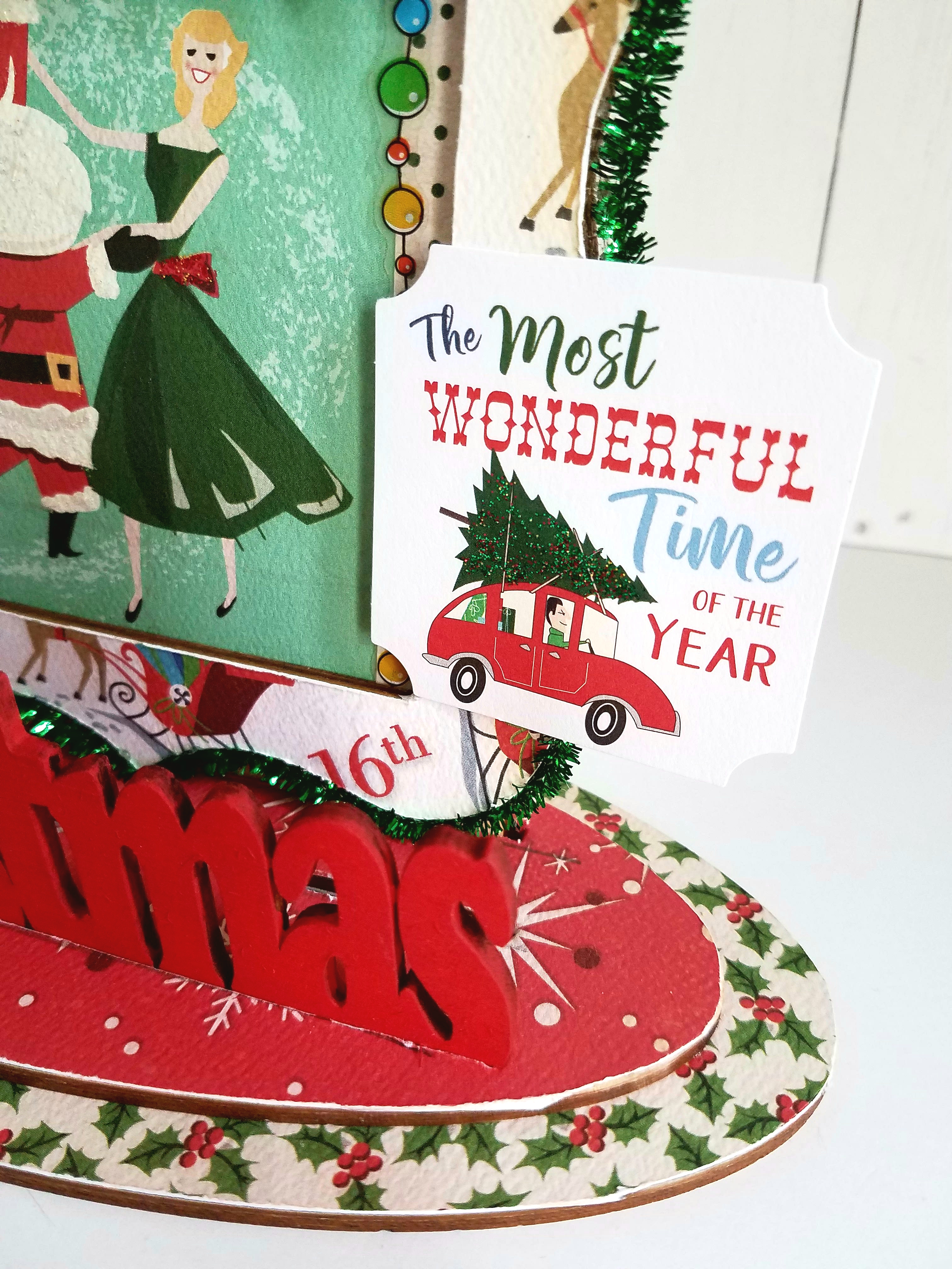 Other Supplies used: Beacon 3 in 1 glue, Carta Bella A Very Merry Christmas collection, green tinsel, enamel dots, sanding tool, xacto knife, Stickles glitter: Diamond and Christmas Red, acrylic paints in Red, Green and Brown.