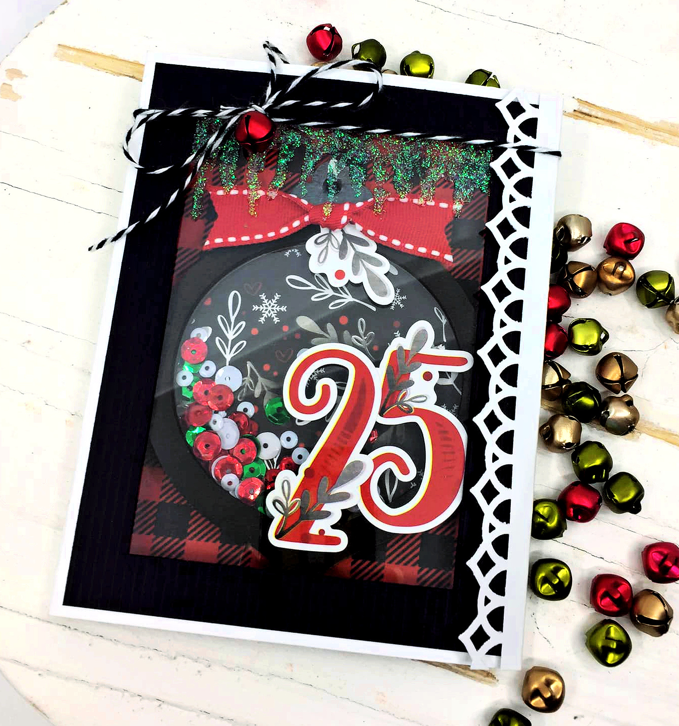 nuvo white blizzard glitter drops, twine, ribbon, edger punch, jingle bell.