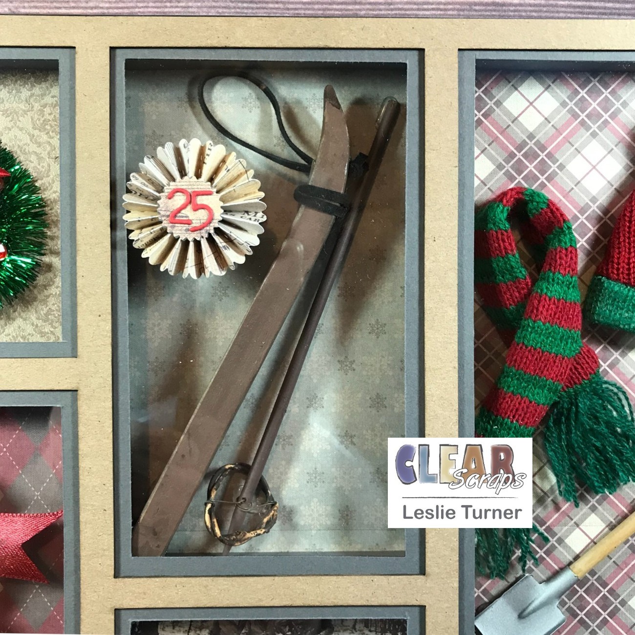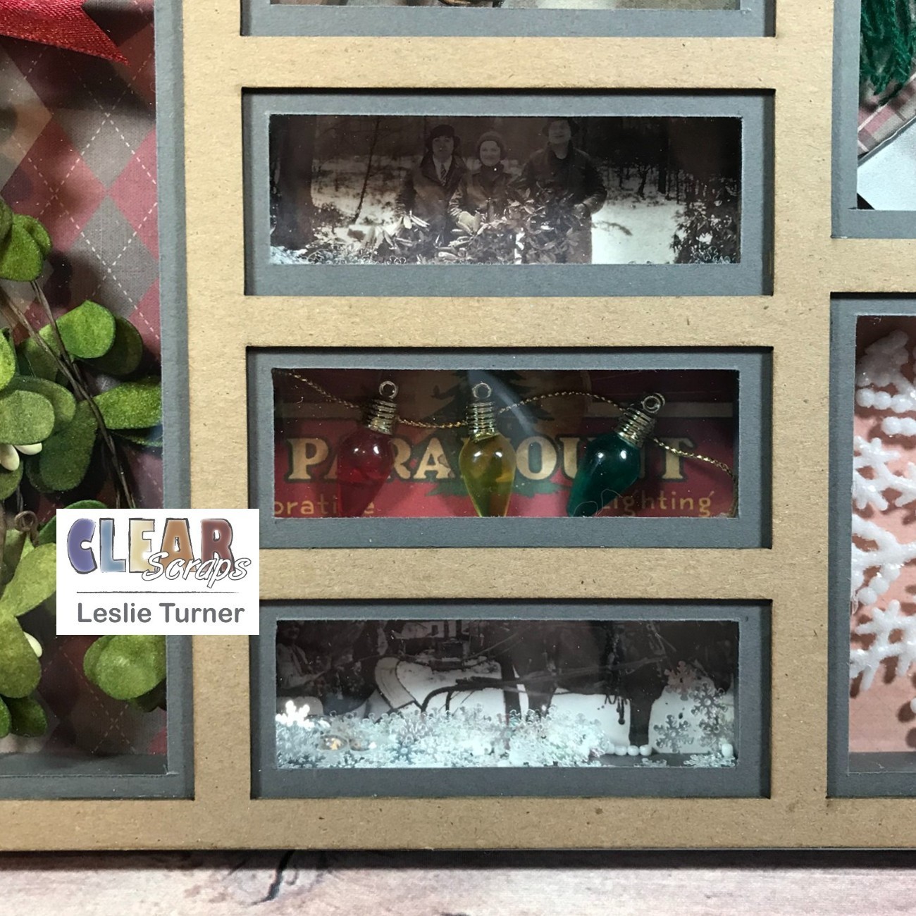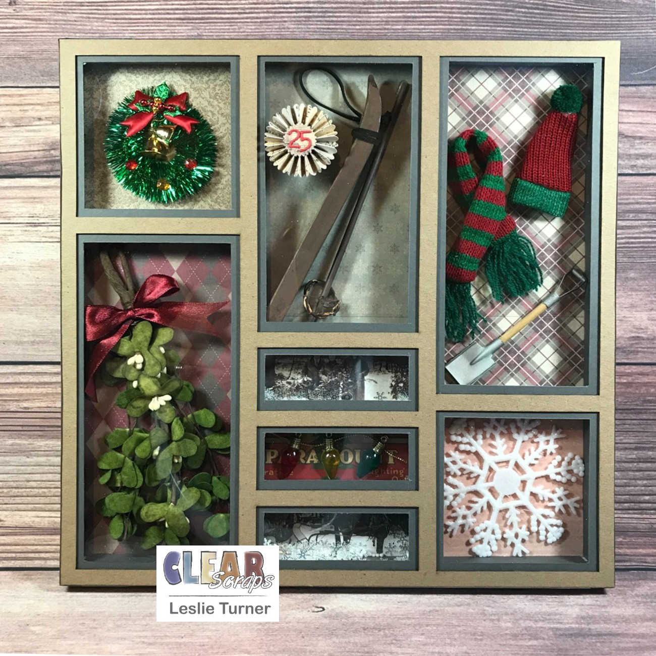 Hi everybody! Leslie here, sharing a fun vintage Christmas shadowbox created from our Small Rectangle Printer Tray Frame! I added several strips of double-sided adhesive foam tape between each of the chipboard layers so the compartments were deep enough to accommodate the vintage Christmas elements. I bought all of these fun vintage items (wreath, mistletoe, wood ski and pole, Christmas lights, scarf and hat, shovel, and snowflake) several years ago along with a different kind of shadowbox, and the shadowbox turned out to be too small, so everything just sat in my stash… until now!