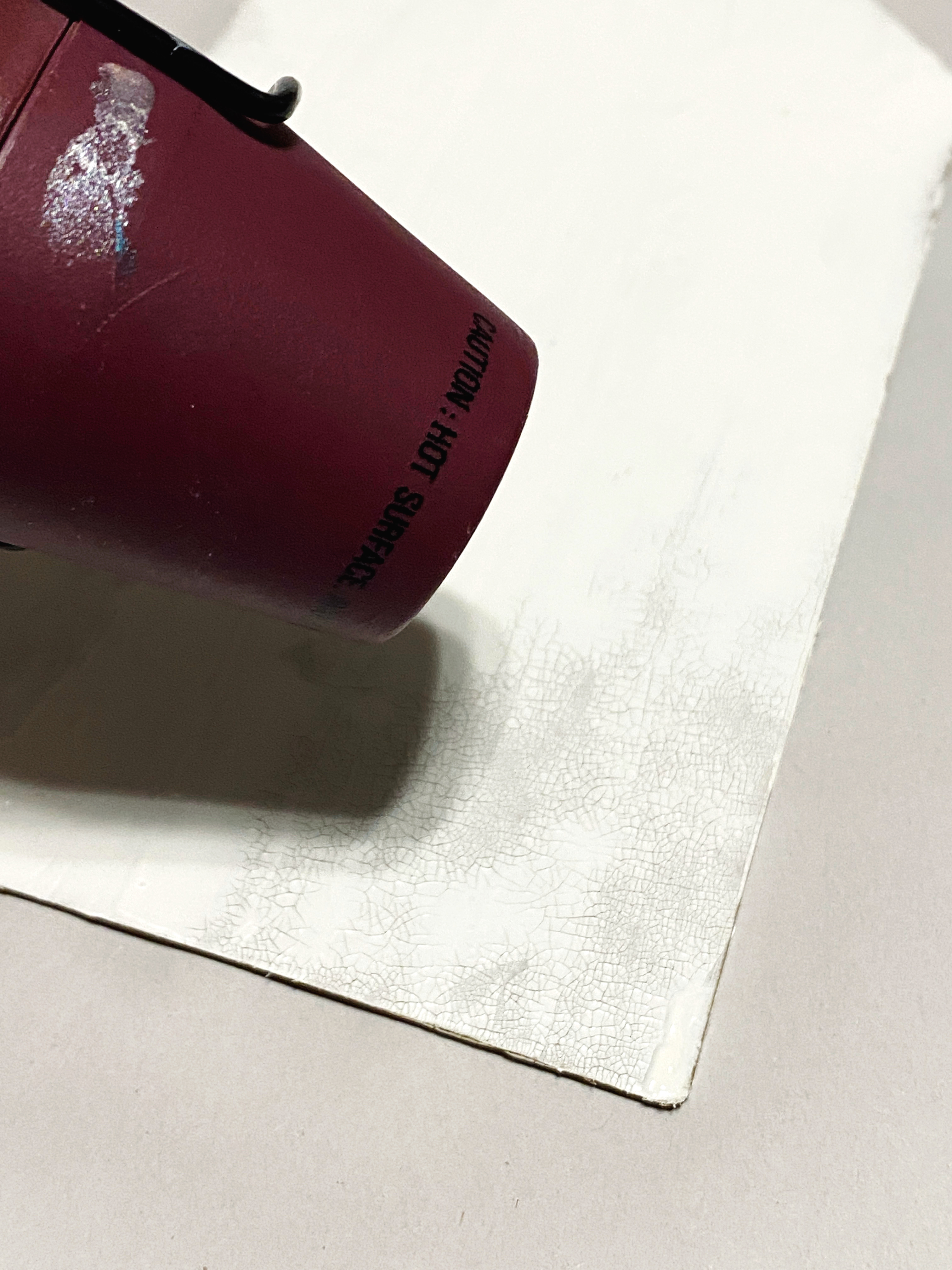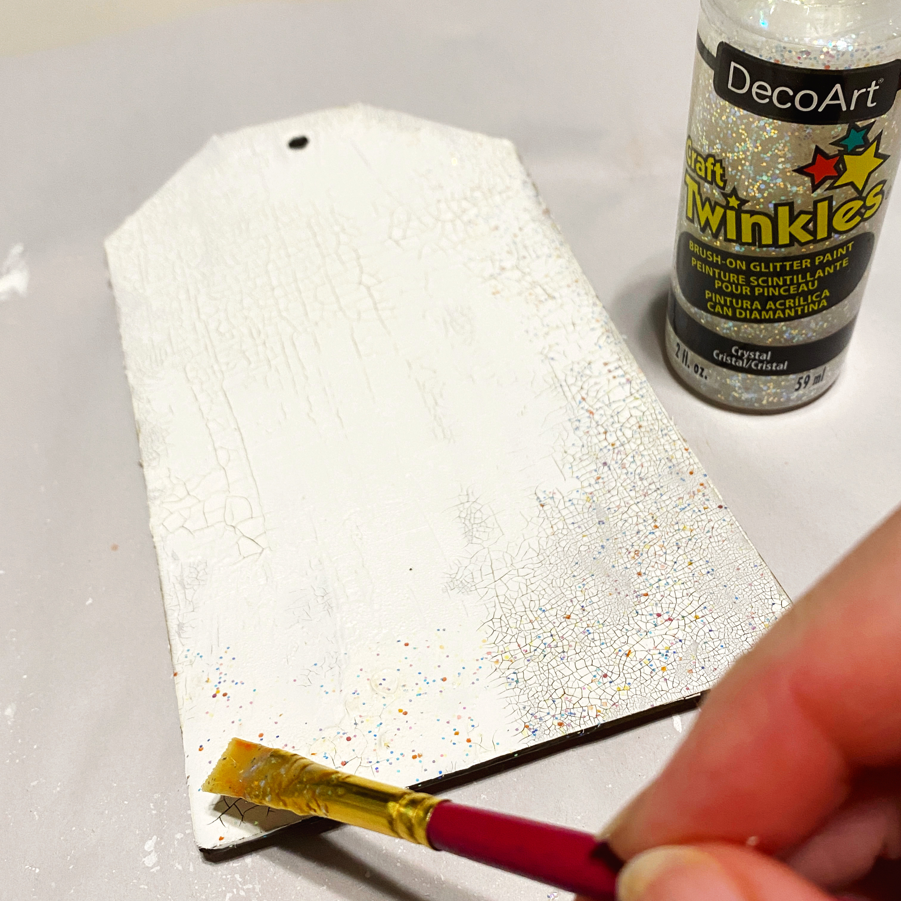 I used one of the chipboard tags from the Chipboard Tag Album as a base. I painted it with a layer of white crackle paste. You can speed up the dry time with a heat gun or just let it air dry. Once the crackle paint was dry, I added a layer of glitter paint around the edges…