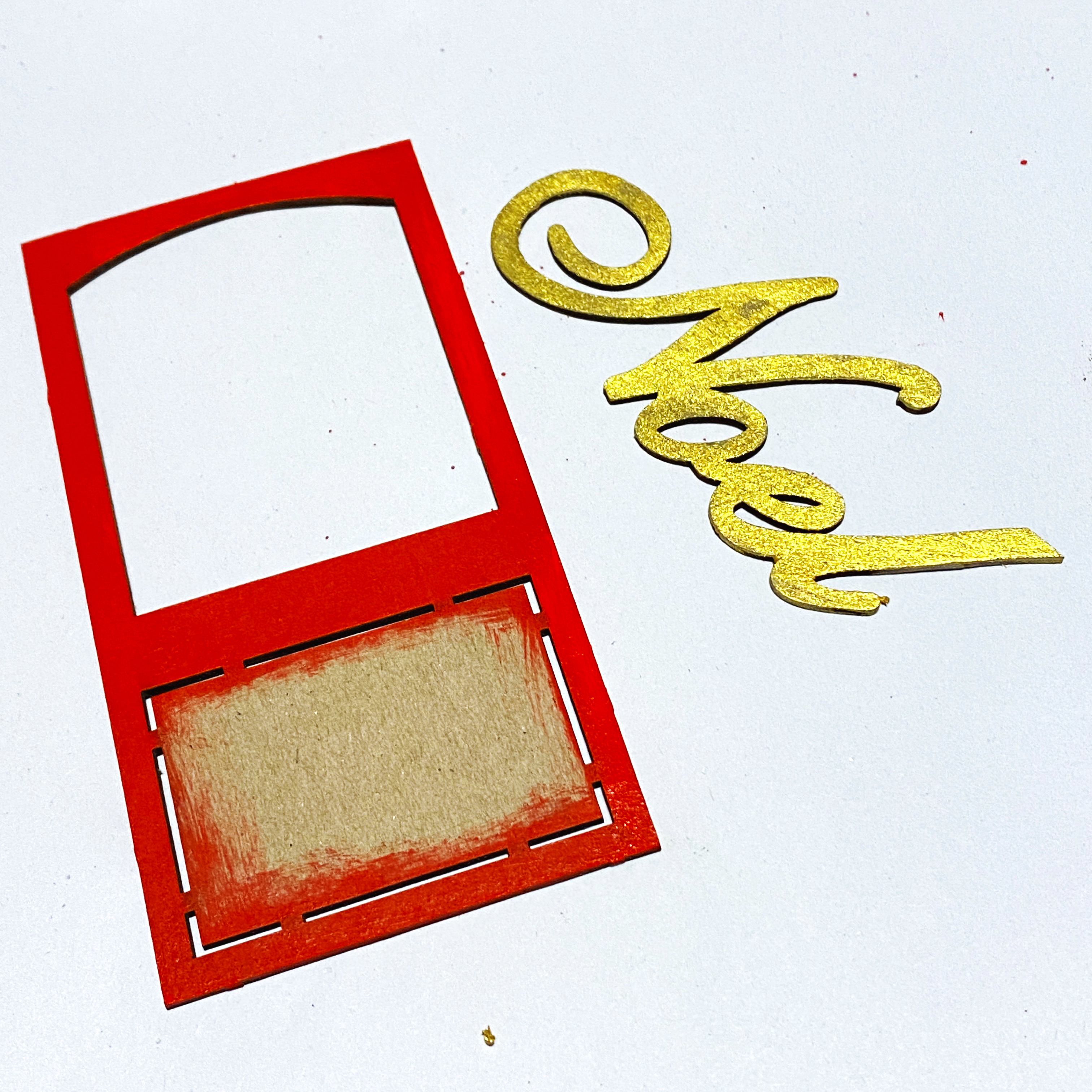 I painted the door red and the Noel Chipboard Word Title gold. I distressed the tag, door and word with brown chalk ink…